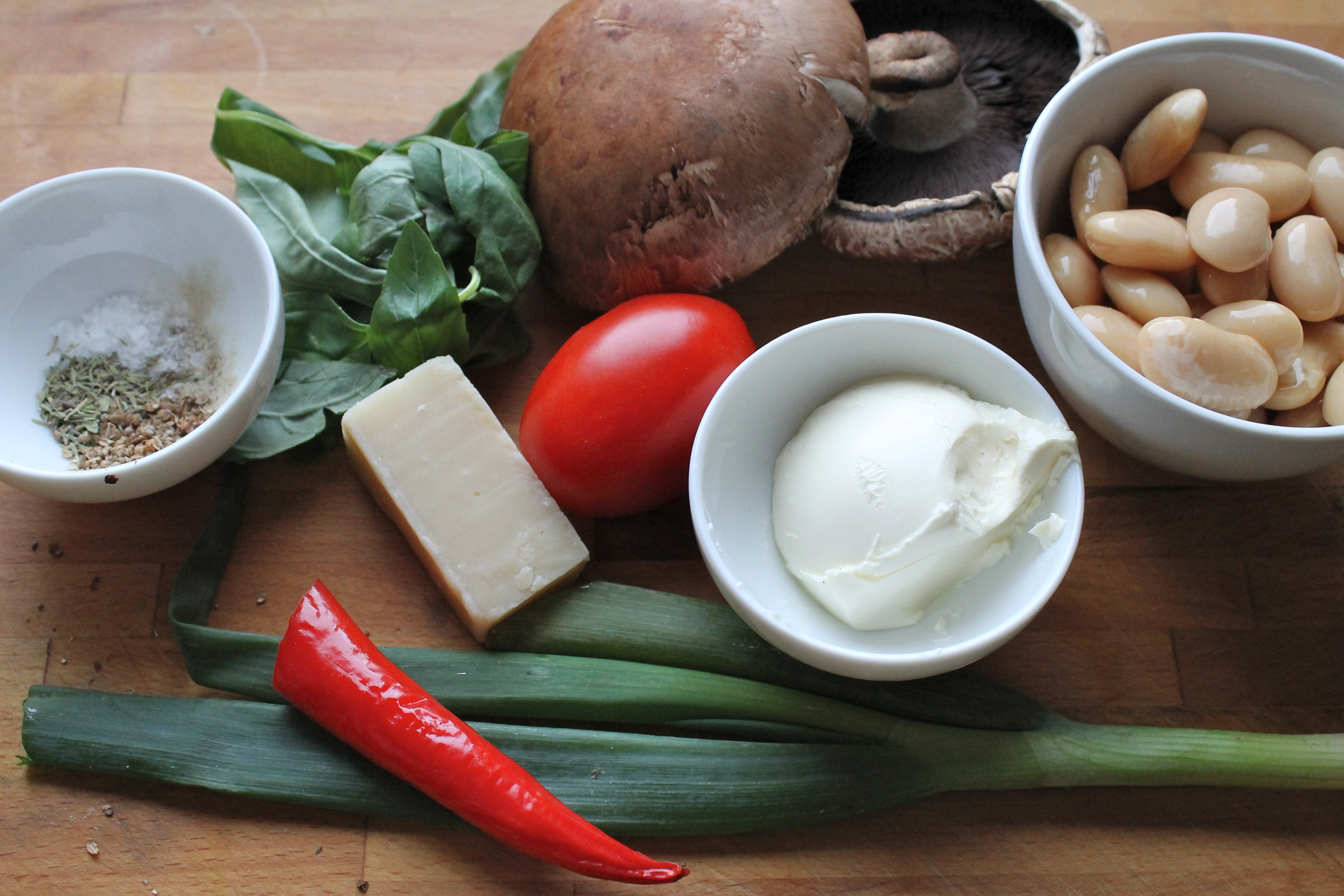 Allavega, ég stillti ofninn á 215°C og náði í sveppina. Í ísskápnum var líka hálf dós af smjörbaunum (afgangur frá því að ég eldaði saltfiskplokkfiskinn) en ég notaði reyndar ekki nema helminginn af þeim helmingi … Og einn vænn vorlaukur, hálft rautt chili-aldin, tvær matskeiðar af hreinum rjómaosti, einn mjög vel þroskaður plómutómatur, biti (svona 30 g) af parmesanosti, slatti af basilíkublöðum, 1/2 tsk af steyttu kóríanderfræi, 1/2 tsk af þurrkuðu timjani, pipar og salt. Og ólífuolía til að pensla.