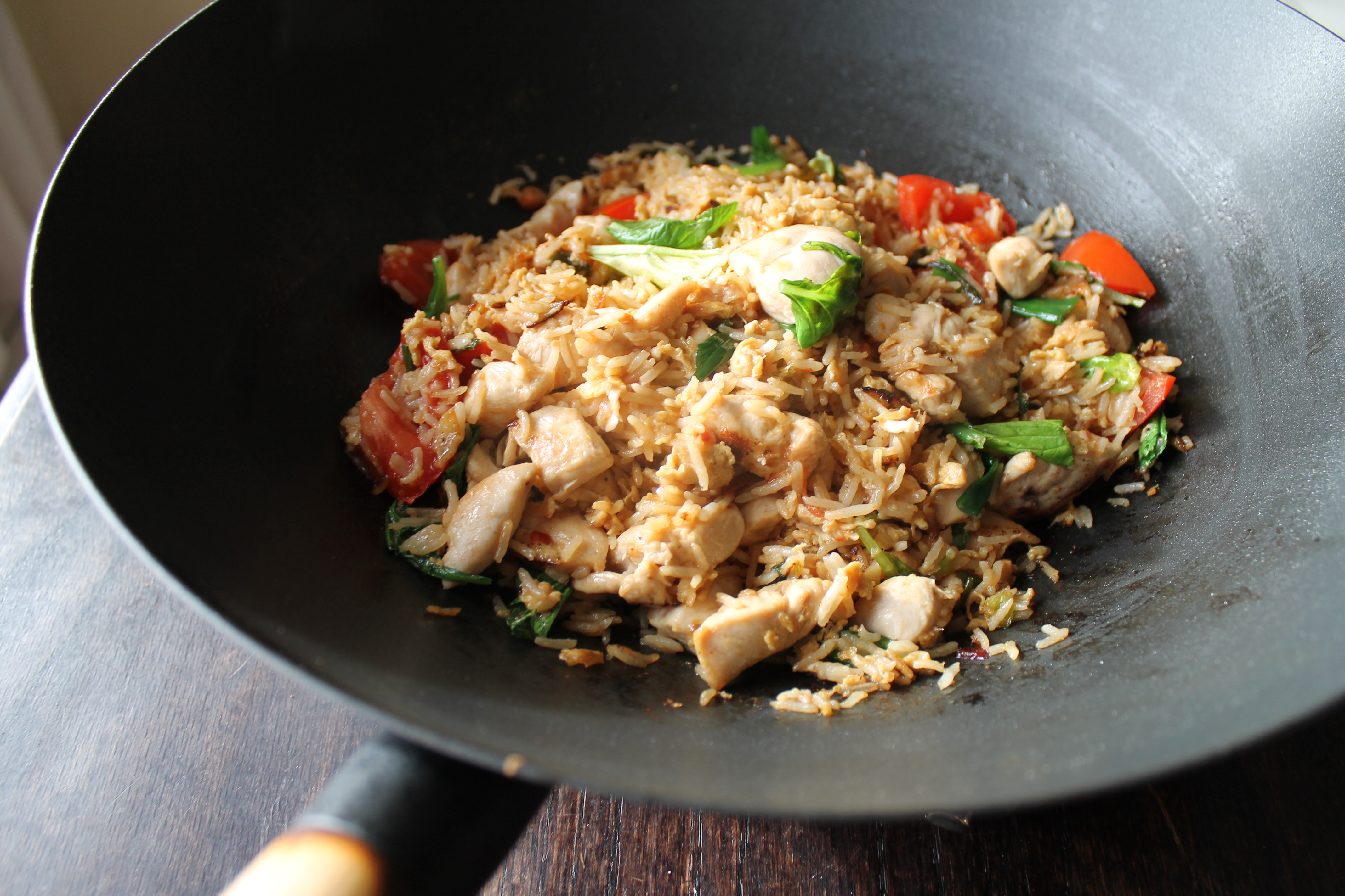 Það var til afgangur af hrísgrjónum frá því í gær. Og þegar maður á dagsgömul hrísgrjón sem eru aðeins farin að þorna, þá liggur eiginlega alveg lóðbeint við að gera úr þeim steikt hrísgrjón því steikt hrísgrjón eiga ekki að vera nýsoðin, þau eiga einmitt að vera köld og farin að þorna aðeins því annars verða þau ekki góð. Og svo höfðu steikt hrísgrjón borist í tal í vinnunni í hádeginu og ég átti smávegis kjúkling sem ég þurfti að koma í lóg. Svo þetta var borðliggjandi og um leið og ég kom inn úr dyrunum náði ég í wokpönnuna og fór að skera niður engifer og hvítlauk og vorlauk og kjúkling.