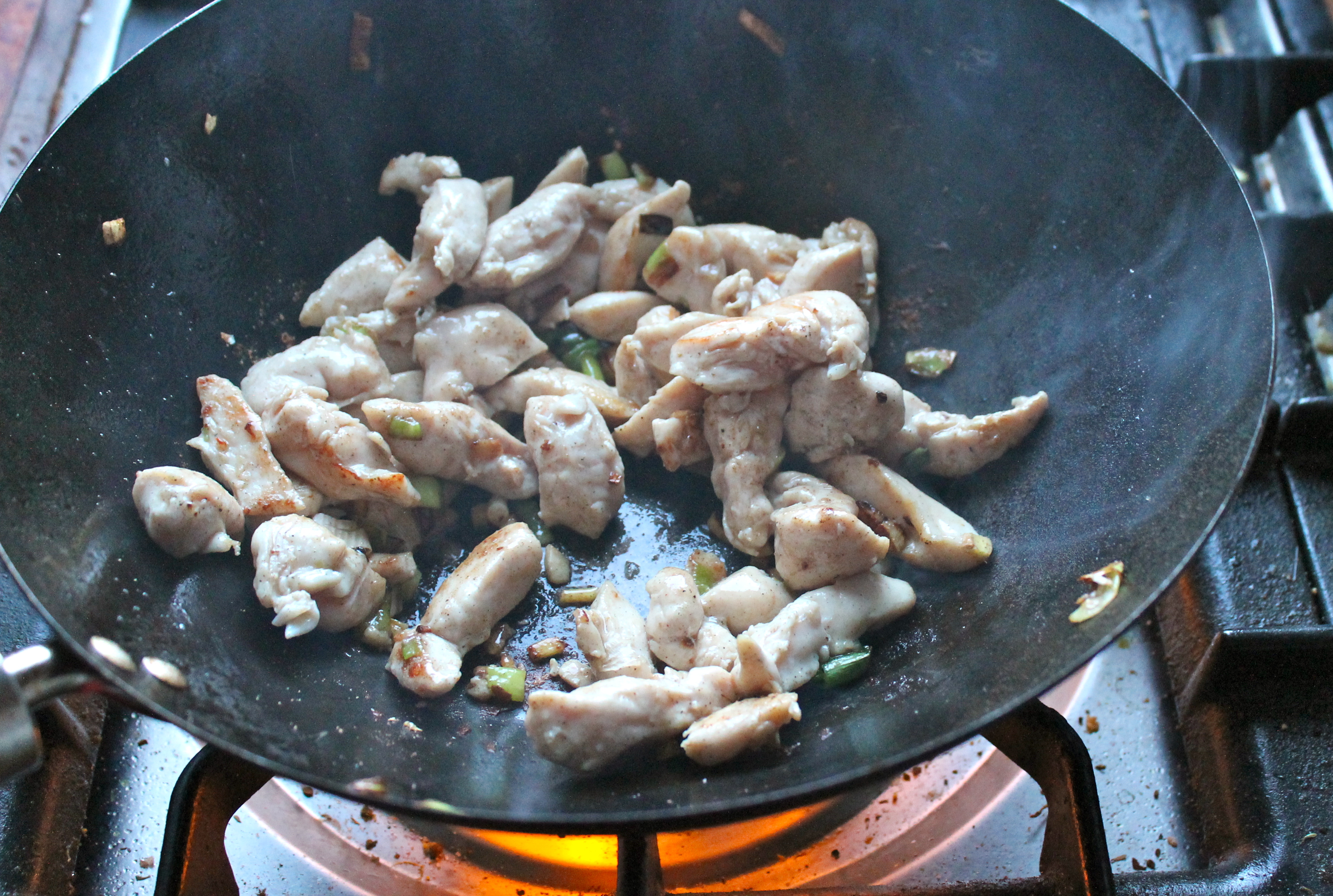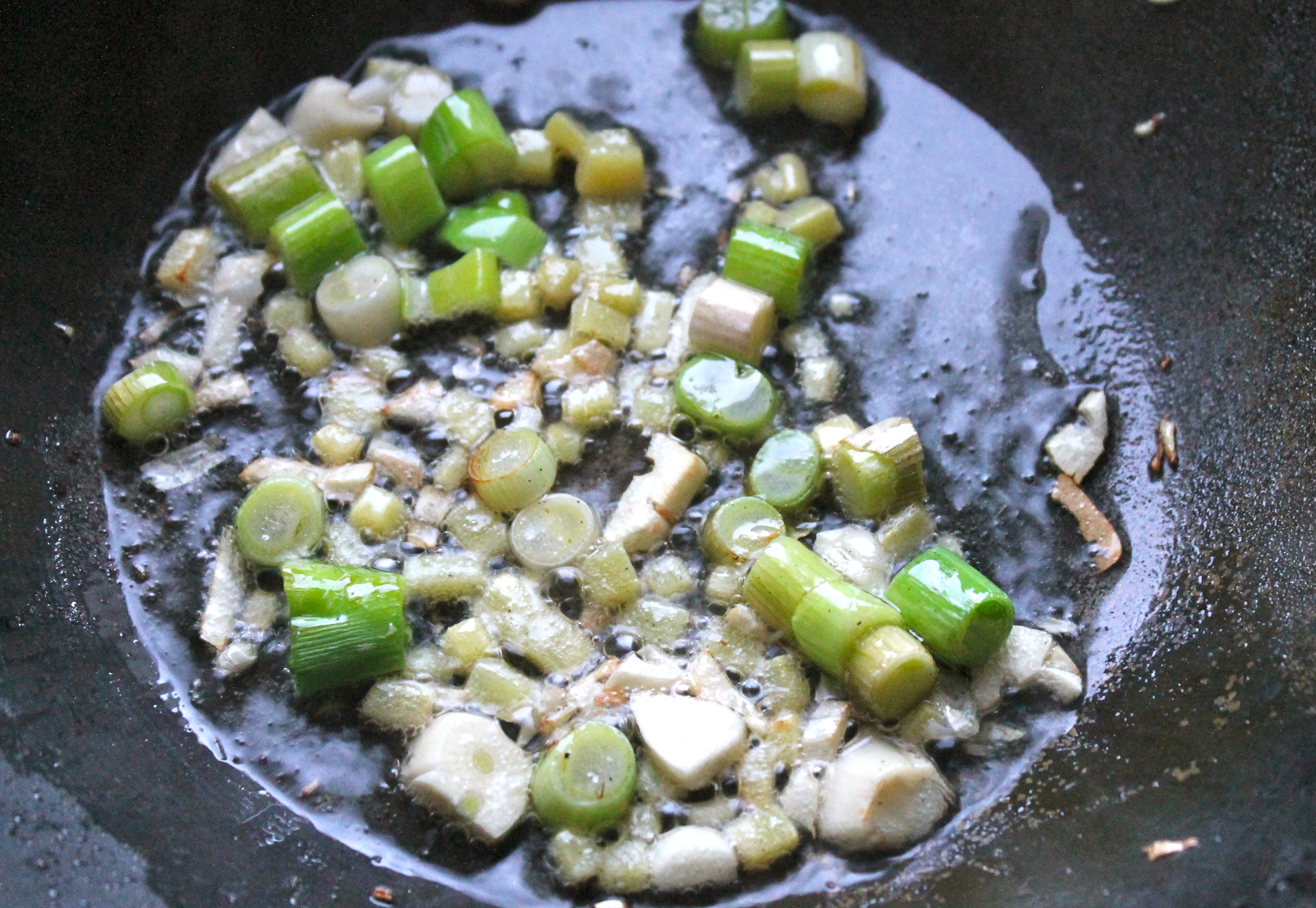 En ég byrjaði á að saxa bita (2-3 cm) af engifer og tvo hvítlauksgeira smátt og skar svo hvíta og ljósgræna hlutann af tveimur vorlaukum niður. Hitaði svo wokpönnuna vel og hellti 1 msk af olíu í hana, hún á að vera (næstum) rjúkandi heit. – Ekki gera þetta í öfugri röð, þ.e. byrja á að kveikja undir wokpönnunni og ætla að skera hráefnið niður á meðan hún hitnar. Það fer illa, ég tala af gamalli reynslu.