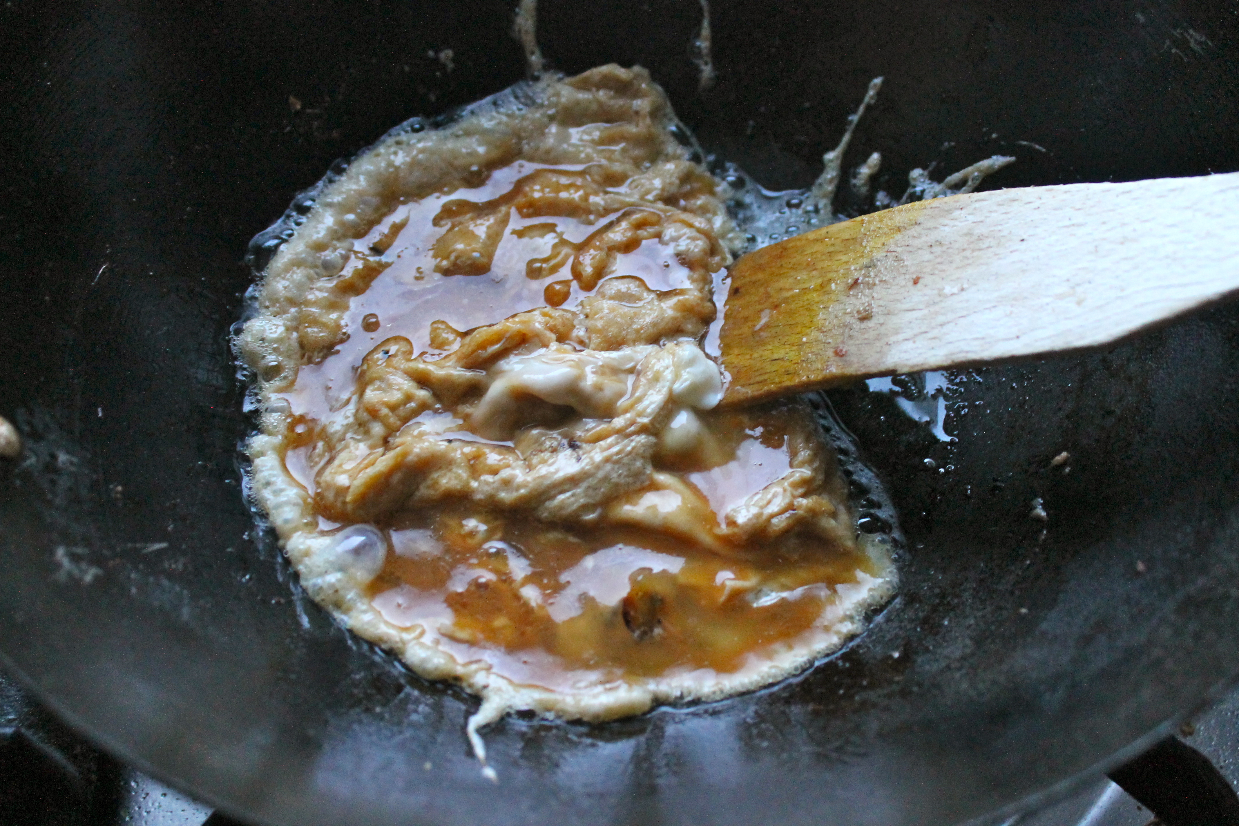 Ég setti 2 msk af olíu í pönnuna og hitaði hana vel, það á næstum að koma reykur – en ekki alveg. Ég var búin að hræra saman 2 egg, 1 tsk af sesamolíu (má sleppa ef hún er ekki til) og 1 tsk af sojasósu og nú hellti ég blöndunni á pönnuna og lækkaði hitann niður í meðalhita.