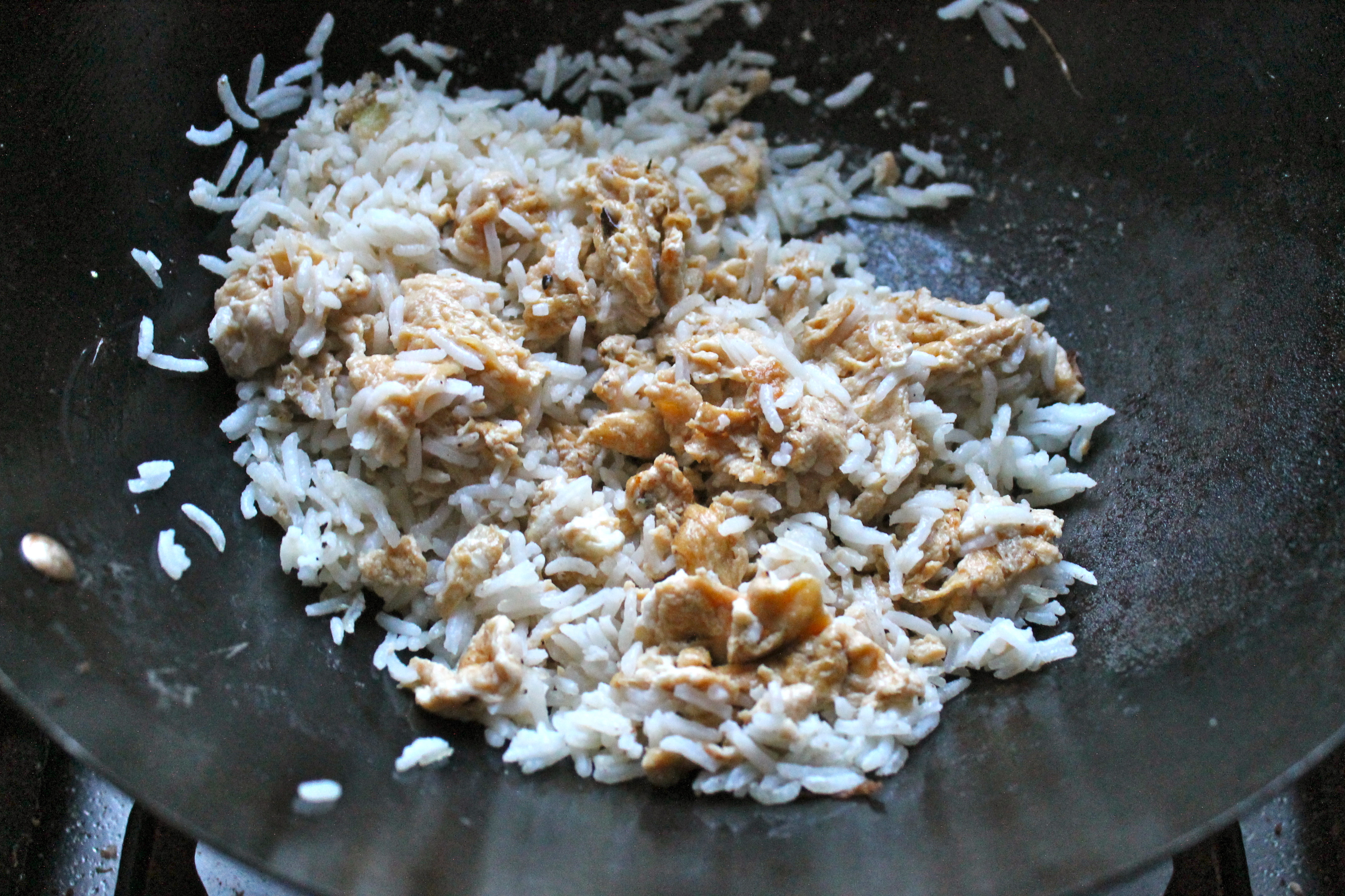 Í sjálfu sér er hægt að nota nánast hvað sem er í steikt hrísgrjón, það eina sem er nauðsynlegt er dagsgömul hrísgrjón (ef maður þarf að nota nýsoðin er um að gera að dreifa vel úr þeim á bökunarplötu eða bakka og láta rjúka vel úr þeim og helst að láta þau kólna alveg), egg og – ja, þá er það eiginlega upptalið, allt annað er smekksatriði. Eða skápsatriði, þ.e. fer eftir hvað maður á í skápunum.