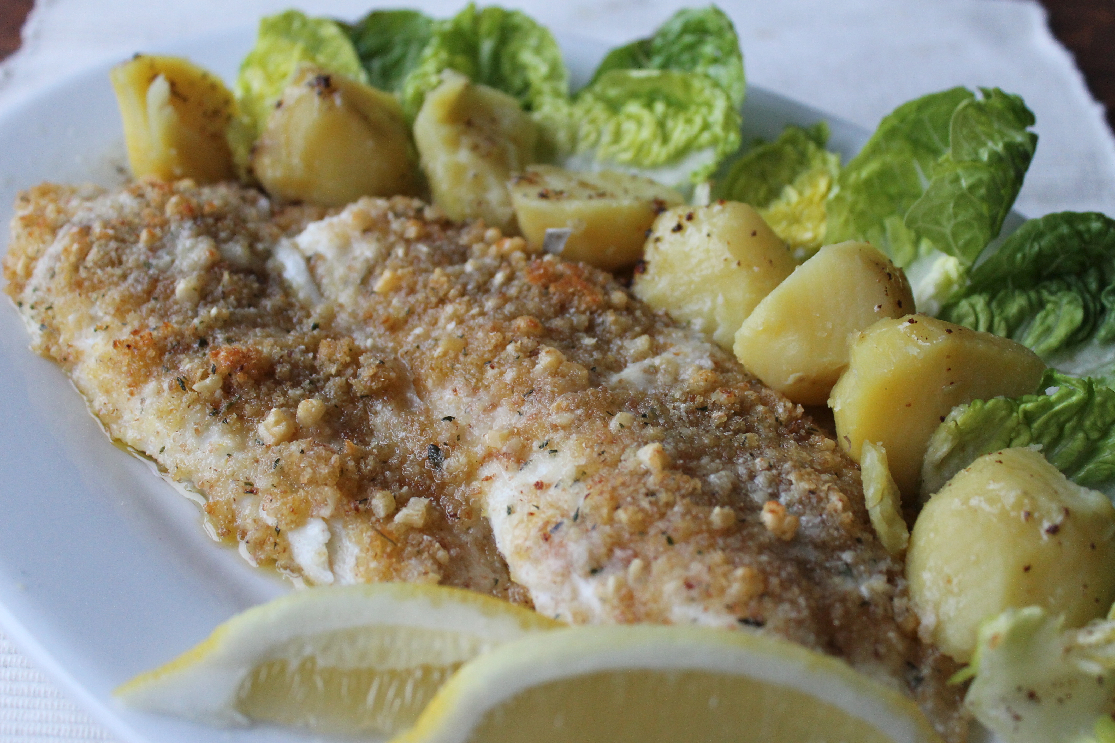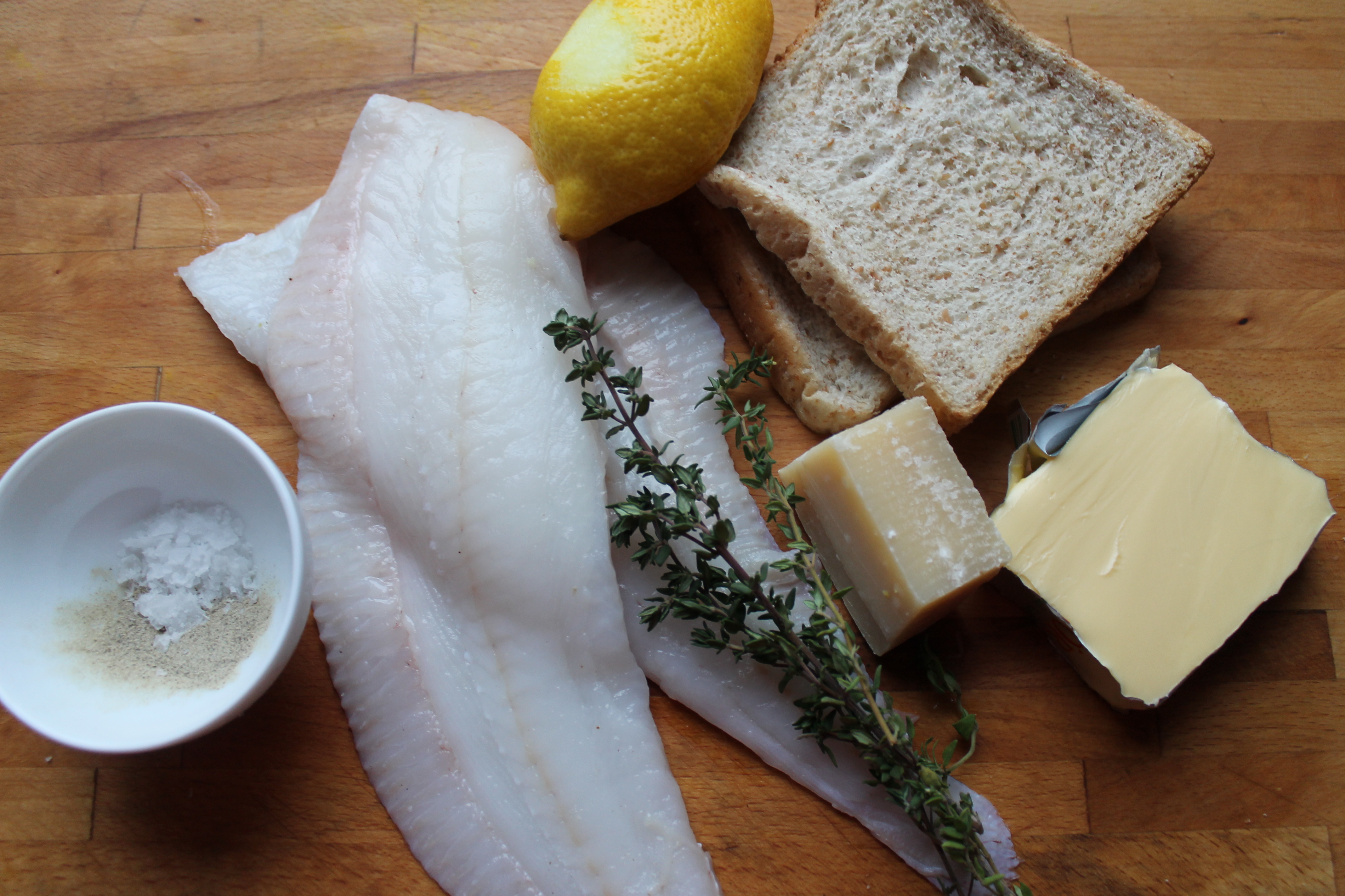 Hér er rauðsprettuflakið, 350-375 g eða svo, sem ég er búin að skera í tvennt. Tvær brauðsneiðar (samlokubrauð úr búð í þetta skipti, ég þurfti að búa til rasp í skyndi í gær og átti ekkert bakað brauð – það var til núna en ég ákvað að nýta samlokubrauðið aftur í rasp fyrst það var til), 40 g smjör, biti af parmesanosti, 2-3 timjangreinar (má sleppa eða nota þurrkað timjan), hálf sítróna, pipar og salt.