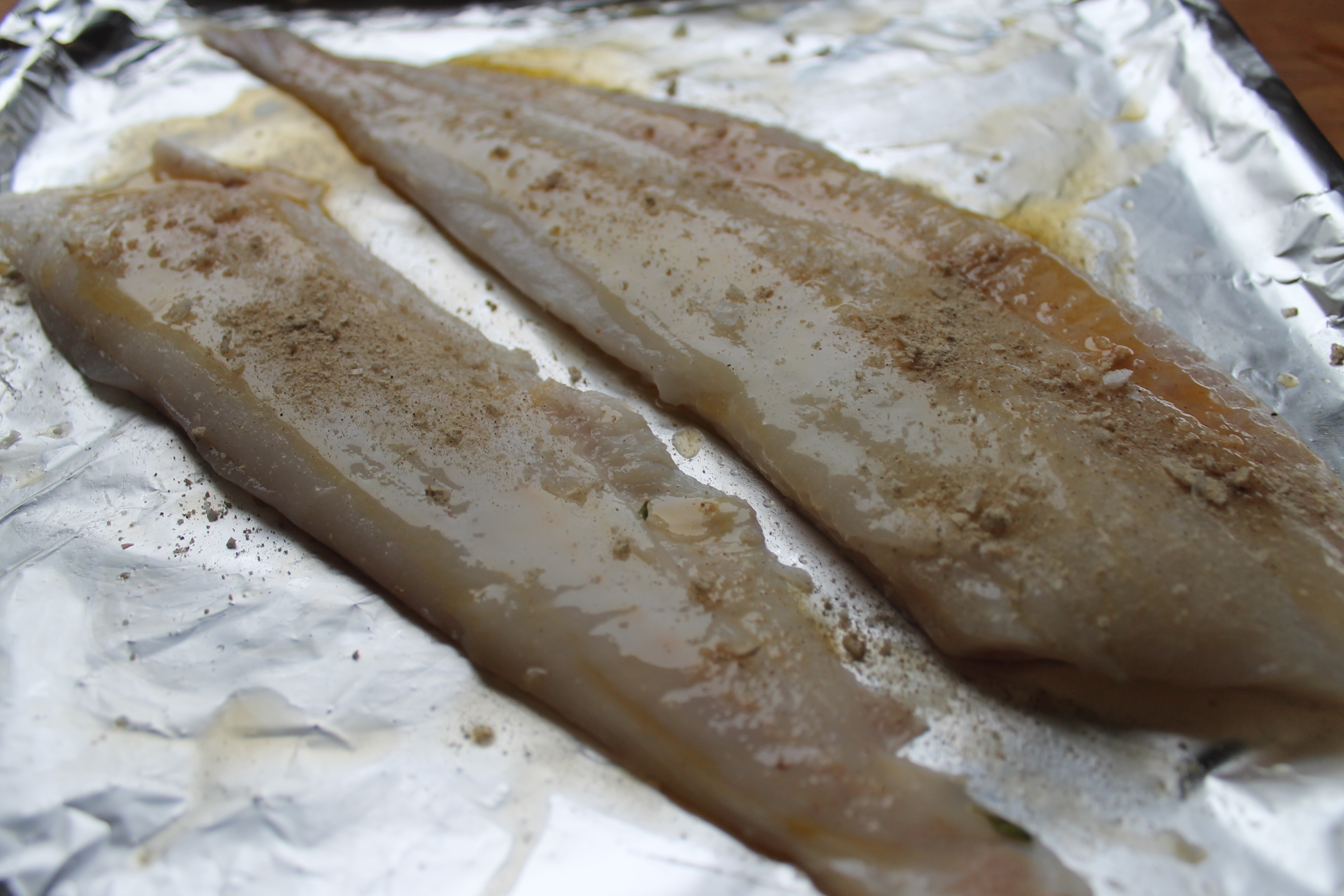 Ég kveikti á ofninum og stillti hann á 200°C. Svo bræddi ég smjörið í kastarholu og klæddi bökunarplötu með álpappír. Penslaði hana með dálitlu smjöri, lagði rauðsprettuna á hana með roðið niður, penslaði með aðeins meira smjöri og kryddaði með pipar og salti.
