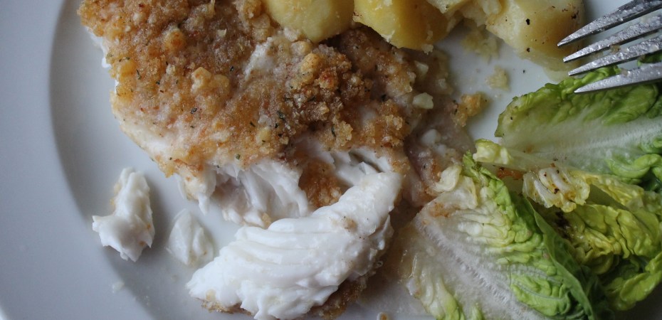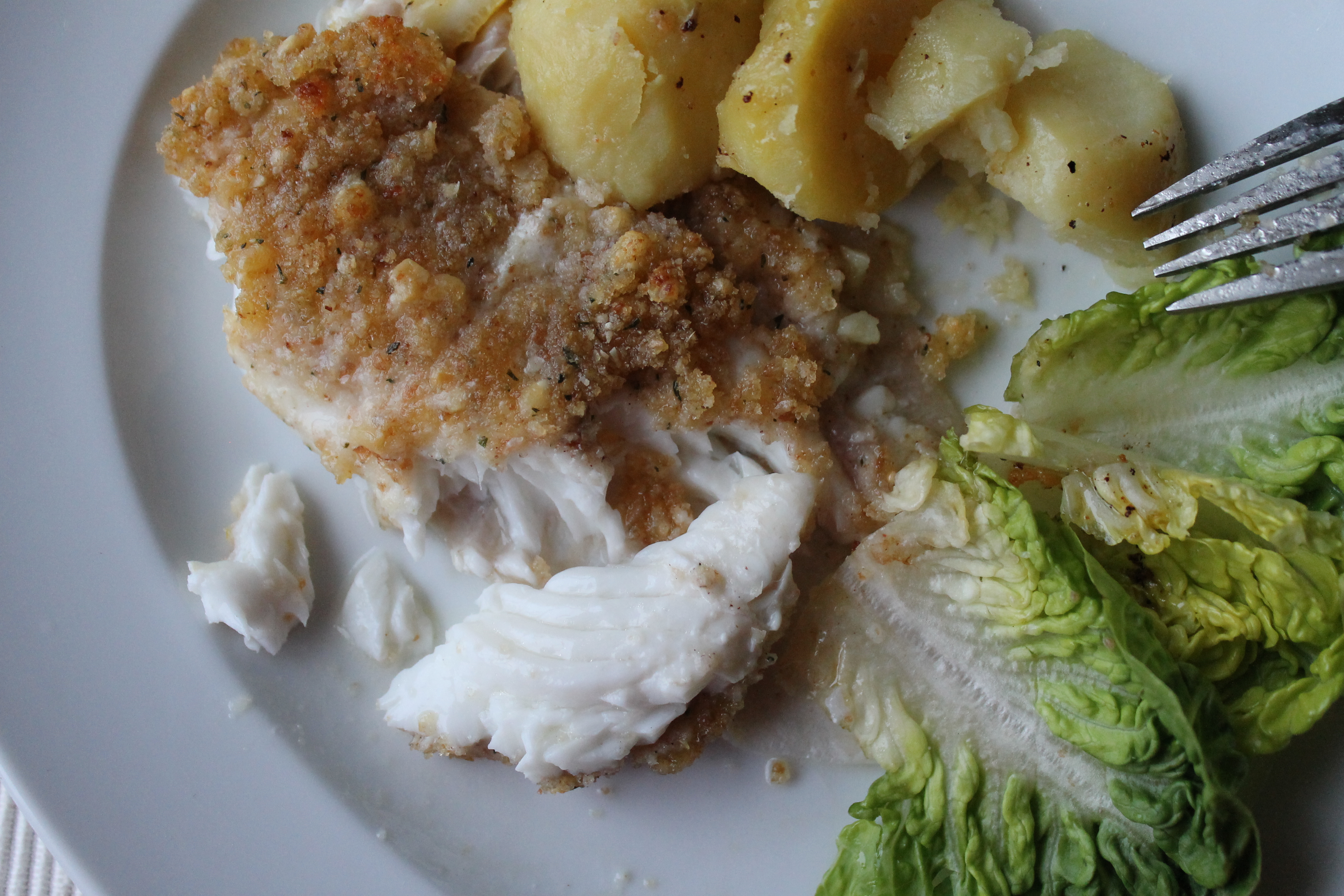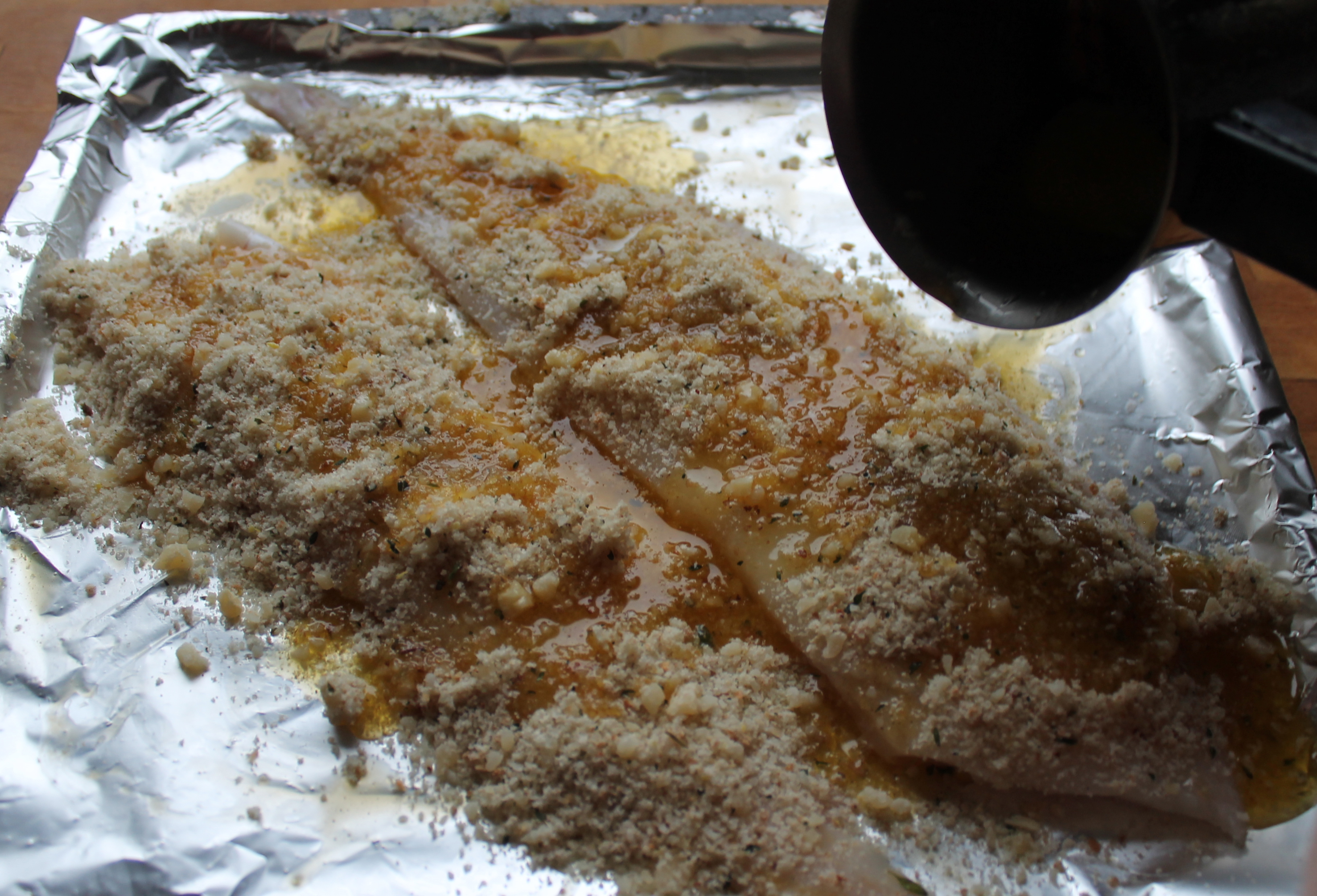 Ég reif brauðið í bita og setti í matvinnsluvélina.Skar parmesanostinn í litla bita, reif börkinn af sítrónunni og plokkaði laufin af timjaninu og setti þetta allt í vélina og lét hana ganga þar til komið var fíngert rasp en þó með dálitlum parmesanmolum (þess vegna skar ég ostinn niður en reif hann ekki, ég vildi hafa molana). Ég stráði góðu lagi af raspi yfir rauðsprettuna en þó var helmingurinn eftir – ég bjó viljandi til meira en ég þurfti því það getur verið gott að eiga rasp. Rasp úr þurru brauði geymist mjög vel í lokuðu íláti en ég geymi þetta í kæli og ekki mjög lengi út af ostinum.