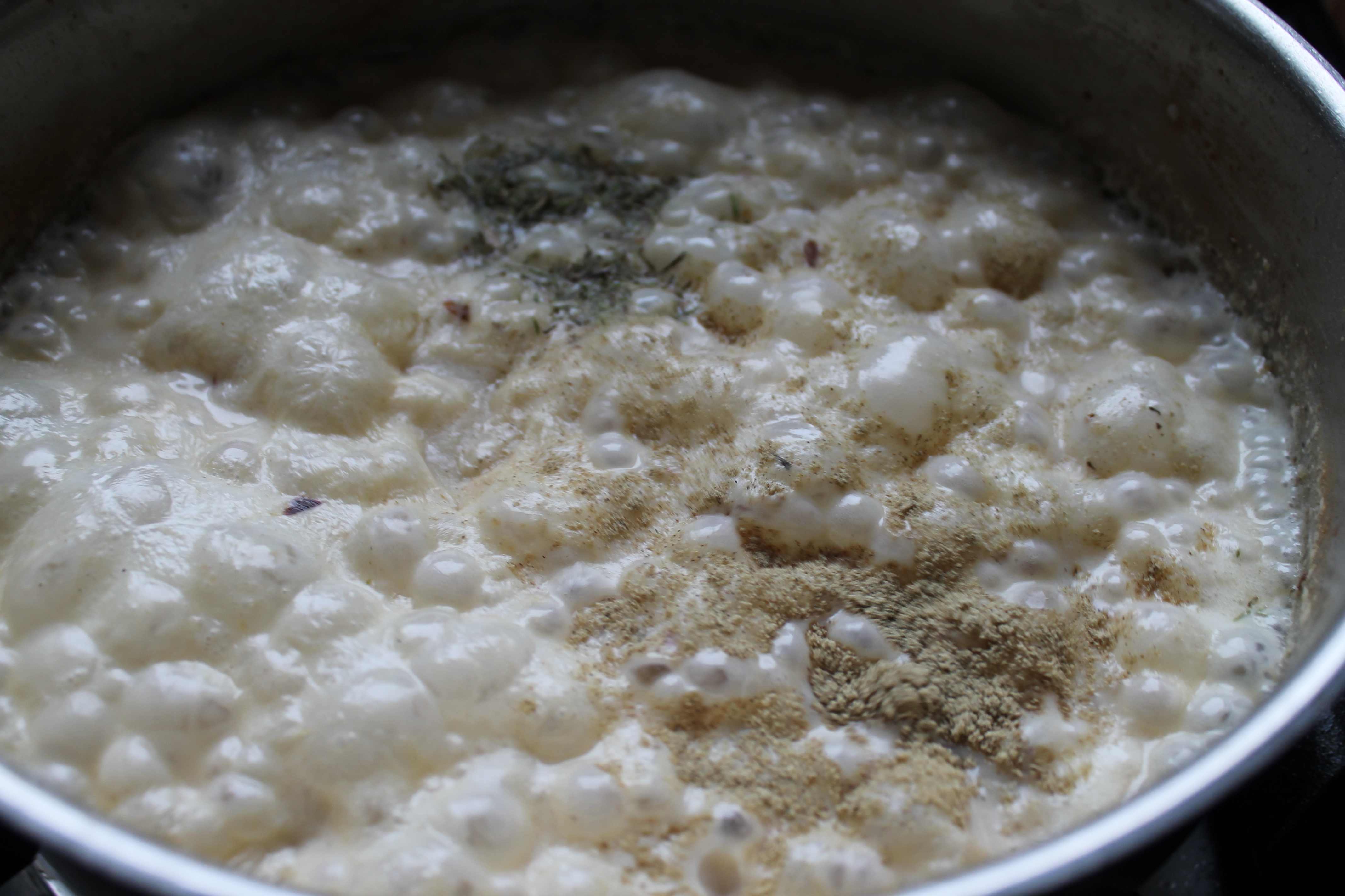 Þegar laukurinn var mjúkur og aðeins farinn að taka lit (en ekki brenna) stráði ég 1 1/2 msk af hveiti yfir, hrærði vel og hellti svo 350 ml af mjólk smátt og smátt út í og bakaði upp jafning.