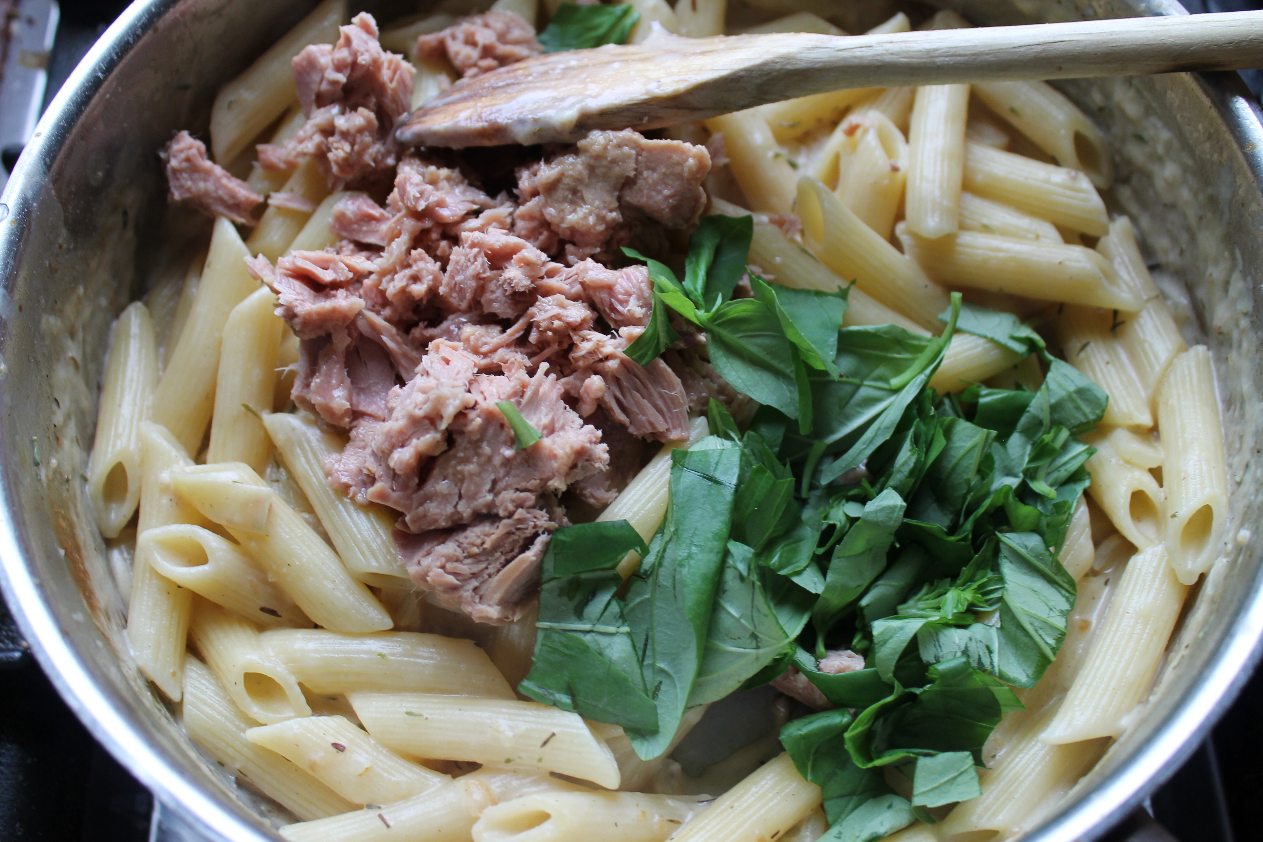 Ég hrærði túnfiskinum og basilíkunni saman við pasta og sósuna. Passaði samt að hræra ekki of mikið því ég vildi ekki að túnfiskurinn færi alveg í mauk, heldur losnaði bara sundur í flögur.