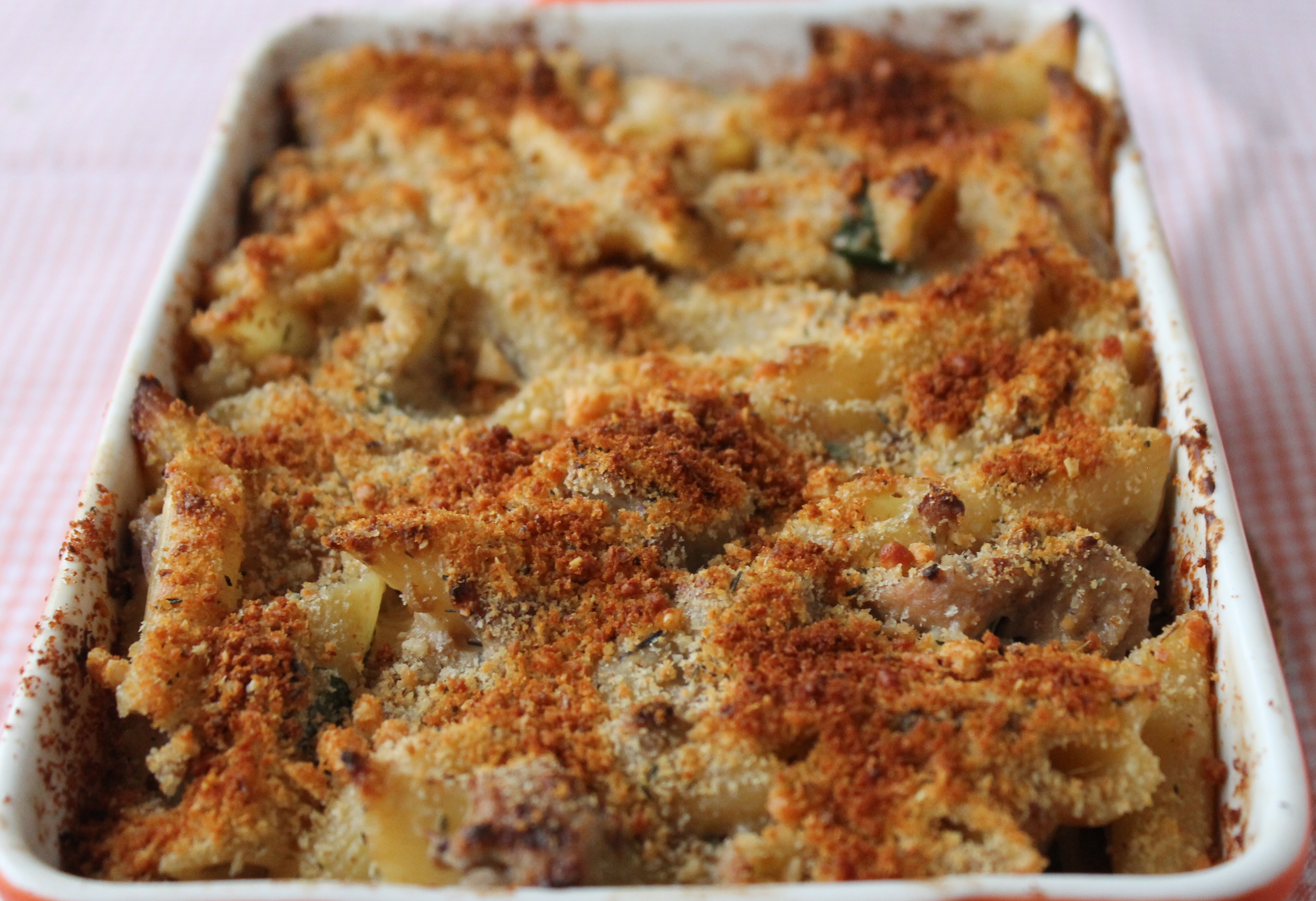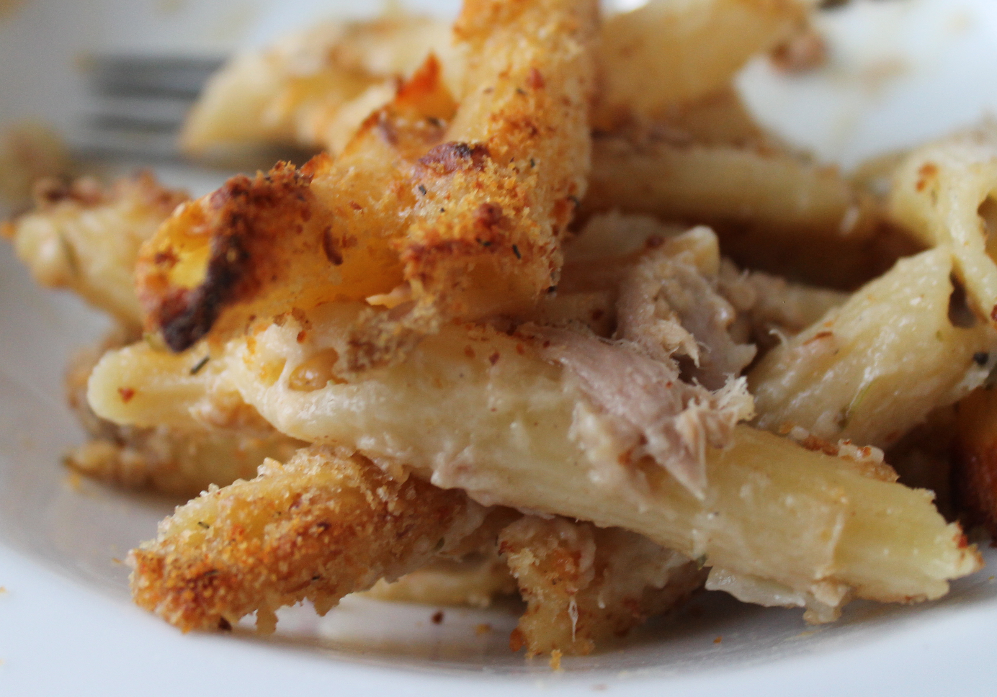 Það var eiginlega ekkert í þessum sautján kílóum sem mig langaði að elda akkúrat þá stundina (og vantaði þó ekki girnilegt hráefni þarna, neinei) en ég mundi að ég átti túnfiskdós í skápnum. Var fyrst að hugsa um að gera bara túnfisksalat en það er nú vetur og það kallar meira á eitthvað annað. Og þegar ég skoðaði betur í skápinn rak ég augun í poka með slatta af penne rigate og þá vissi ég hvað ég ætlaði að gera. Einfaldan og ódýran notalegheitamat, ofnbakað túnfiskpasta.