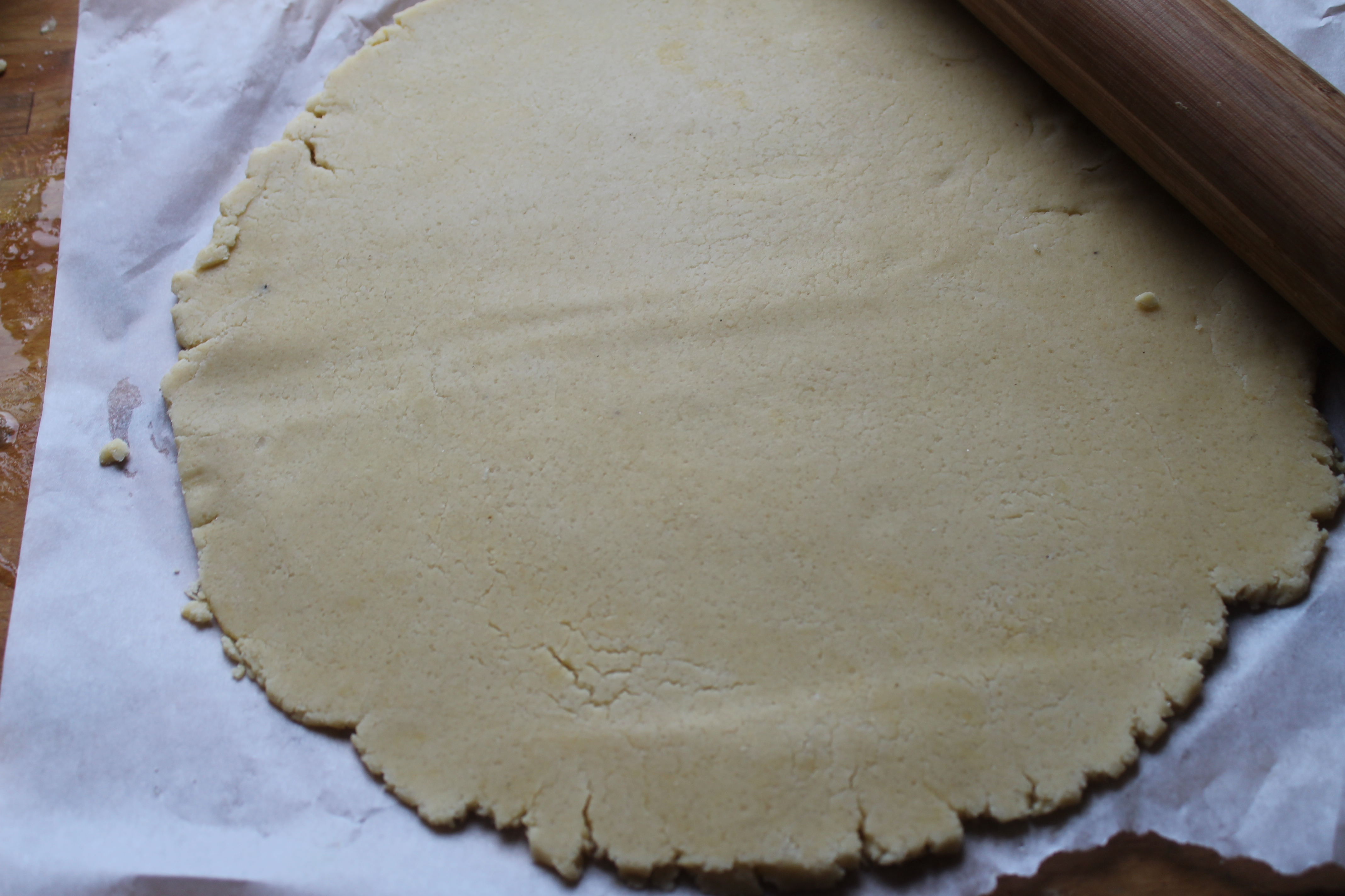 Svo hnoðaði ég deigið í kúlu og flatti hana dálítið út á milli lófanna. Eiginlega hefði ég svo átt að stinga henni í kæli í svona hálftíma en hey, mig langaði í þessa böku sem fyrst … svo að ég tók bökunarpappírsörk, setti deigið á hana og flatti það út, ekkert rosalega þunnt, í hring. Eða nokkurn veginn hring. Svo renndi ég örkinni yfir á bökunarplötu. Ef þetta er gert svona þarf ekkert að vesenast með að flytja deigið, þá brotnar það hvort eð er allt í mola.