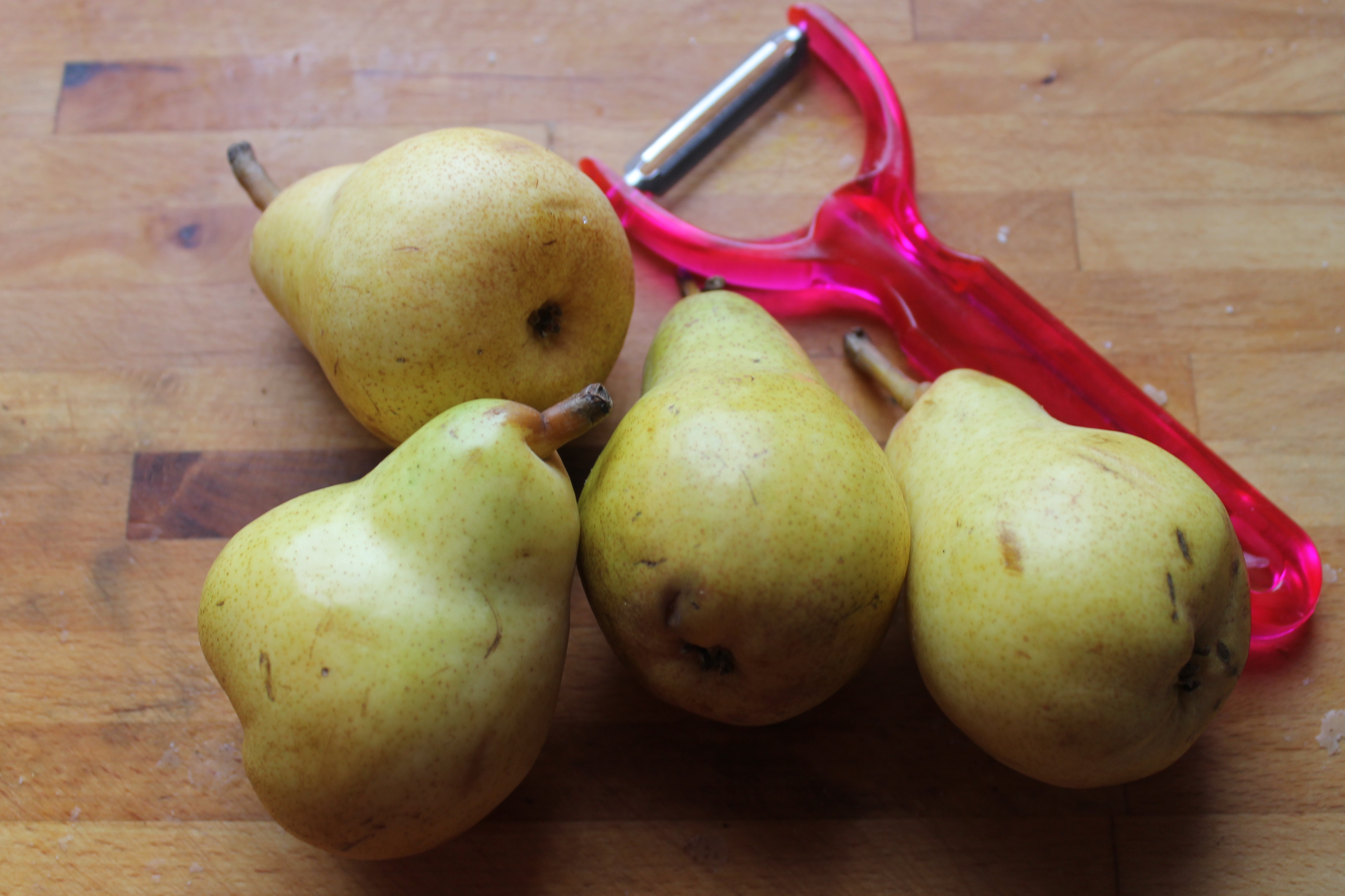 Næst tók ég perurnar – byrjaði með fjórar en áttaði mig svo á að þær voru svo litlar að meira þyrfti til svo ég bætti við tveimur – flysjaði þær og skar svo í sundur í miðju og fjarlægði stilkana.