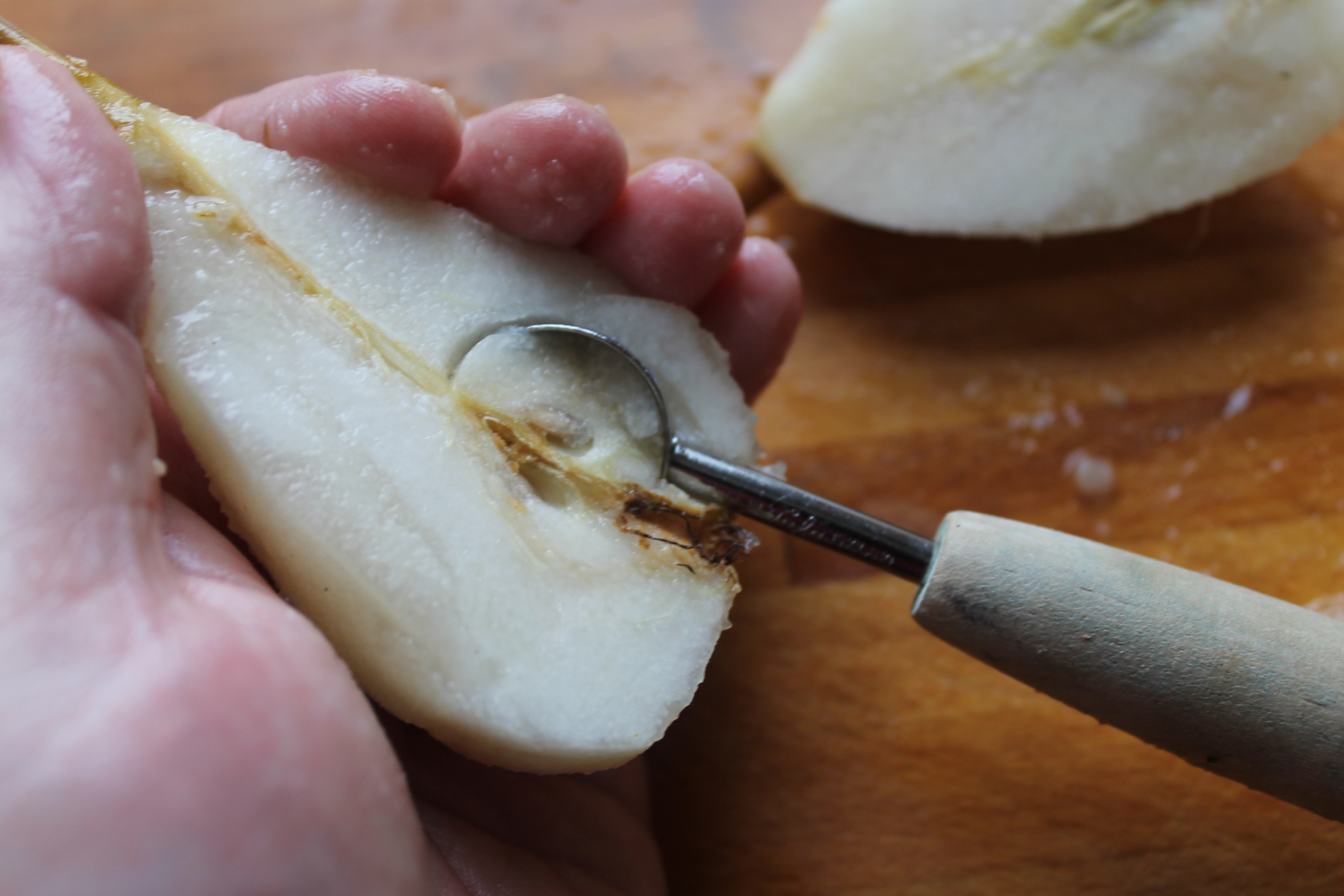 Svo stakk ég kjarnann úr perunum með kúlujárni (það má líka nota teskeið eða bara hnífsodd) og skar hvern peruhelming um sig í fjóra bita.