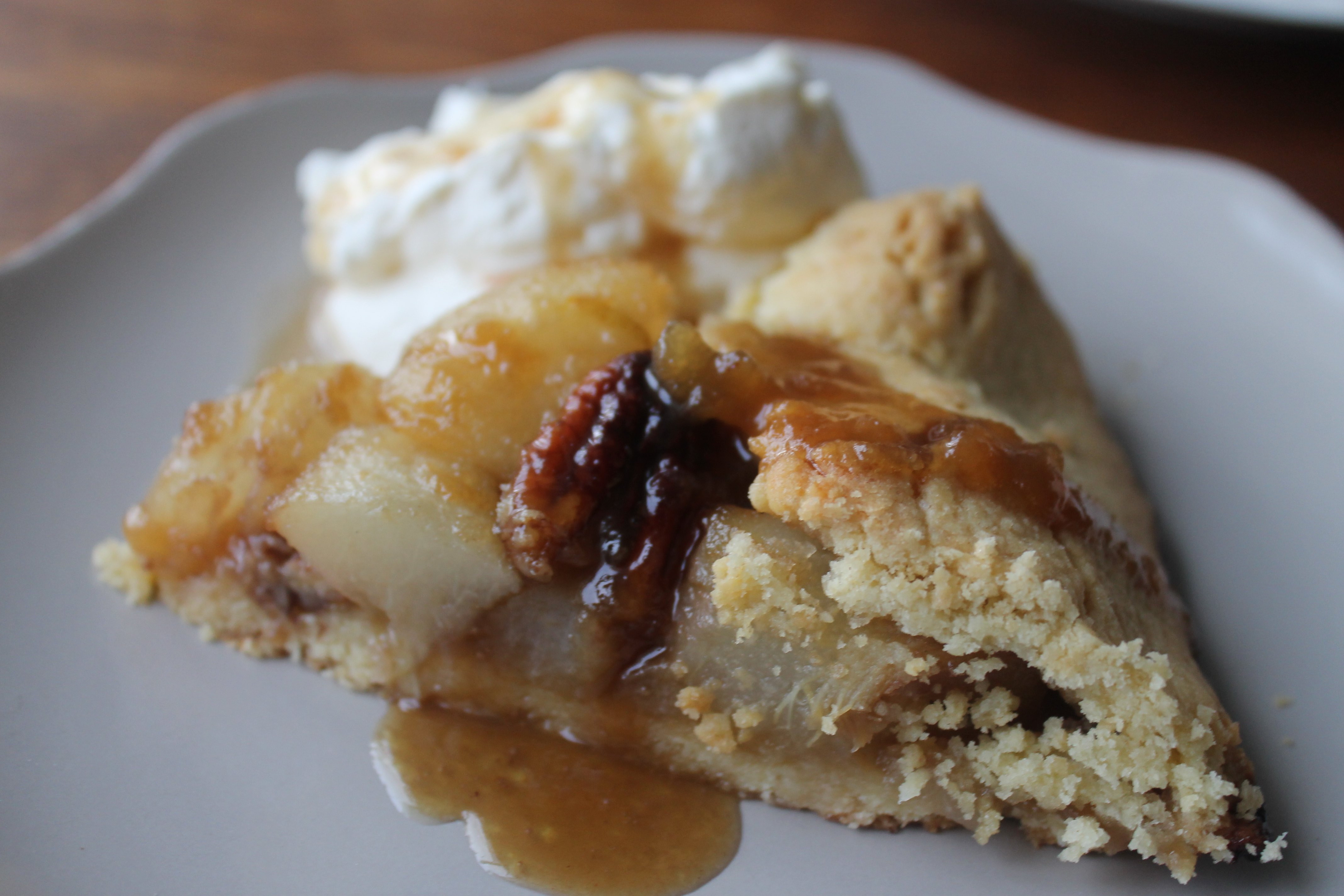 Ég færði svo perurnar og hneturnar yfir á deigið (miðjuna á því) með gataspaða en hellti karamellusósunni í skál.