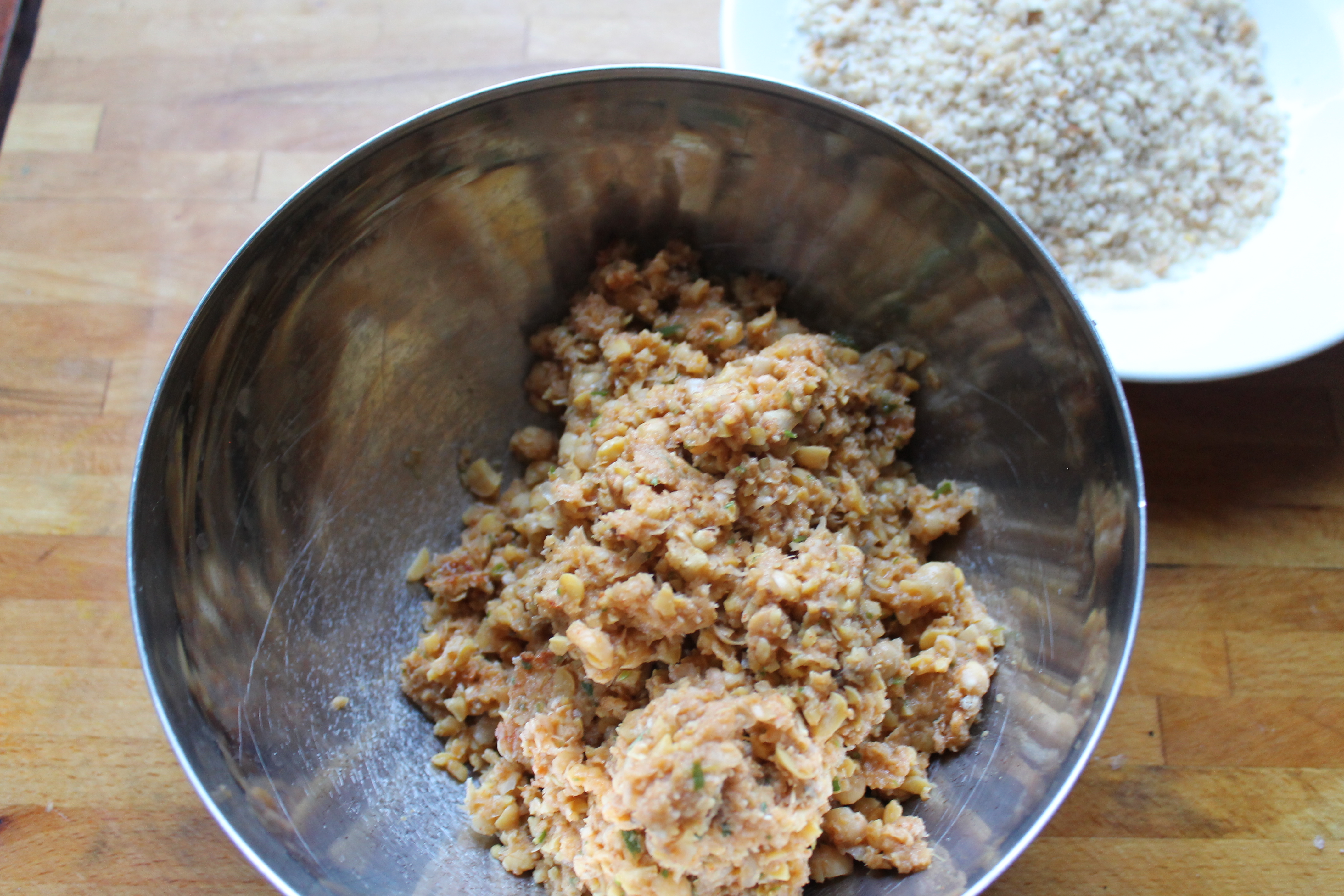Svona var þetta, grófgert mauk, ekki með heilum baunum (nema kannski einni og einni) en greinilegum bauna,,bitum“. Ég setti afganginn af brauðmylsnunni á disk og svo mótaði ég kringlóttar bollur úr maukinu og velti þeim upp úr brauðmylsnunni. Maukið var frekar blautt og það flaug að mér að blanda meiri brauðmylsnu saman við til að fá það þéttara, ég var svolítið smeyk um að bollurnar dyttu í sundur við steikinguna, en það gerðist ekki og þær voru alveg passlegar. Þetta urðu 15-16 bollur.