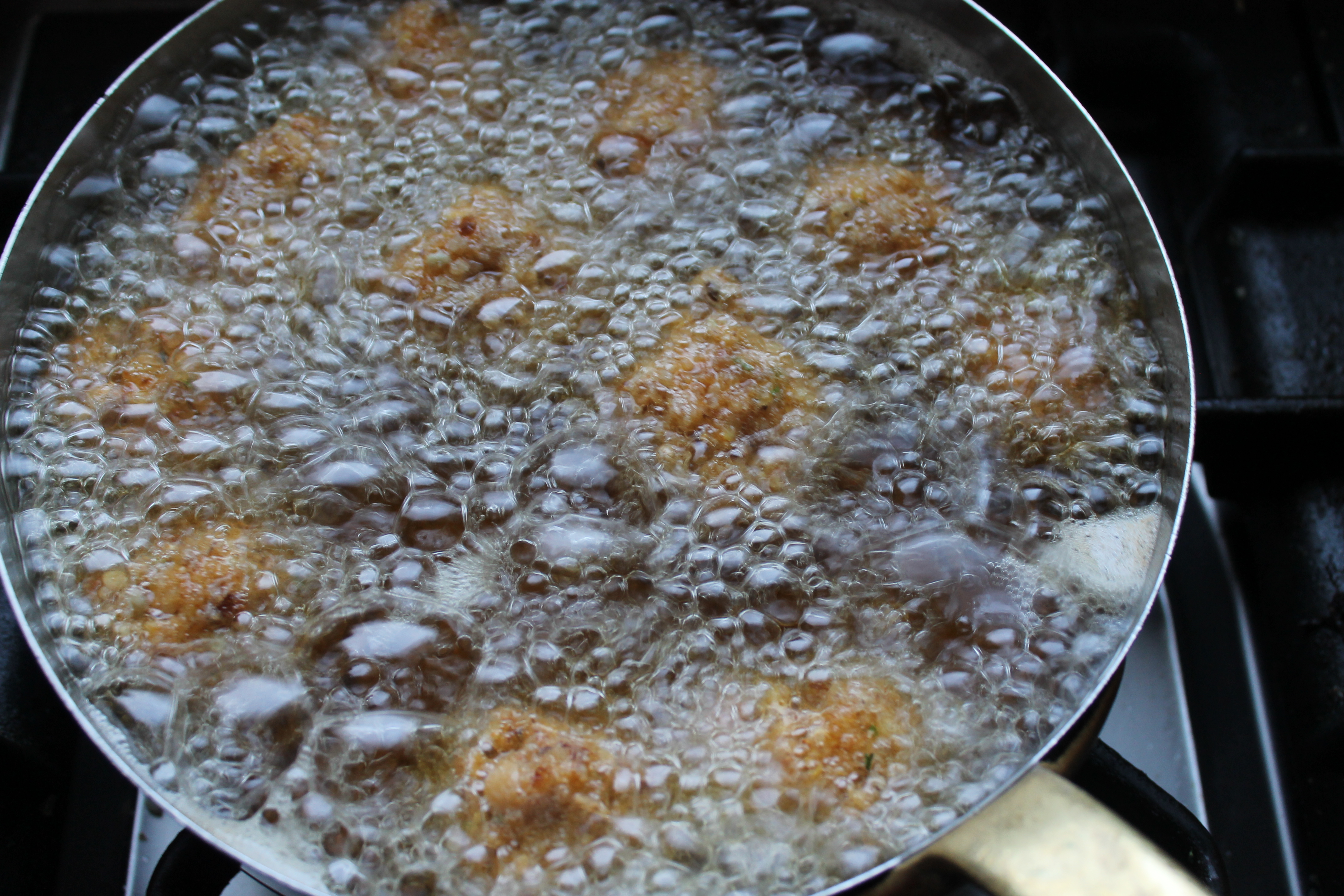 Ég hitaði svo olíu í potti þar til hún var 180°C heit og setti þá bollurnar út í og steikti þær í 3-4 mínútur; sneri þeim einu sinni. Steikti þær í tveimur skömmtum, það borgar sig ekki að setja of mikið í pottinn í einu.