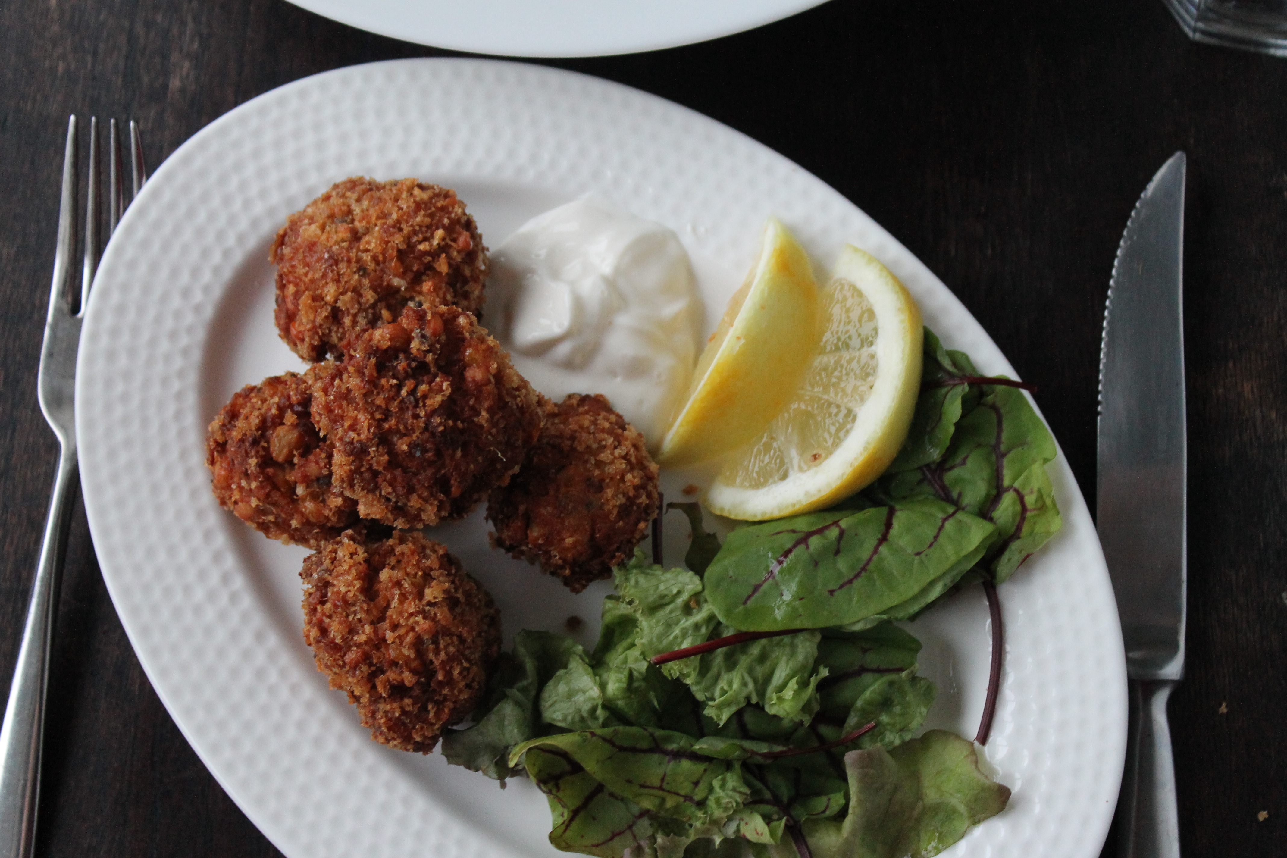 Það þarf ekkert mikið með svona bollum – ég átti ekki pítubrauð sem er jú gjarna með falafel og lét salat og sítrónubáta nægja. Og létta sósu úr grískri jógúrt sem ég hrærði með svolitlu köldu vatni, pipar og salti.