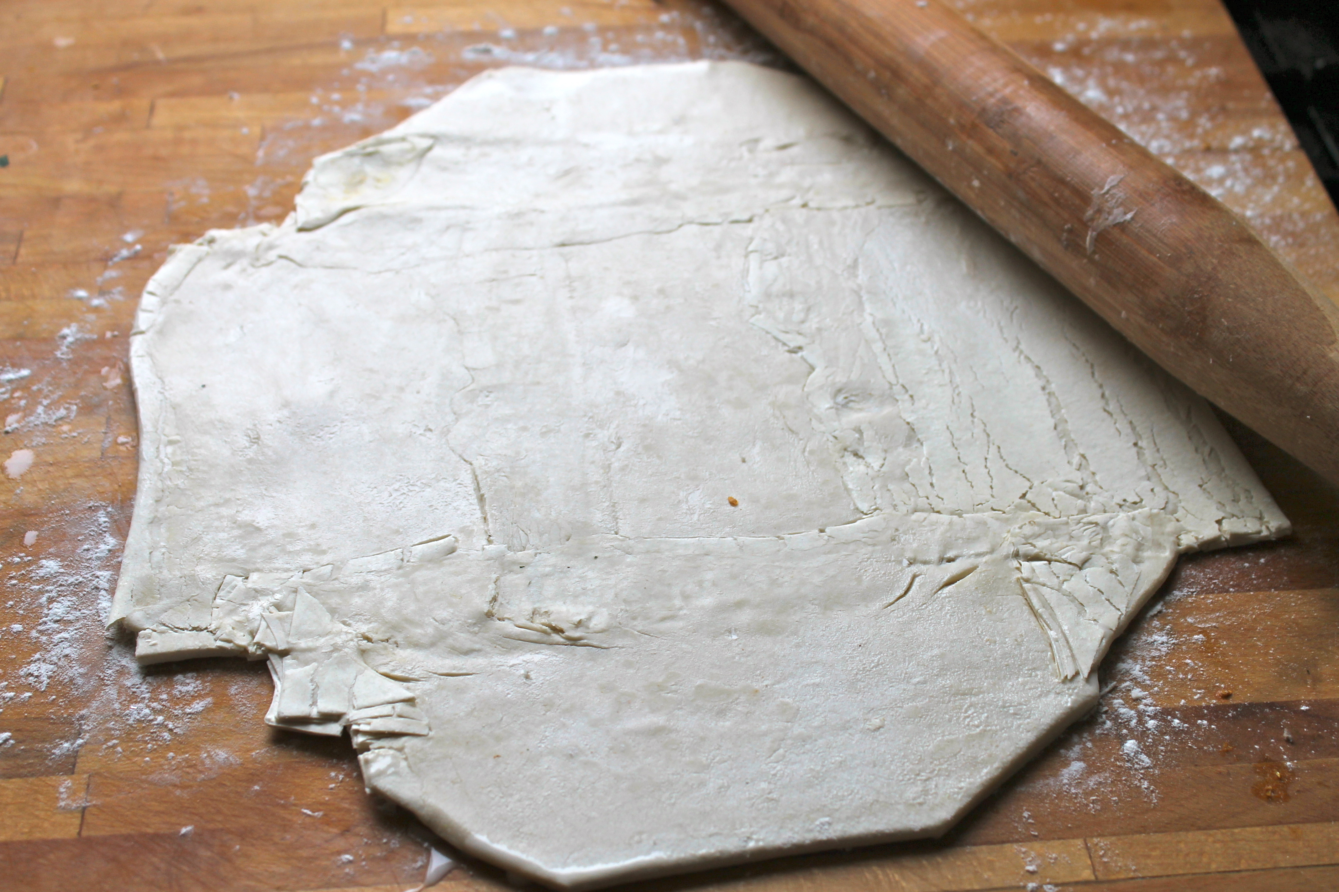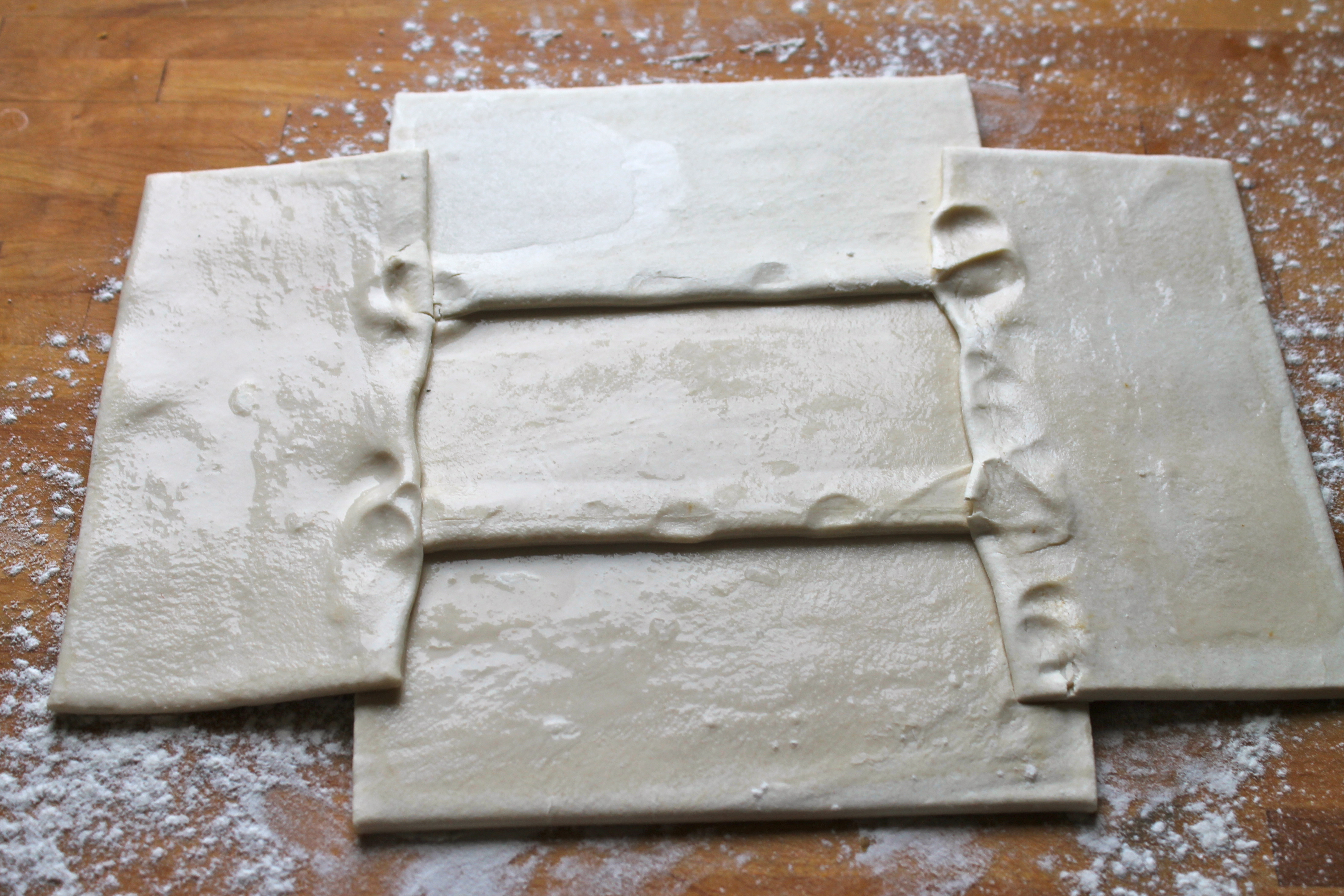Ég semsagt byrjaði á að ná í smjördeigspakkann í frysti, það voru fimm plötur í honum og ég dreifði þeim á vinnuborðið og lét þiðna rétt á meðan ég hitaði ofninn í 200°C. Svo stráði ég ögn af hveiti á borðið, raðaði plötunum saman, lét þær skarast ögn og þrýsti brúnunum saman með fingurgómunum.