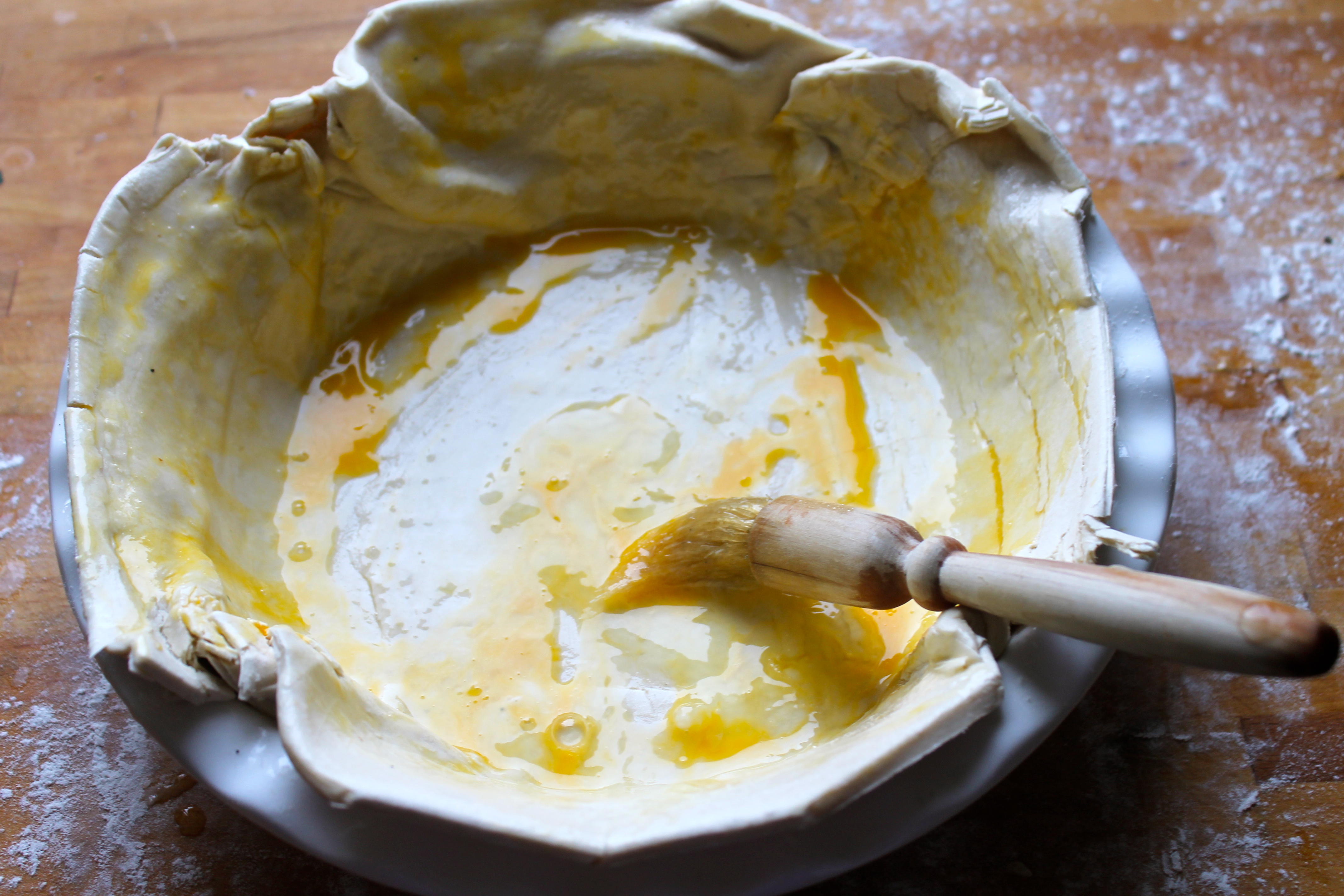 Svo tók ég djúpt bökuform, svona sem víkkar aðeins út, og lagði deigið yfir það. En það má líka nota venjulegt bökuform eða þess vegna springform. Penslaði deigið með slegnu eggi.