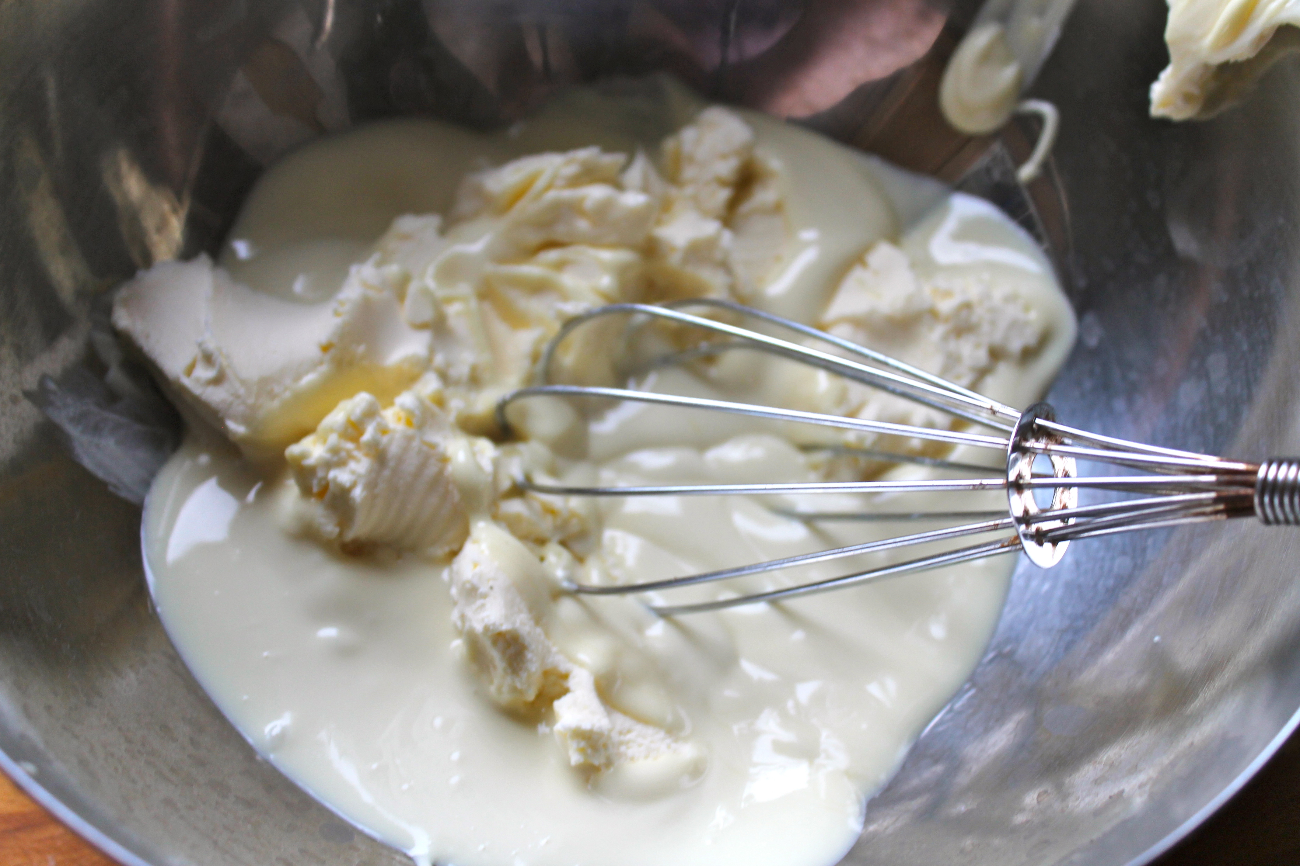Ég hellti því svo í skál, setti rjómaostinn (þetta voru sirka 100 grömm) út í í nokkrum klípum og hrærði þar til blandan var slétt. Rjómaosturinn mýkist fljótt í heitu súkkulaðinu.