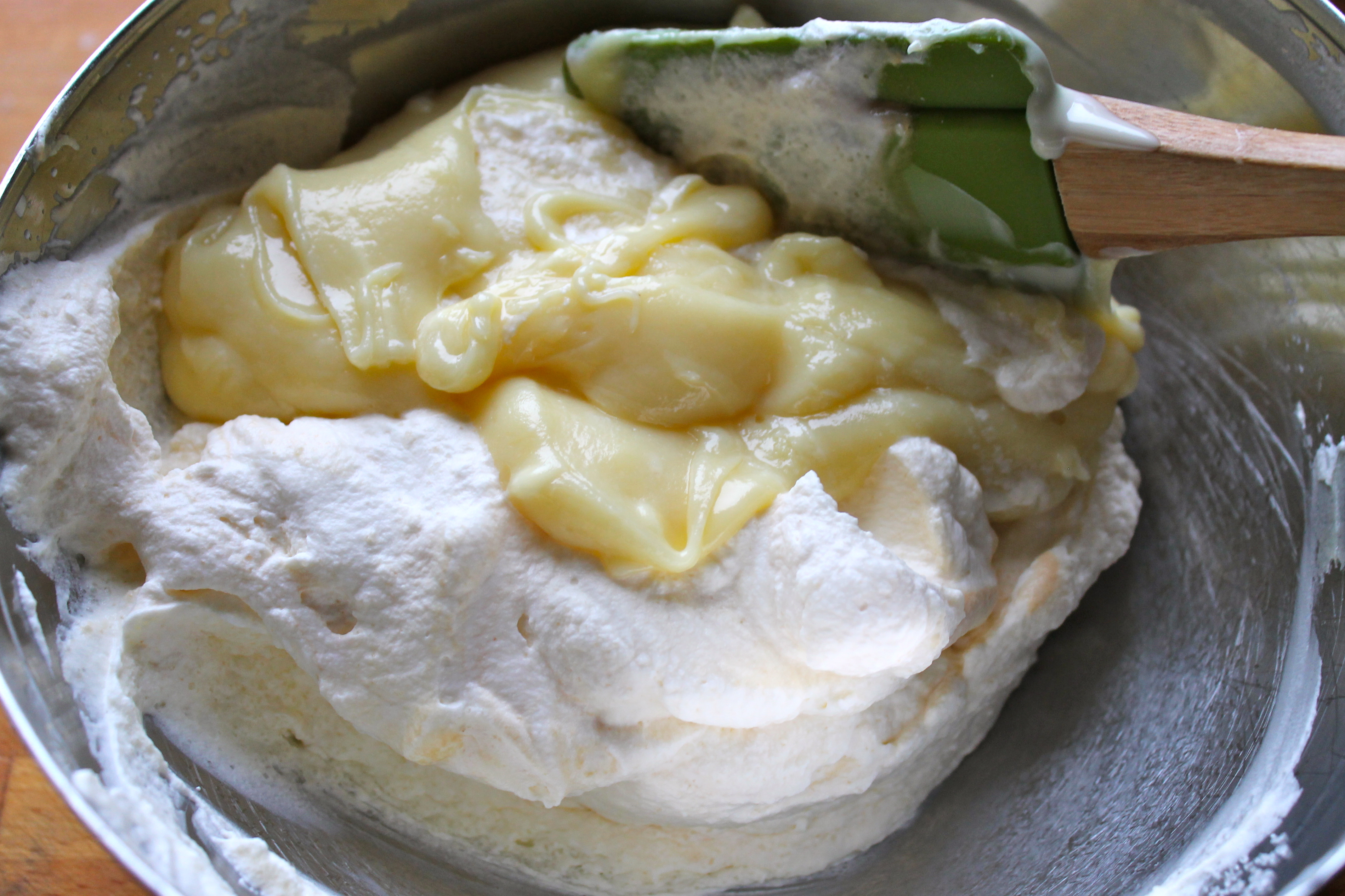 Á meðan gerði ég fyllinguna. Byrjaði á að bræða 150 g af hvítu súkkulaði í vatnsbaði; hrærði þegar það byrjaði að bráðna og tók pottinn af hitanum áður en súkkulaðið var alveg fullbráðið. Hvítt súkkulaði er frekar viðkvæmt og borgar sig ekki að láta það hitna meira en þarf.