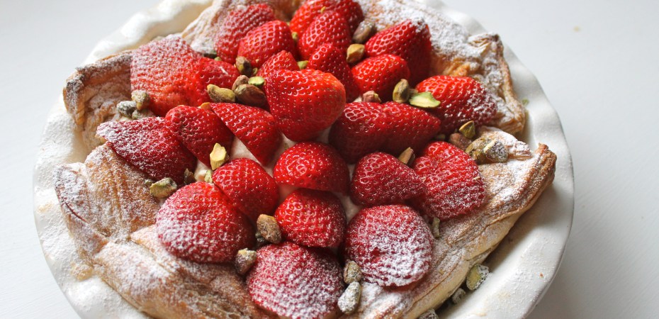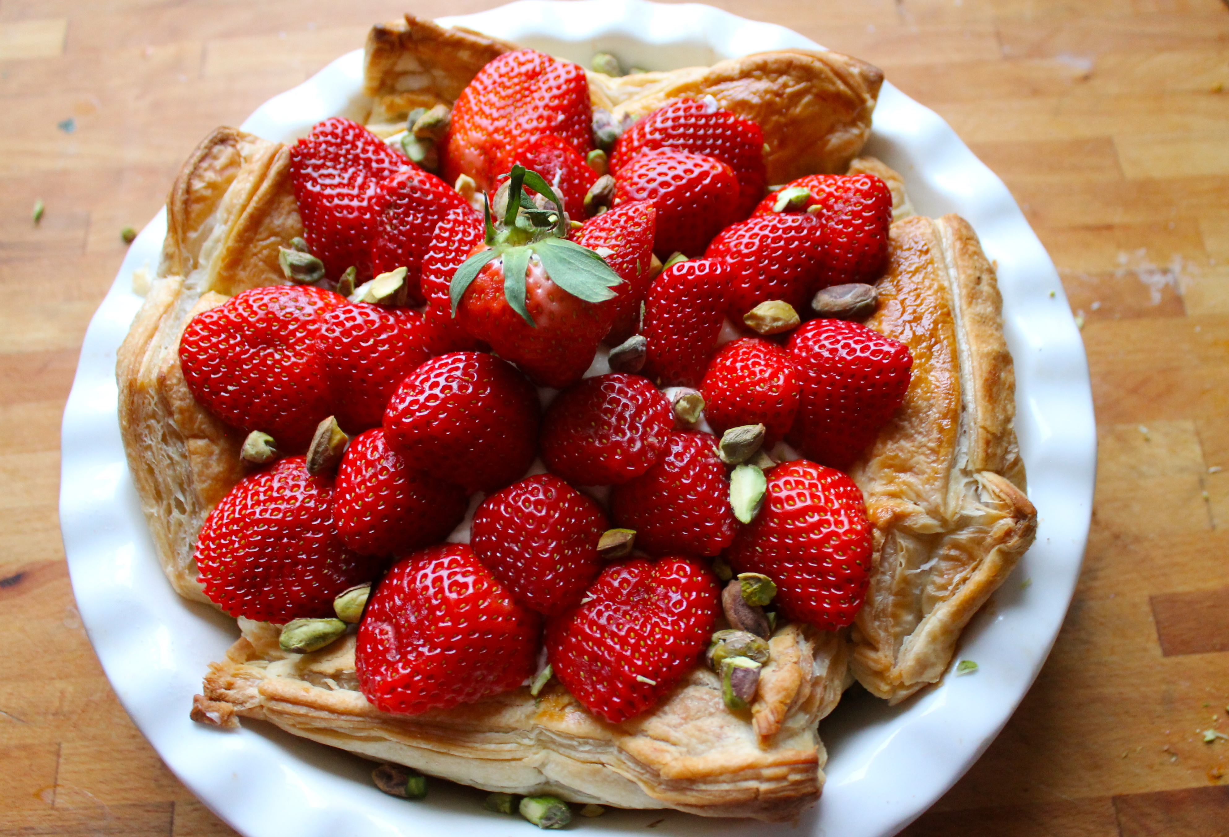Svo skar ég þessi hlussustóru jarðarber í tvennt og raðaði ofan á; hafði þau allrastærstu yst. Tók svo 1-2 msk af pistasíuhnetum, grófsaxaði og dreifði yfir.