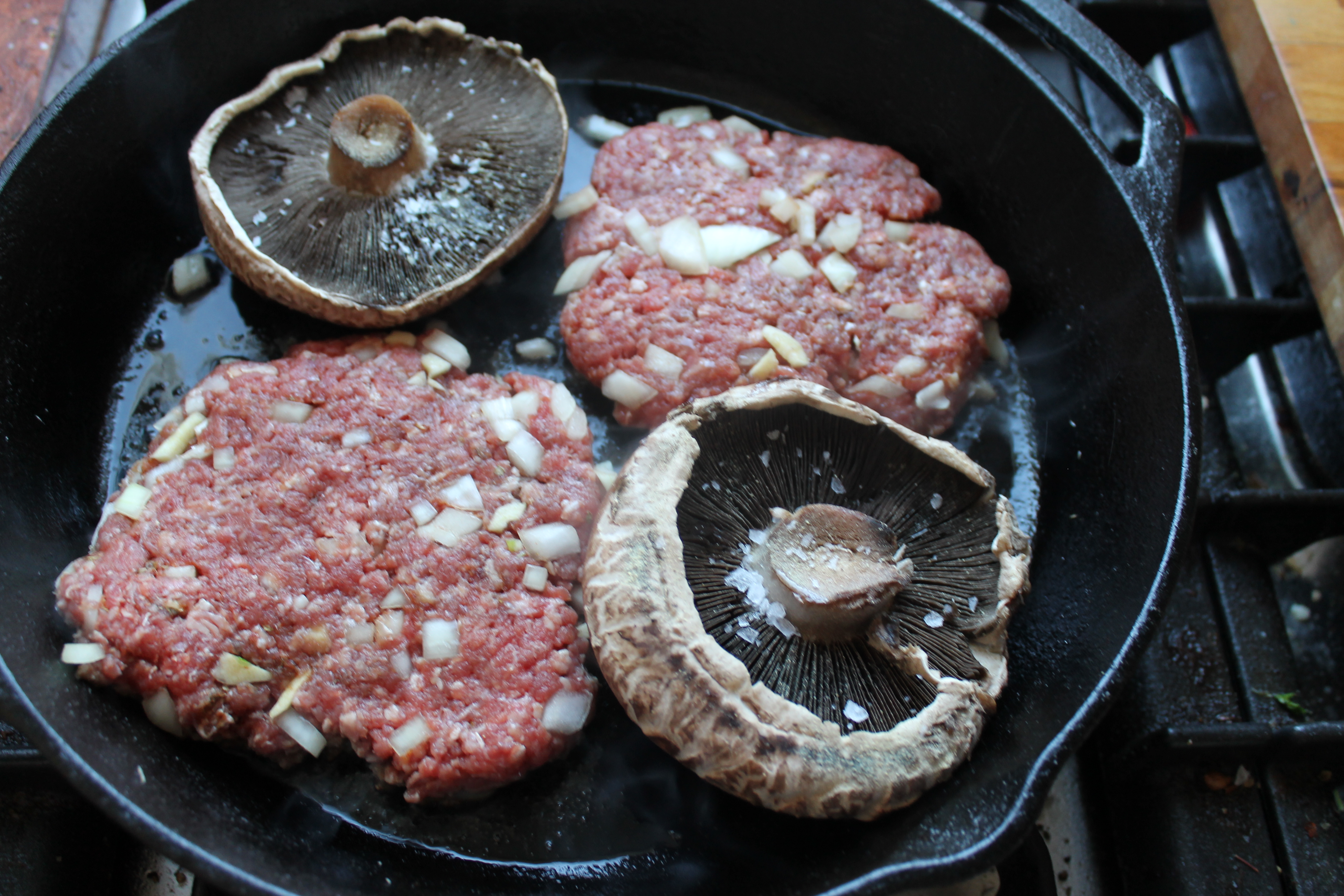 Ég skipti hakkinu í tvennt og mótaði stóra, frekar þykka borgara. Svo tók ég portobello-sveppina og kryddaði þá með pipar og Maldon-salti. (Ég skar mestallan legginn af en mundi reyndar ekki eftir því fyrr en sveppirnir voru komnir á pönnuna).