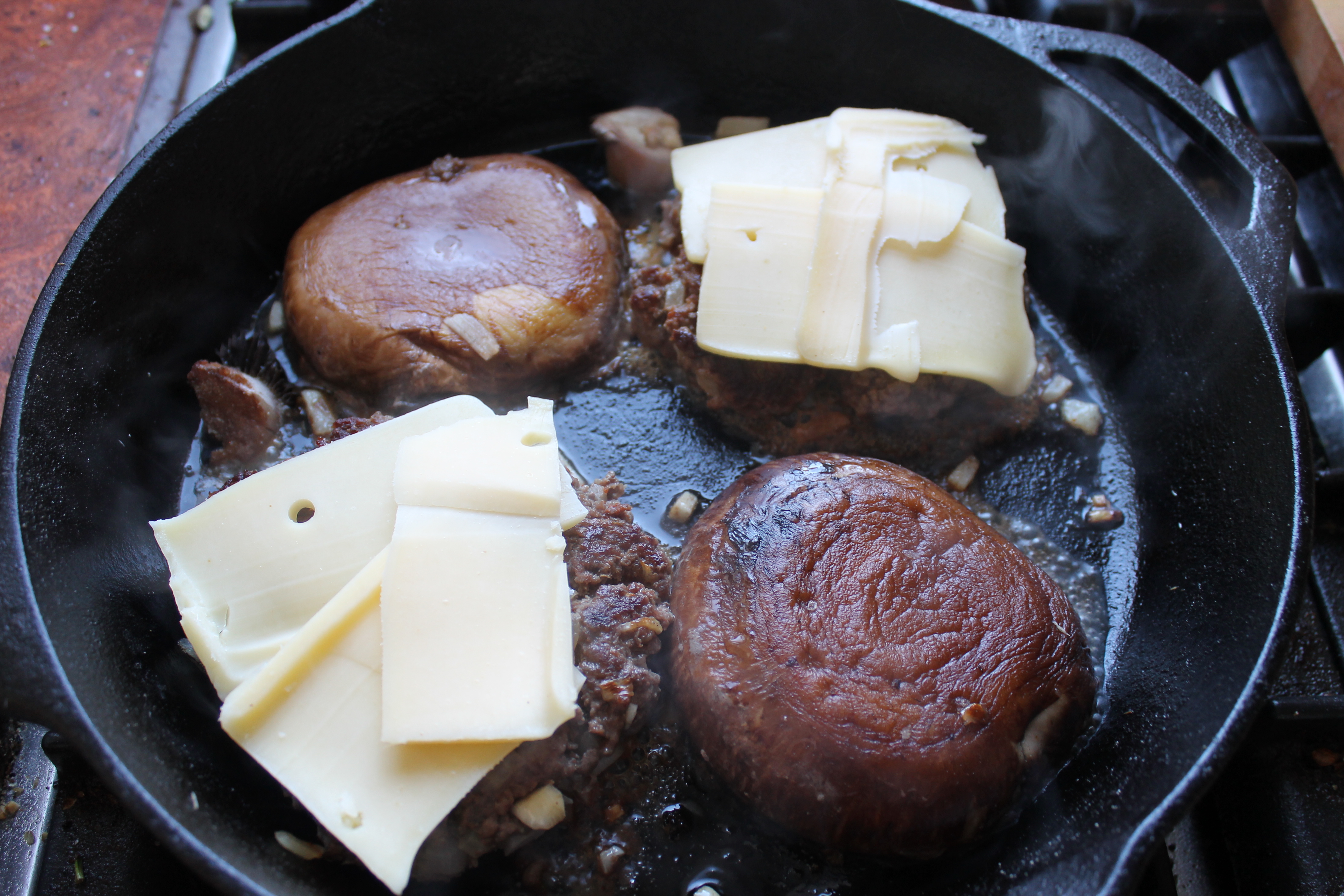 Þá sneri ég borgurunum, setti nokkrar ostsneiðar ofan á og steikti í 5 mínútur í viðbót (já, þeir voru frekar þykkir). Ég sneri sveppunum ekki alveg strax því það kemur töluverður vökvi úr þeim og ég vildi vera búin að steikja borgarann aðeins á seinni hliðinni áður.
