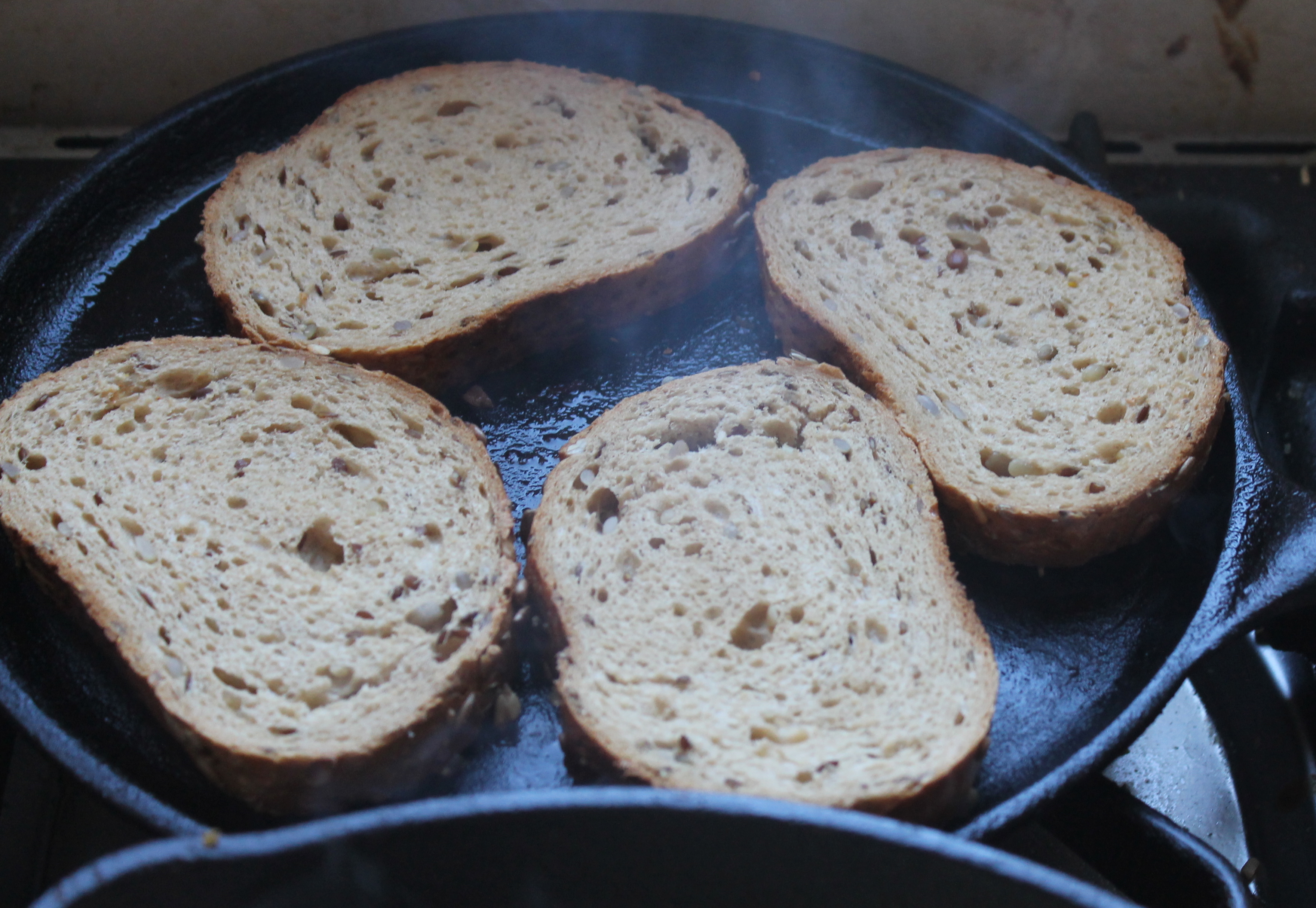 Á meðan hamborgararnir og sveppirnir steiktust hitaði ég svo aðra pönnu, stökksteikti fyrst 4 beikonsneiðar (má sleppa en þetta átti nú að vera alminlegur borgari sko …) og skar svo 4 vænar brauðsneiðar og ristaði þær á pönnunni (án þess að þurrka af henni, það má alveg koma svolítill beikonkeimur af þeim) á báðum hliðum.