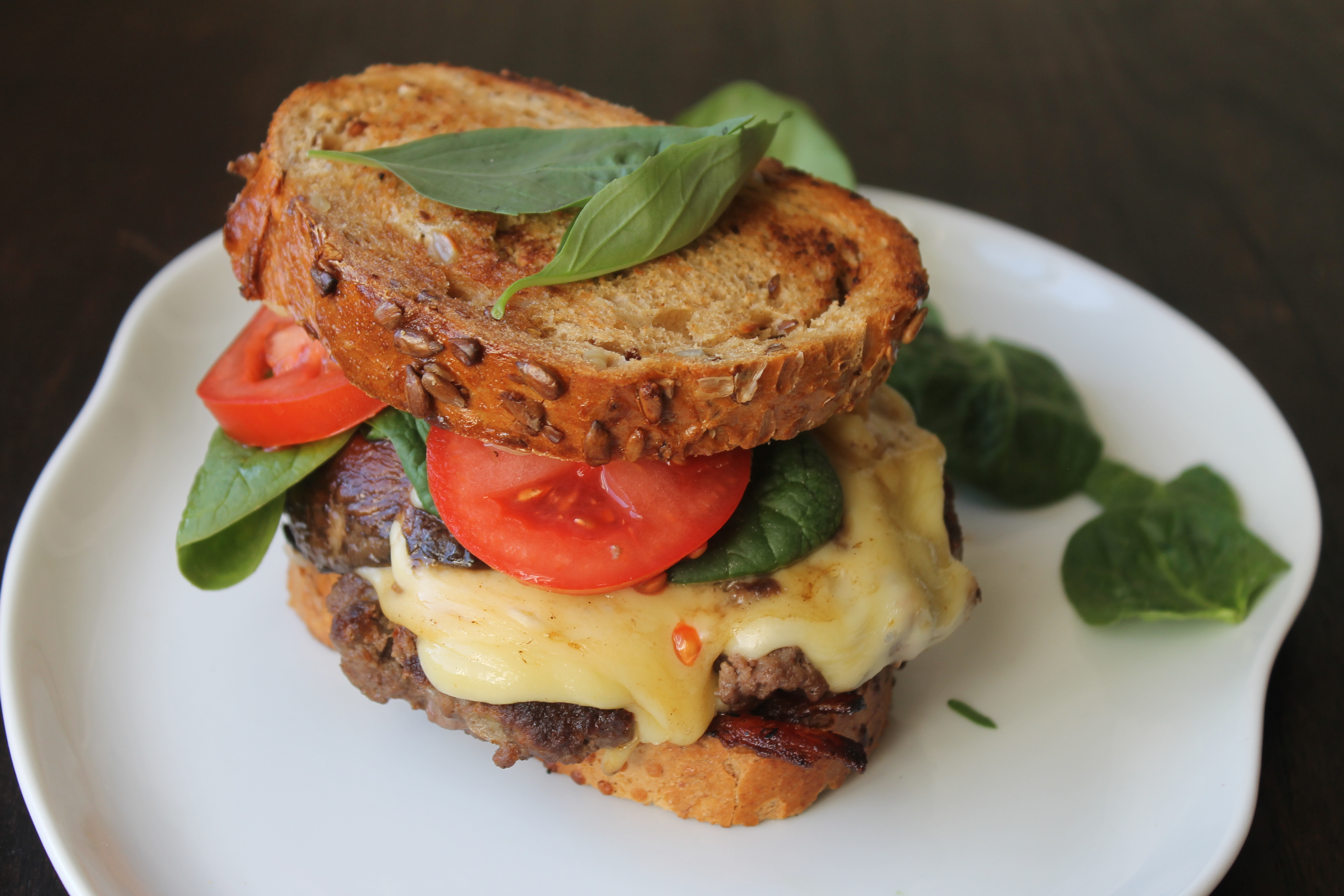 Og þá var bara að setja borgarann saman: brauðsneið, tvær beikonsneiðar, borgari með bráðnum osti, portobellosveppur, spínat, tómatar (það verður nú að muna eftir hollustunni …), önnur brauðsneið. Basilíkublöð ofan á.