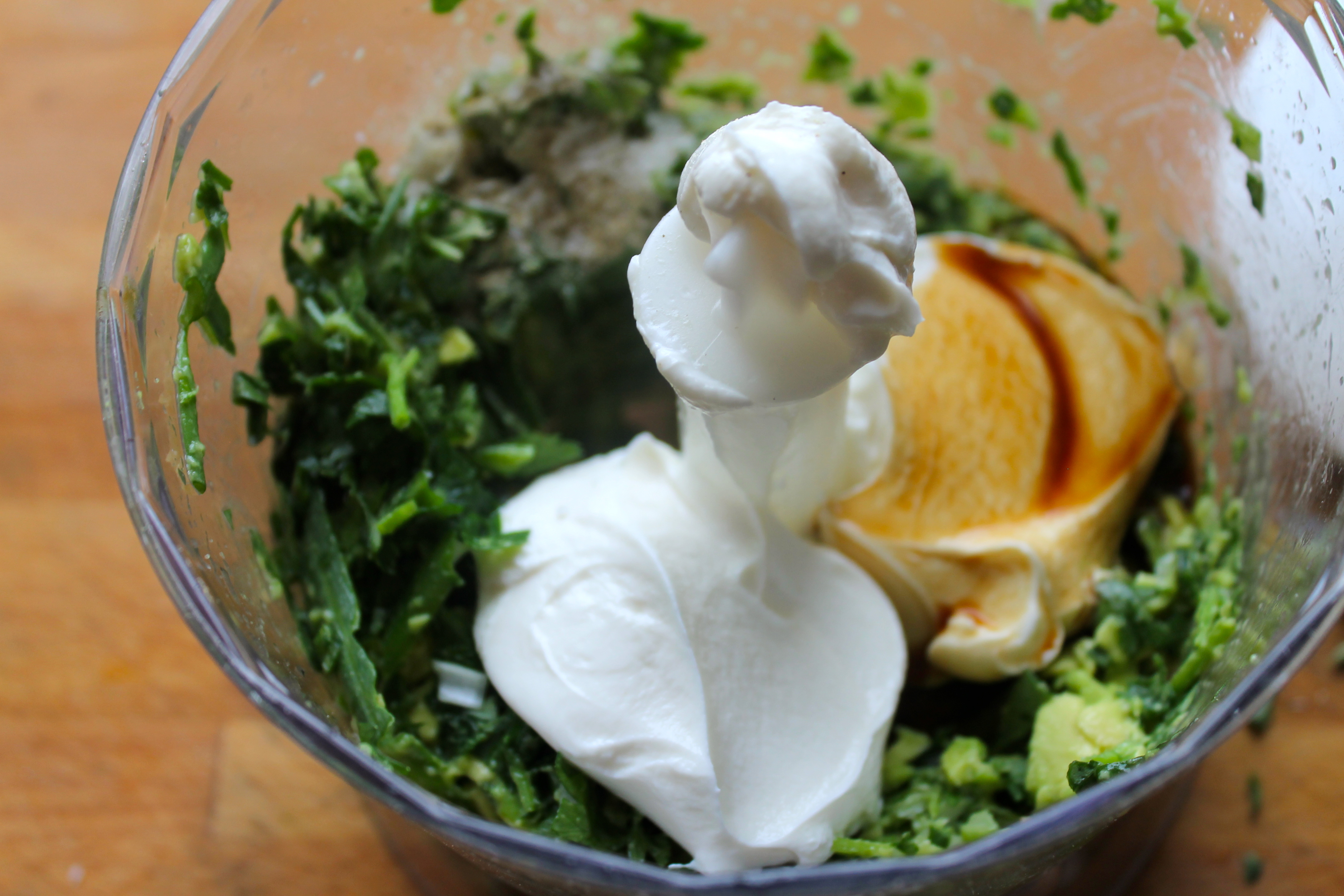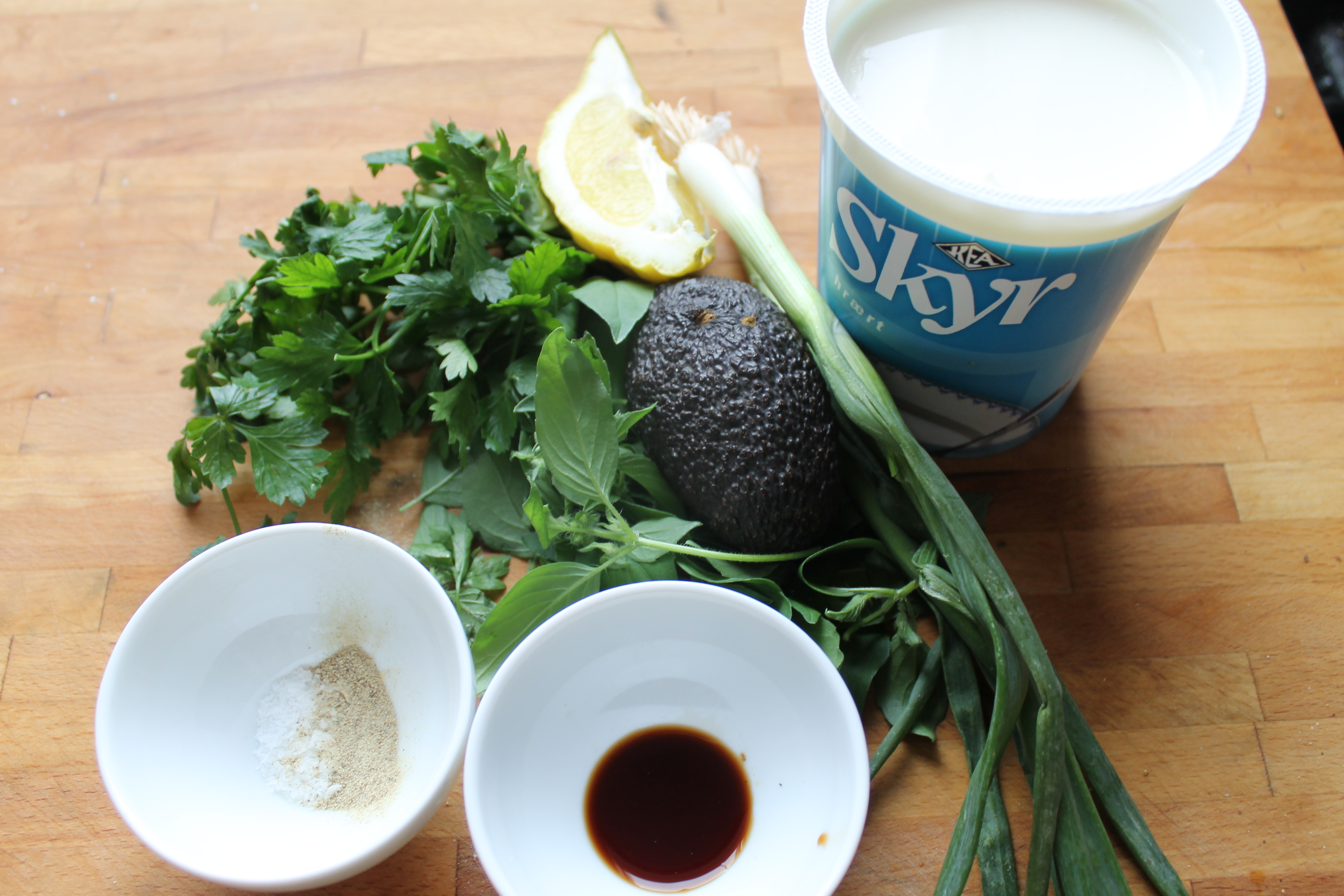 Ég tók til skyr (hreint KEA-skyr), eina litla lárperu, lófafylli af flatblaða steinselju og aðra af basilíku, tvo vorlauka, fjórðung úr sítrónu, teskeið af worchestersósu (má sleppa), pipar og salt. Svo bætti ég við ögn af cayennepipar seinna.