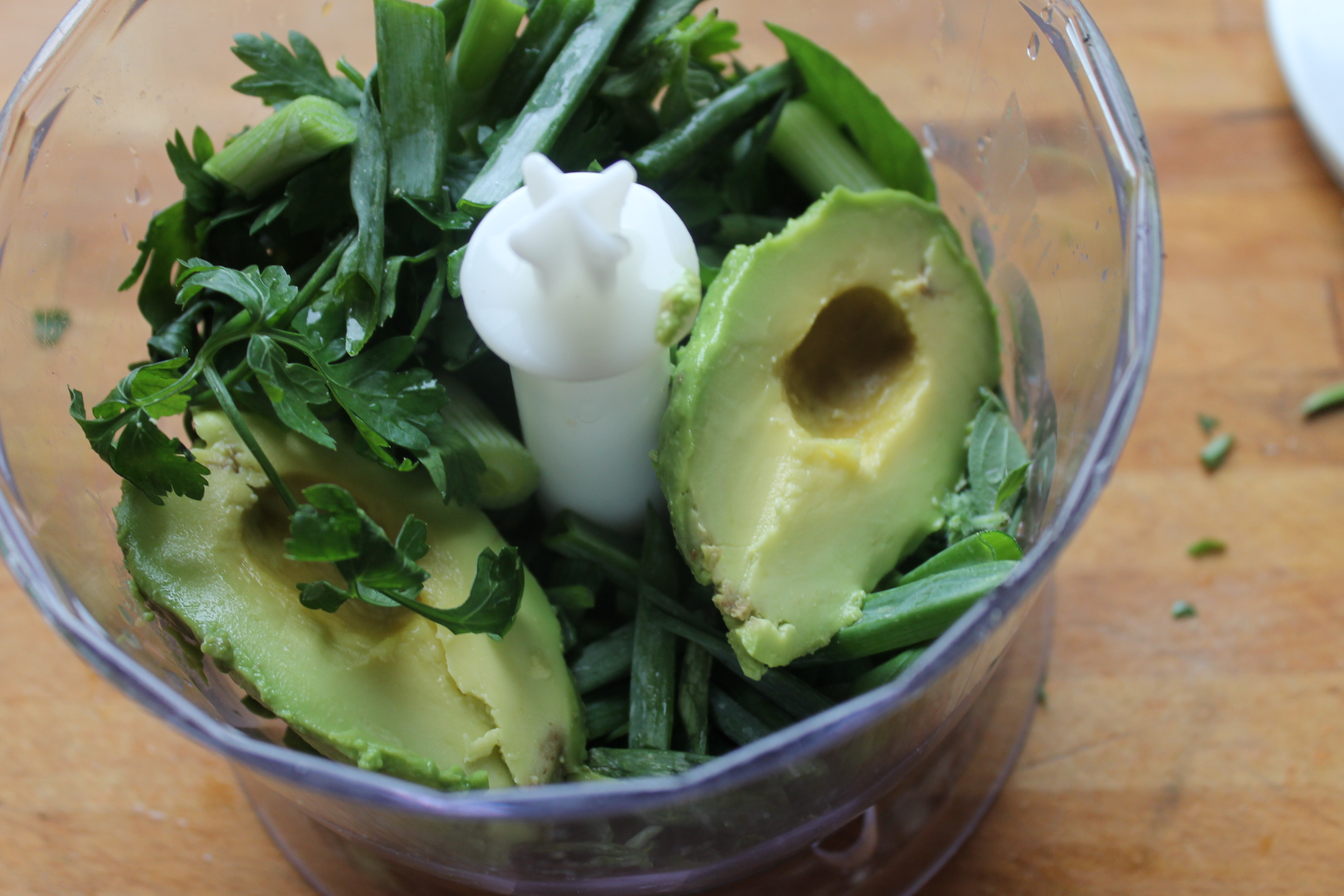Ég afhýddi og steinhreinsaði lárperuna og setti hana í matvinnsluvél ásamt kryddjurtunum og lét vélina ganga þar til allt var orðið smátt saxað.