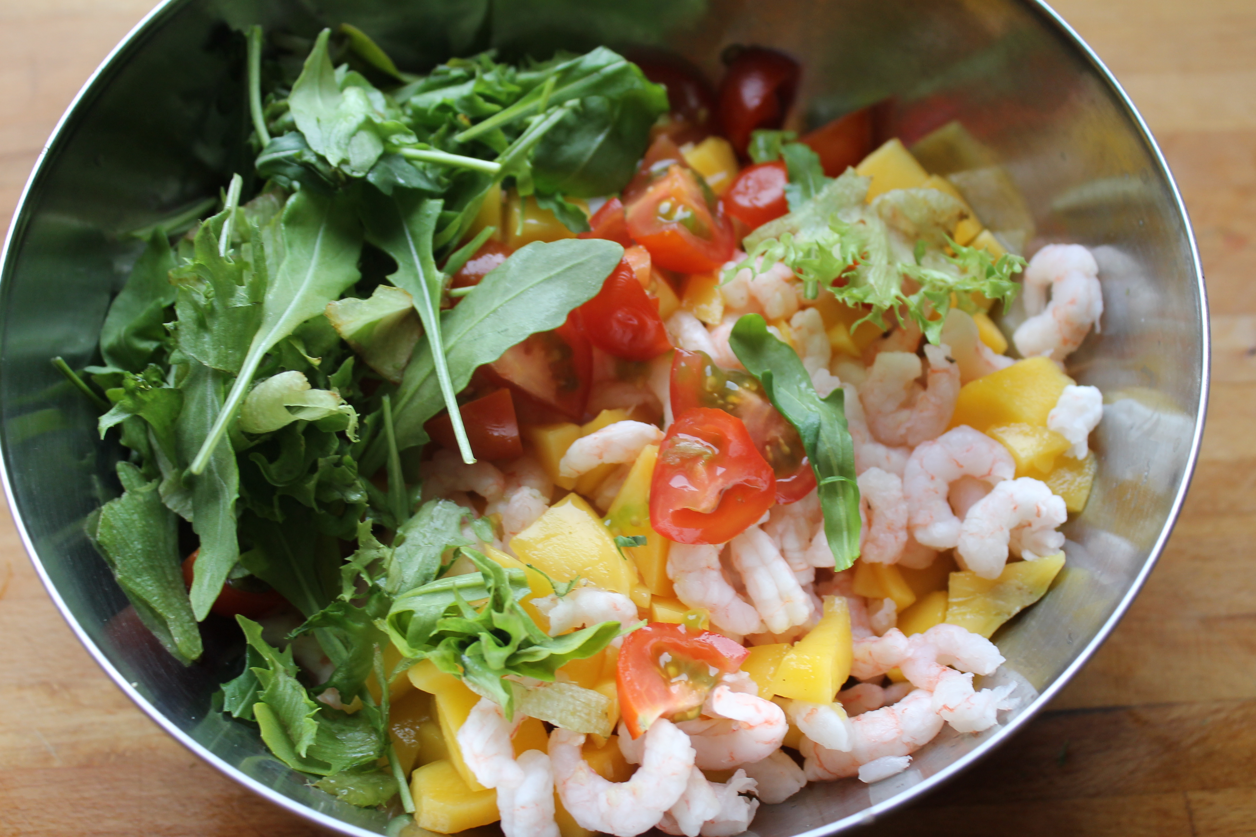 Ég setti rækjurnar, sem ég var búin að láta þiðna í sigti, í skál, flysjaði mangóið og skar það (mestallt) niður í litla teninga og skar svona 6-8 litla kirsiberjatómata í fjórðunga. Saxaði svo lófafylli af salatblöndu (Gullfoss, minnir mig) og blandaði þessu öllu saman.