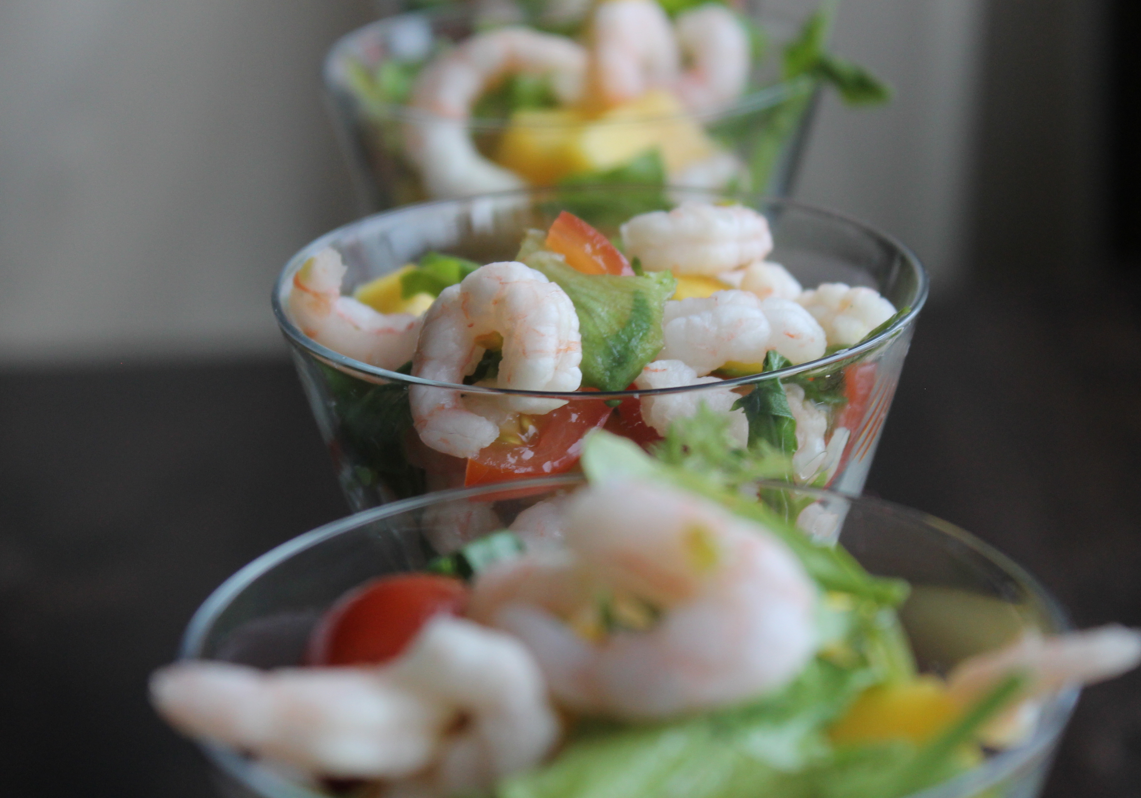 Það er í sjálfu sér hægt að nota ansi margt í rækjukokkteil þótt oft sé þetta bara rækjur, rifin eða söxuð stökk salatblöð og sósa. Ég átti ágætis mangó, alveg hæfilega þroskað og ákvað að nota það auk nokkurra kirsiberjatómata og salatblaða. En mig langaði ekkert í kokkteilsósu, hvorki íslensku útgáfuna (eða einhverja aðra bleika kokkteilsósu) né rauða ameríska, svo ég ákvað að fara allt aðra leið.