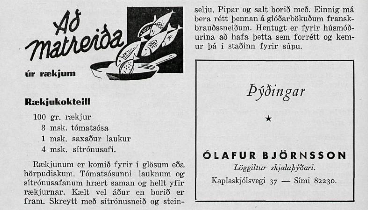 Ætli þetta sé ekki merki um stóraukin bandarísk áhrif hérlendis í kjölfar stríðsins? Elsta íslenska uppskriftin sem ég hef fundið að rækjukokkteil enn sem komið er birtist í Ægi 1956: