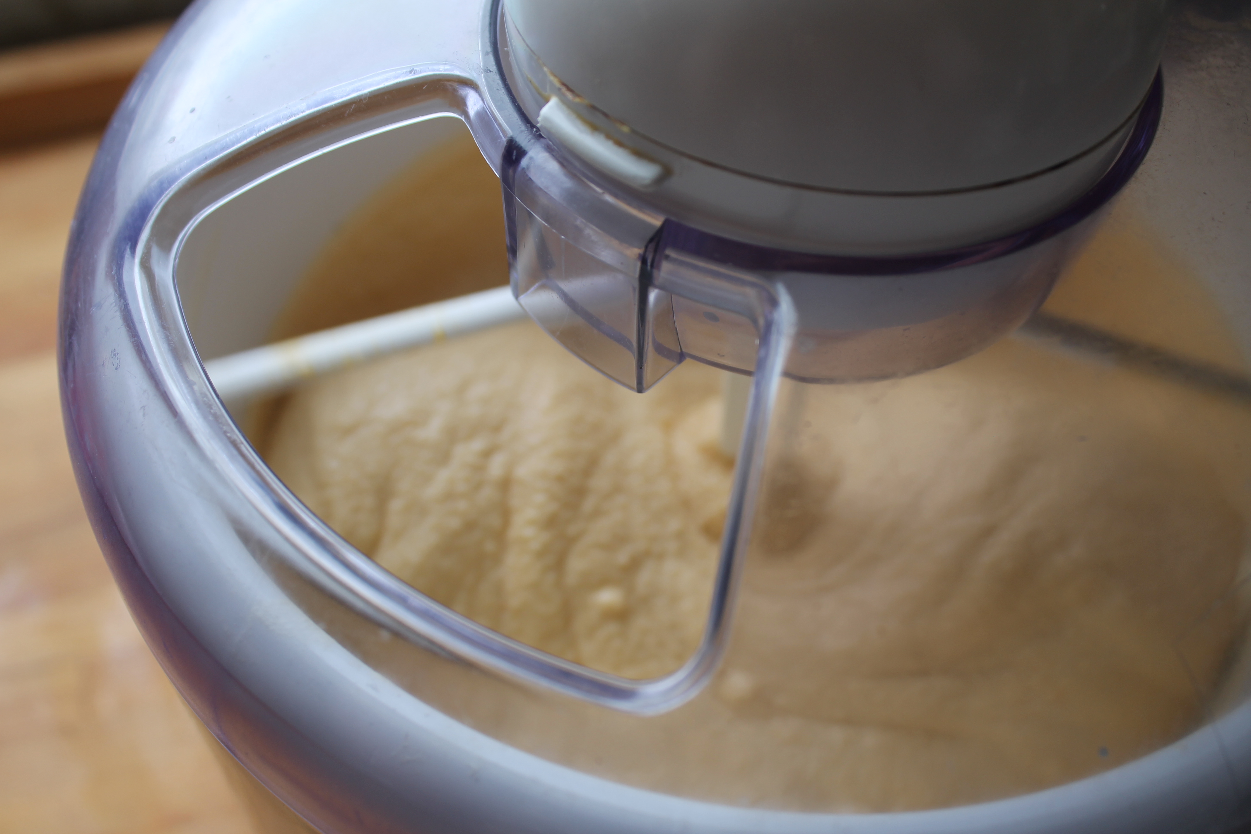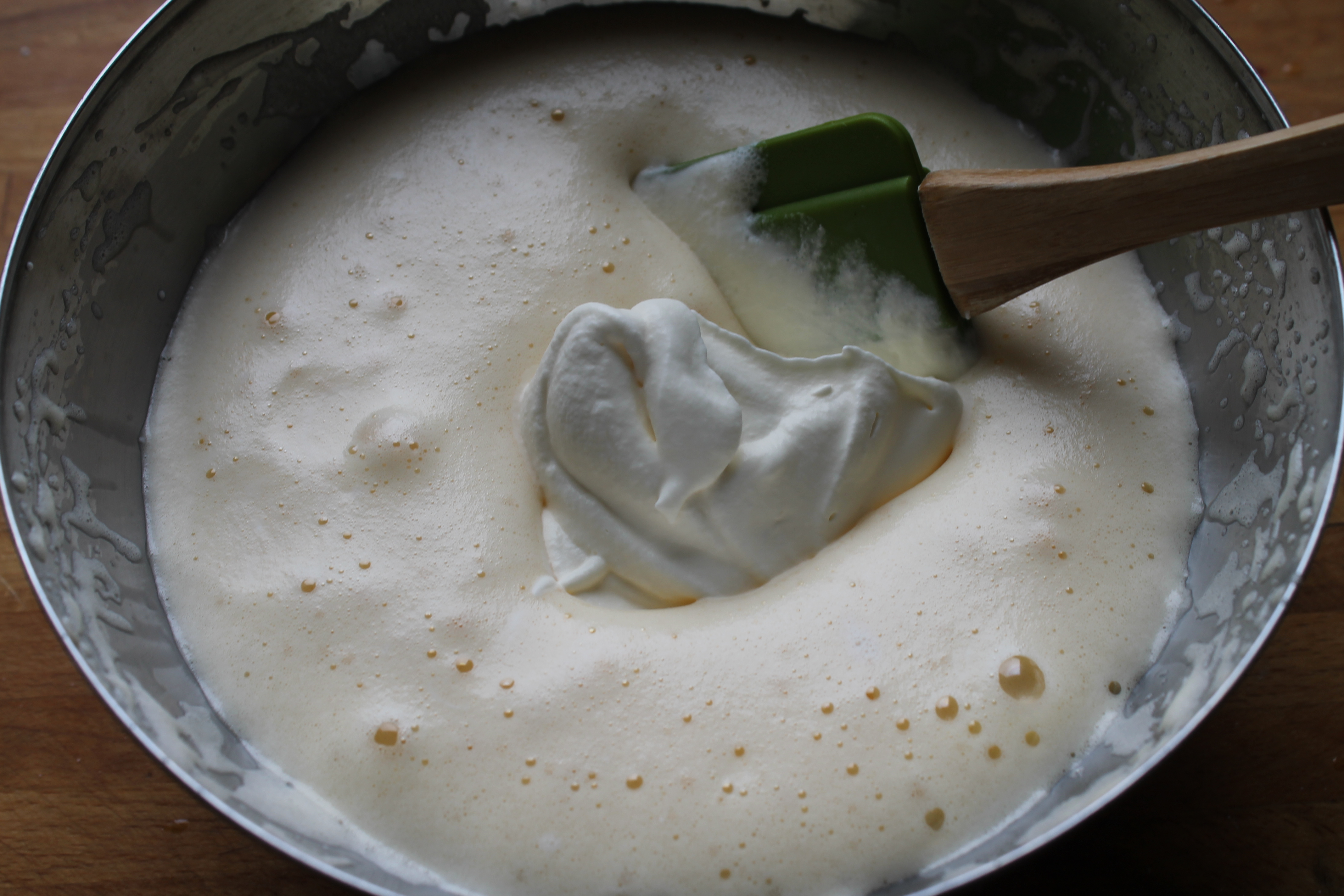 Svo setti ég helminginn af rjómanum út í eggjahræruna og blandaði gætilega saman með sleikju – þetta þarf alls ekki að vera slétt því það er hvort eð er að fara í ísvél þar sem það hrærist allt saman. Ég setti ísvélina af stað og hellti blöndunni í hana.