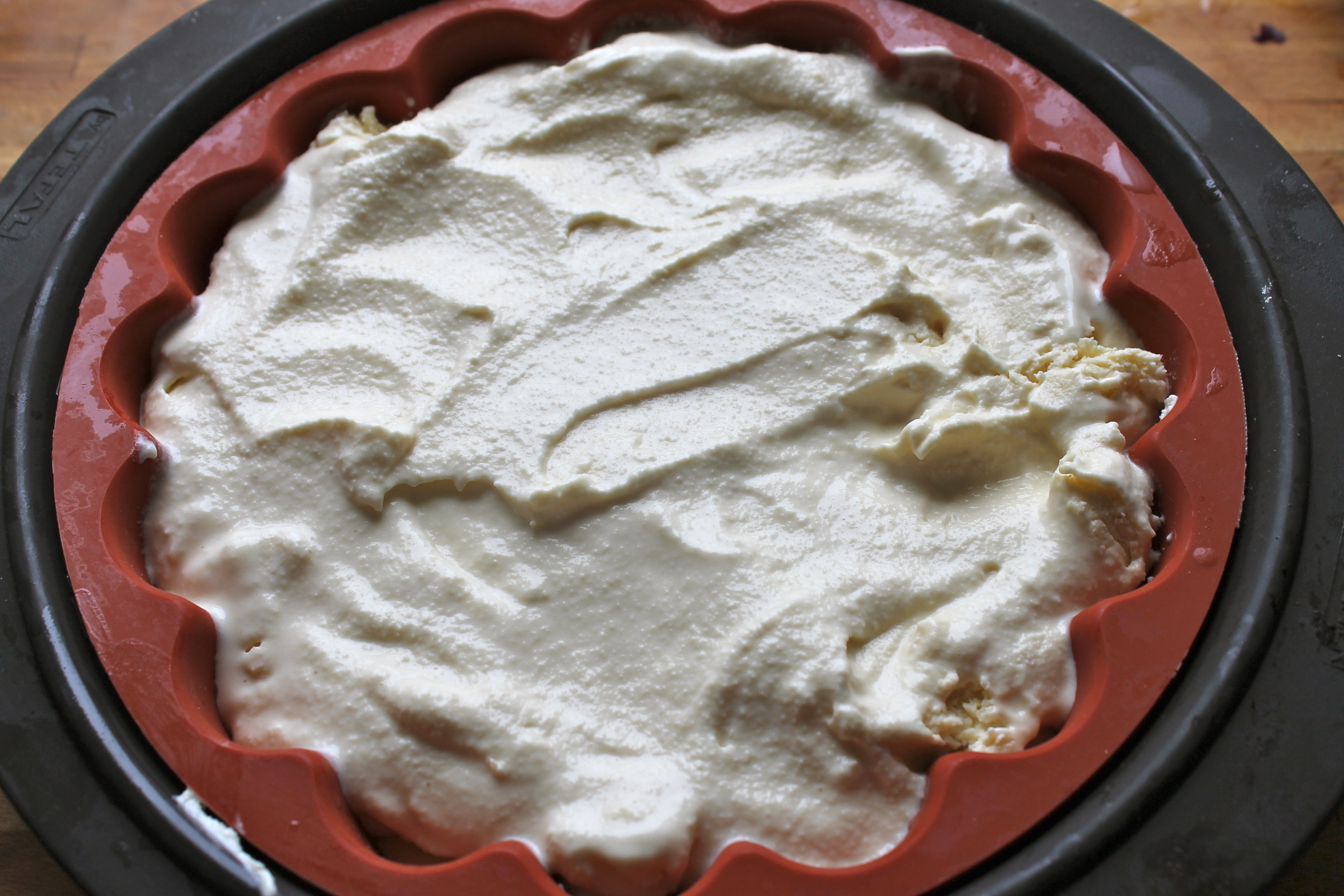 Ég setti svo ísblönduna í form – hún má ekki nema hálffylla formið í mesta lagi, það þarf að vera pláss fyrir meiri ís. Ástæðan til þess að ég nota tvö form er að það innra (mynstraða) er svo mjúkt og eftirgefanlegt að það er ekki víst að það haldi nógu vel lagi, þess venga hef ég það ofan í öðru stífara formi á meðan ísinn er að frjósa. – Það sem sýnist vera kekkir er bara harðfrosinn ís sem ég skóf af bontinum á ísvélinni, hann samlagast hinu alveg og það verða engir kekkir í ísnum.
