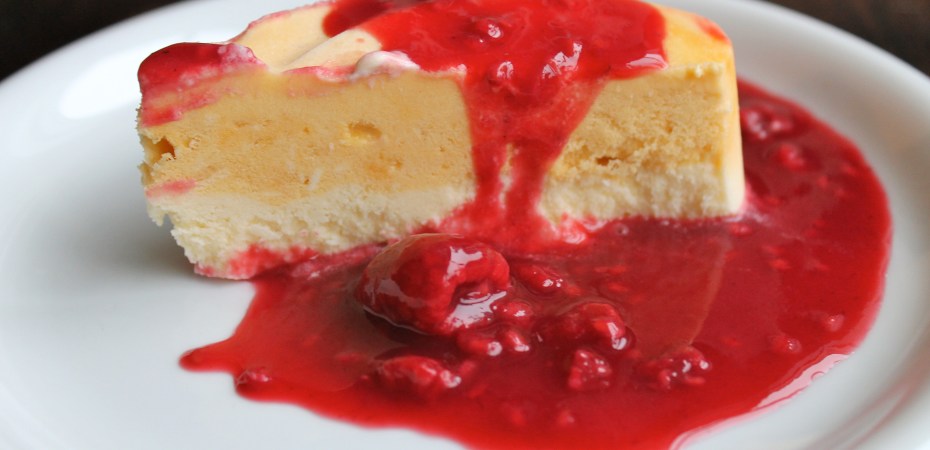 Á meðan gerði ég íssósu úr þriðju flöskunni, hindberja-bláberja-maukinu. Ég setti svona 125 g af frosnum hindberjum í pott, hellti 200 ml úr flöskunni yfir og hitaði rólega þar til hindberin höfðu þiðnað og allt var heitt í gegn (ekki sjóðheitt þó).