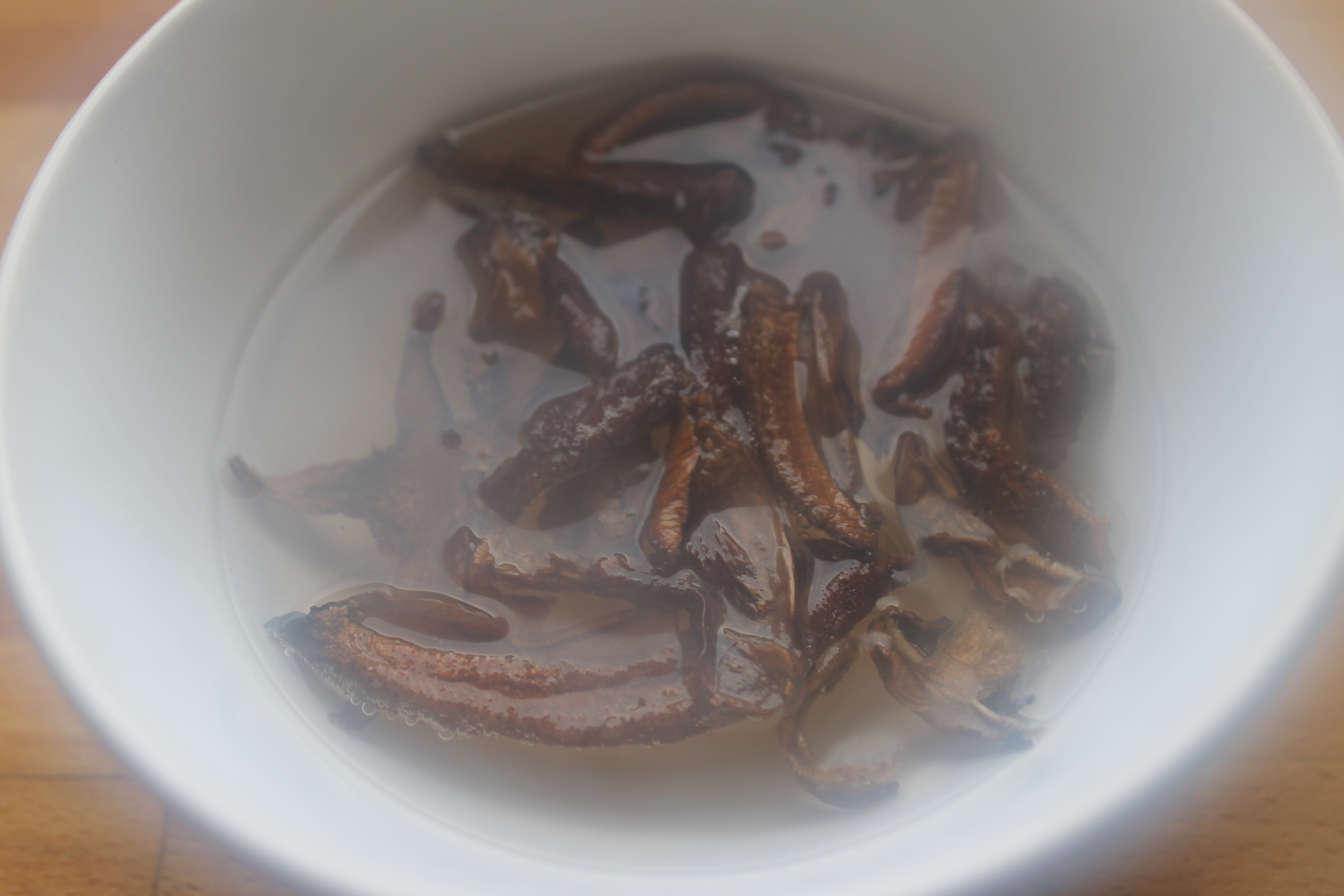 Ég byrjaði á að hita vatn og tók svo nokkra þurrkaða villisveppi og setti í skál. Það er ekkert bráðnauðsynlegt en gefur mjög gott sveppabragð. Hellti svona 100-150 ml af sjóðheitu vatni yfir (myndin er ekki úr fókus, þetta er gufa) og lét standa í svona korter.