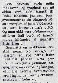 Annars er pasta í rauninni ekki svo gamalt í íslenskri matarsögu. Orðið pasta var tæpast notað (þ.e. ekki um matvöruna) fyrr en á níunda áratug síðustu aldar og þó fyrst og fremst á þeim tíunda. Fram að því þurfti meira og minna að útskýra fyrir fólki hvað pasta væri, eins og gert er hér (1967):