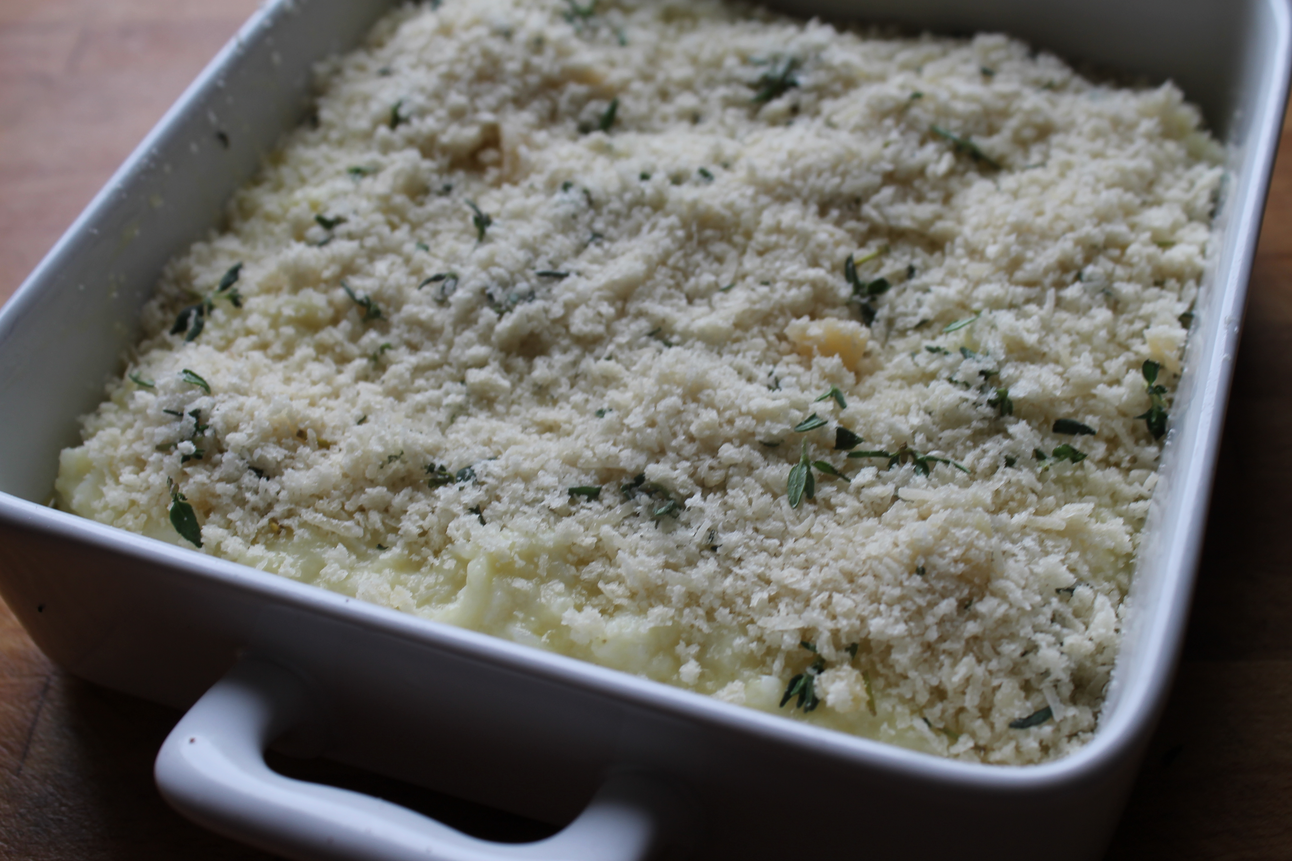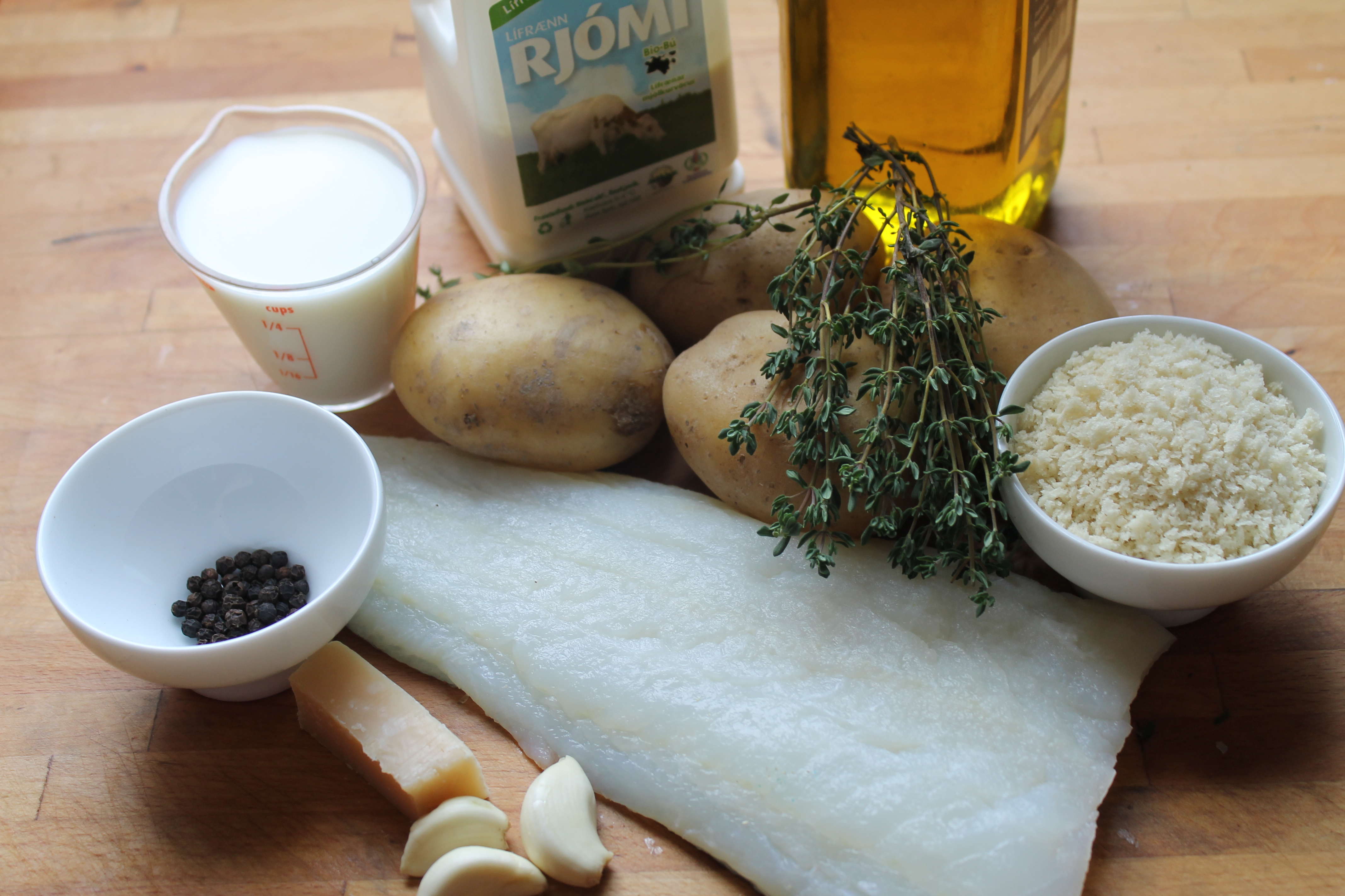 Ég átti saltfiskbita, svona 250 grömm. Svo var ég með fjórar meðalstórar kartöflur, nokkrar timjangreinar, slatta af brauðmylsnu (ég notaði panko-mylsnu en það má vera venjuleg, þurrkuð brauðmylsna, ekki of fín), þrjá hvítlauksgeira, smábita af parmesan, piparkorn, 100 ml af mjólk, 100 ml af rjóma og 75 ml af ólífuolíu. – Ég hefði viljað notað 1-2 negulnagla en negulnaglakrukkan mín lét ekki finna sig.