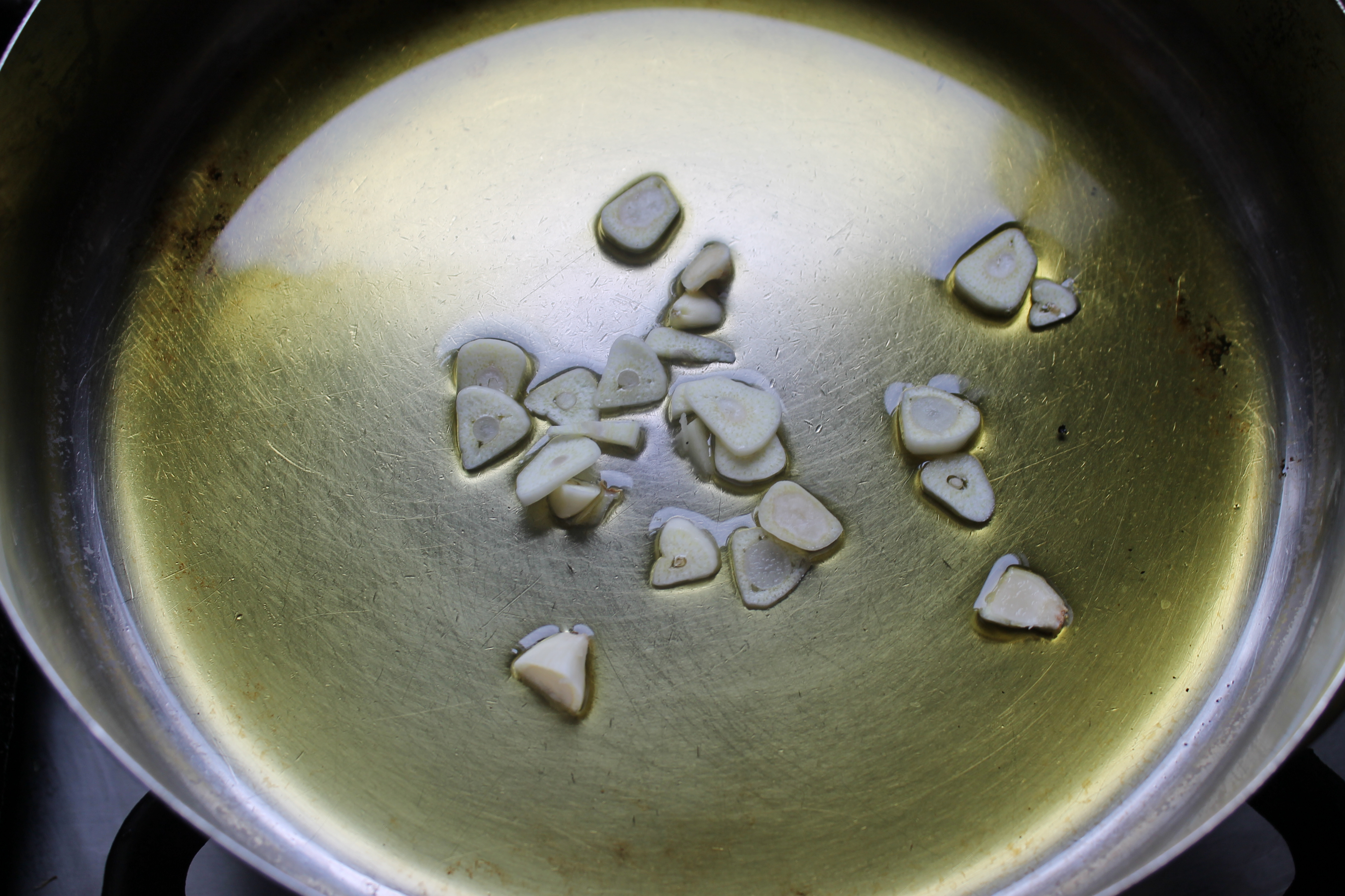 Ég skar tvo hvítlauksgeira í þunnar sneiðar, setti í pott ásamt ólífuolíunni og hitaði þar til fór að krauma í kringum geirana en þá tók ég pottinn af hitanum og hellti olíunni og hvítlauknum í litla skál og setti til hliðar.