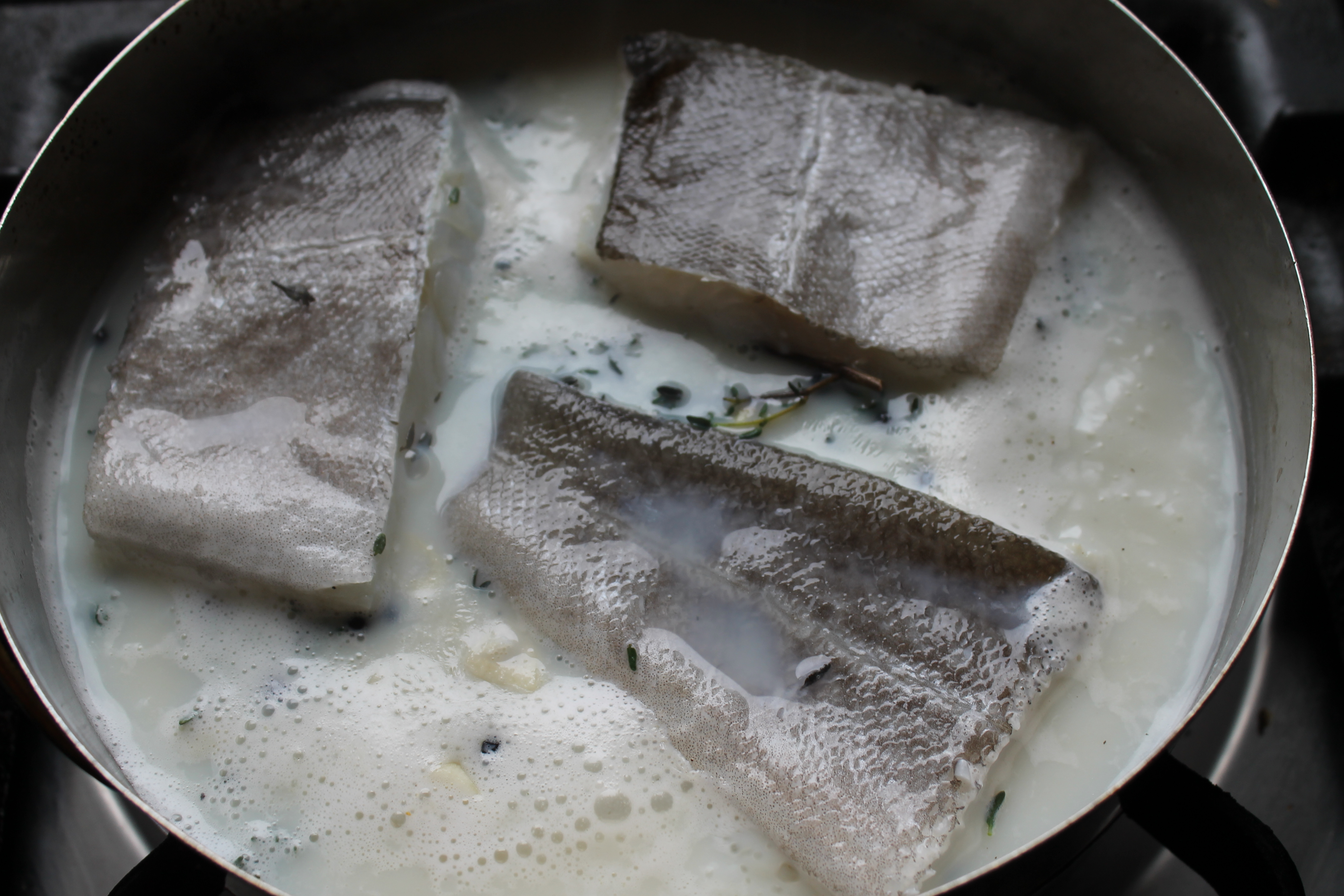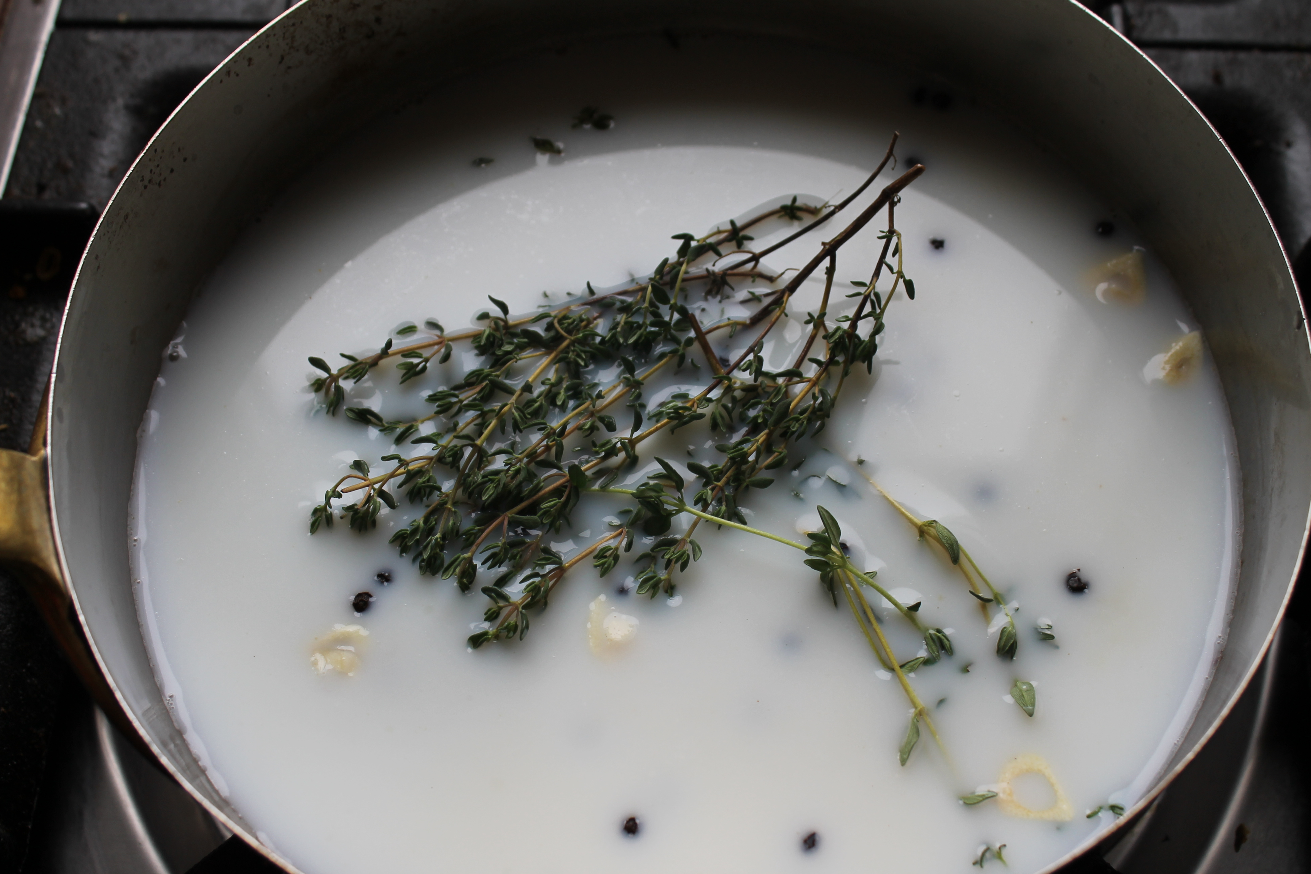 Svo setti ég mjólkina (100 ml) í pott ásamt 200 ml af vatni, mestöllu timjaninu og piparkornunum og hvítlauksgeiranum sem eftir var, smátt skornum. Hitaði að suðu og lét malla við mjög vægan hita í nokkrar mínútur.