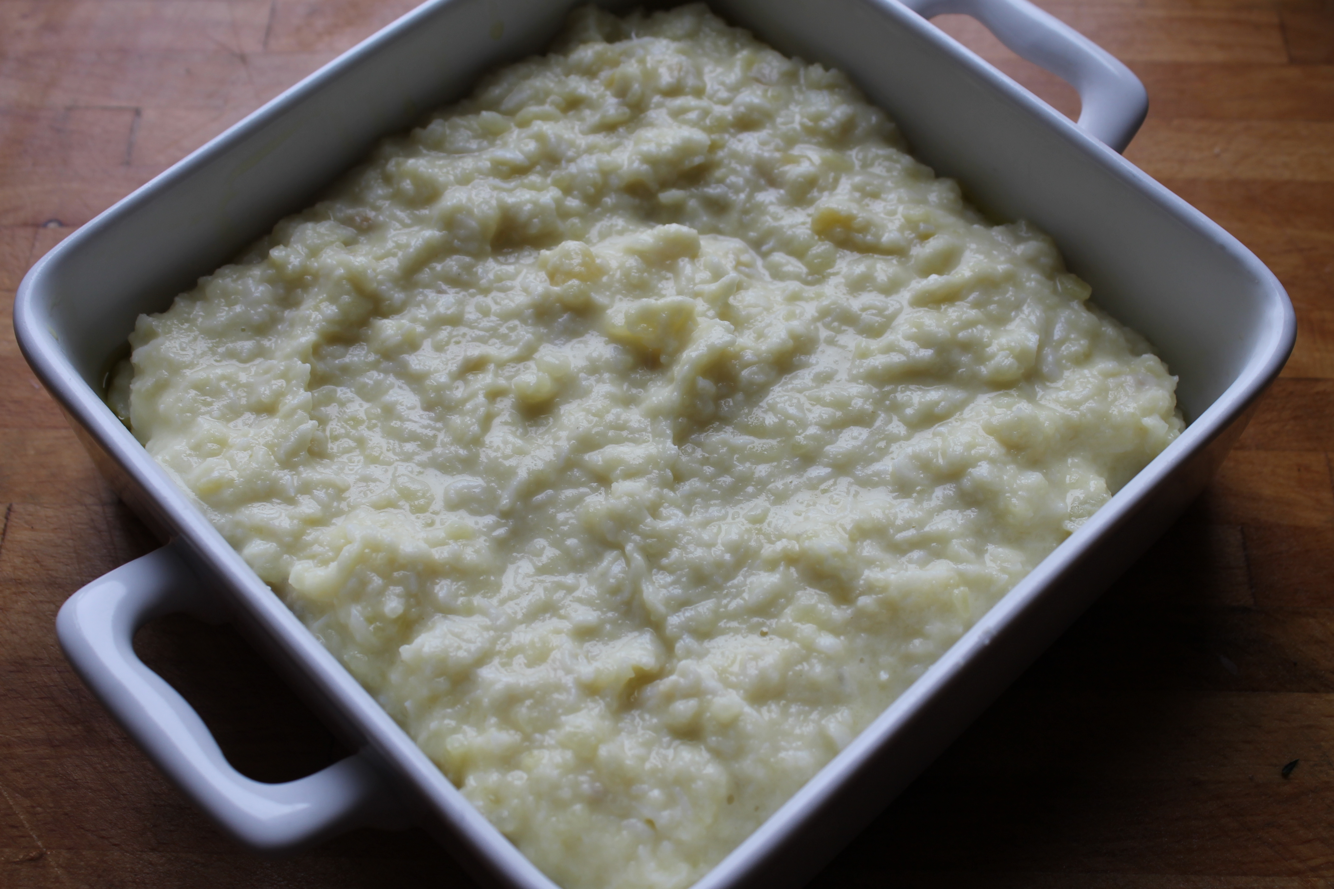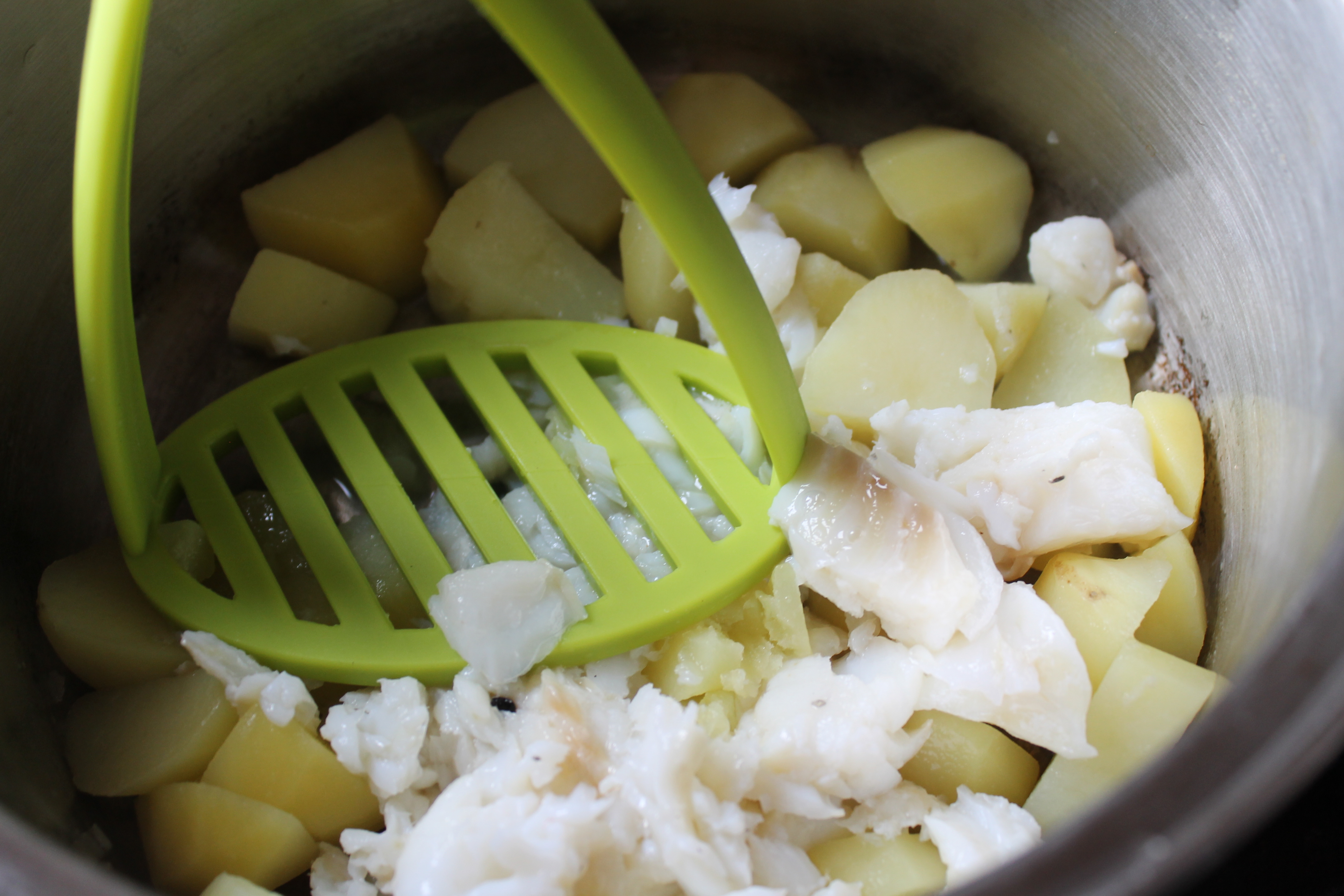 Kartöflurnar voru soðnar og ég hellti svo vatninu af þeim, setti fiskinn út í og stappaði saman, ásamt mestallri hvítlauksolíunni (skildi svolítið eftir fyrir formið) og rjómanum. – Það má líka sleppa rjómanum en nota í staðinn dálítið af mjólkurblandinu sem fiskurinn var soðinn í. Ég smakkaði svo stöppuna og kryddaði með aðeins meiri pipar.