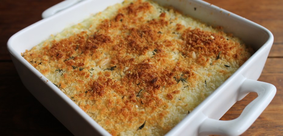 Mér finnst eitt af því besta við þennan rétt vera mismunurinn á áferð – annars vegar mjúkur og mildur en þó bragðmikill plokkfiskurinn, hins vegar stökk, brúnuð brauðmylsnan. Til að auka aðeins á þessa kontrasta er gott að hafa stökkt, grænt salat með.