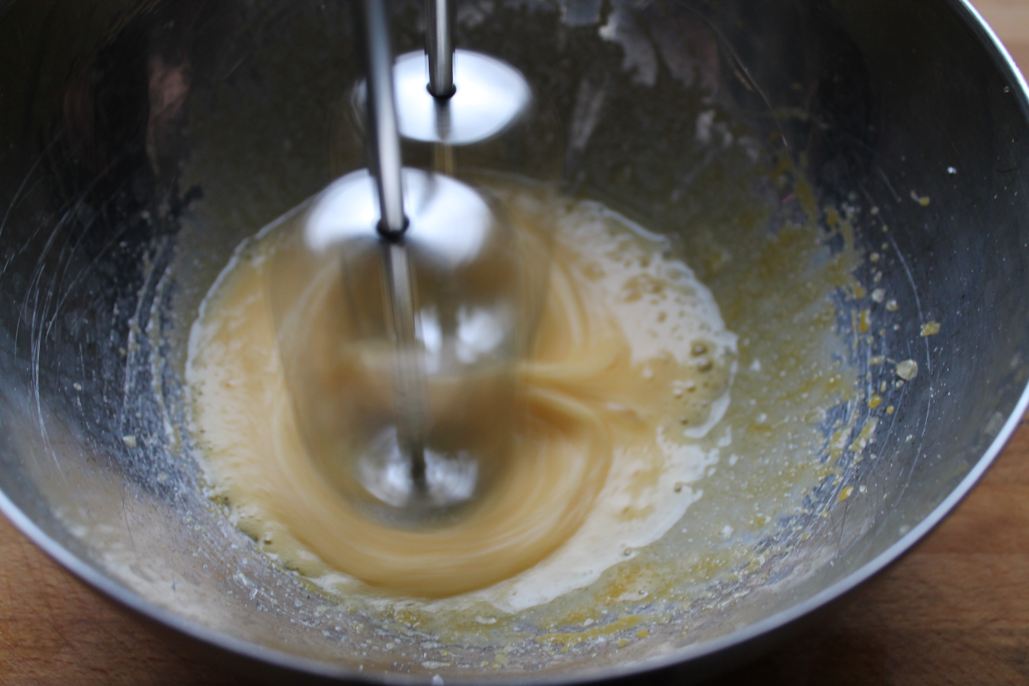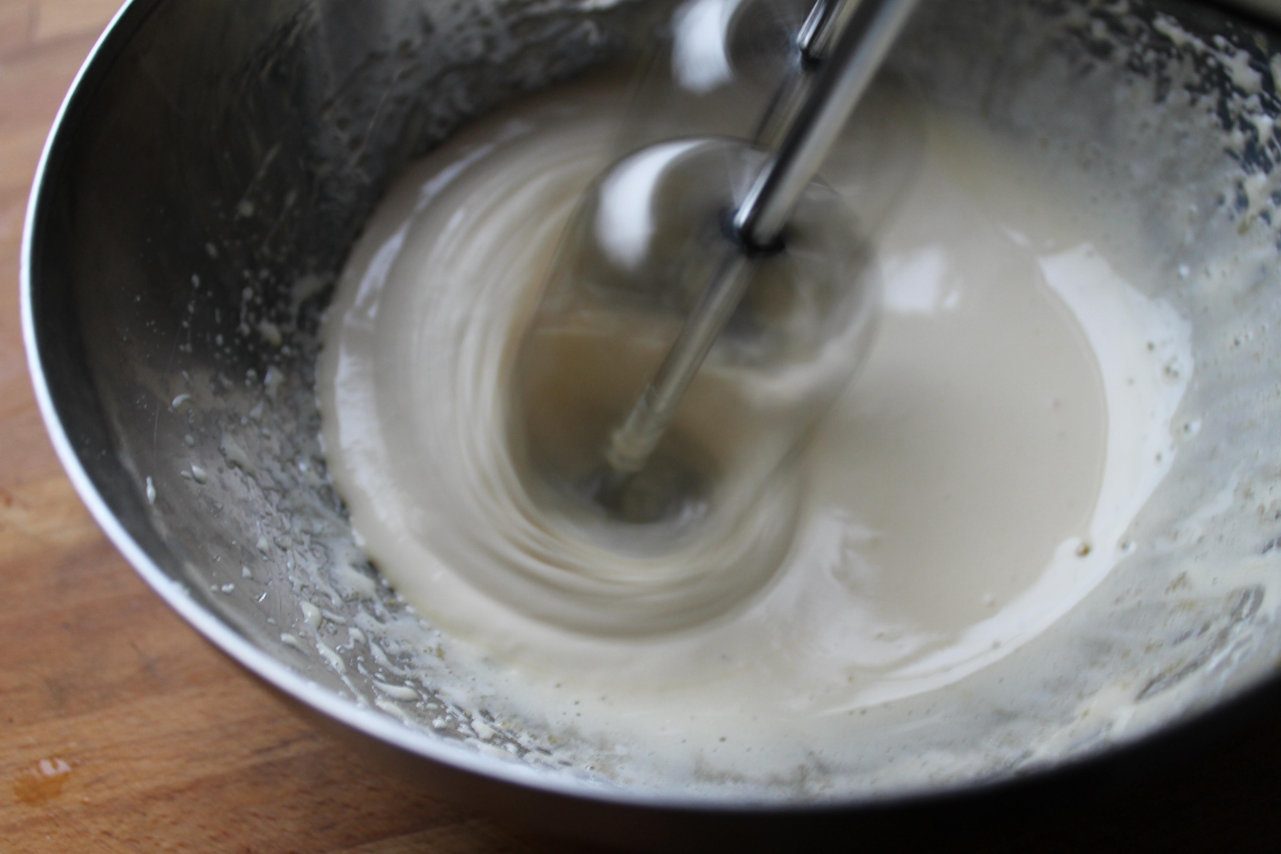 … og þeytti vel og lengi, þar til blandan var ljós og létt. Þá þeytti ég hálfri teskeið af vanilluessens saman við.