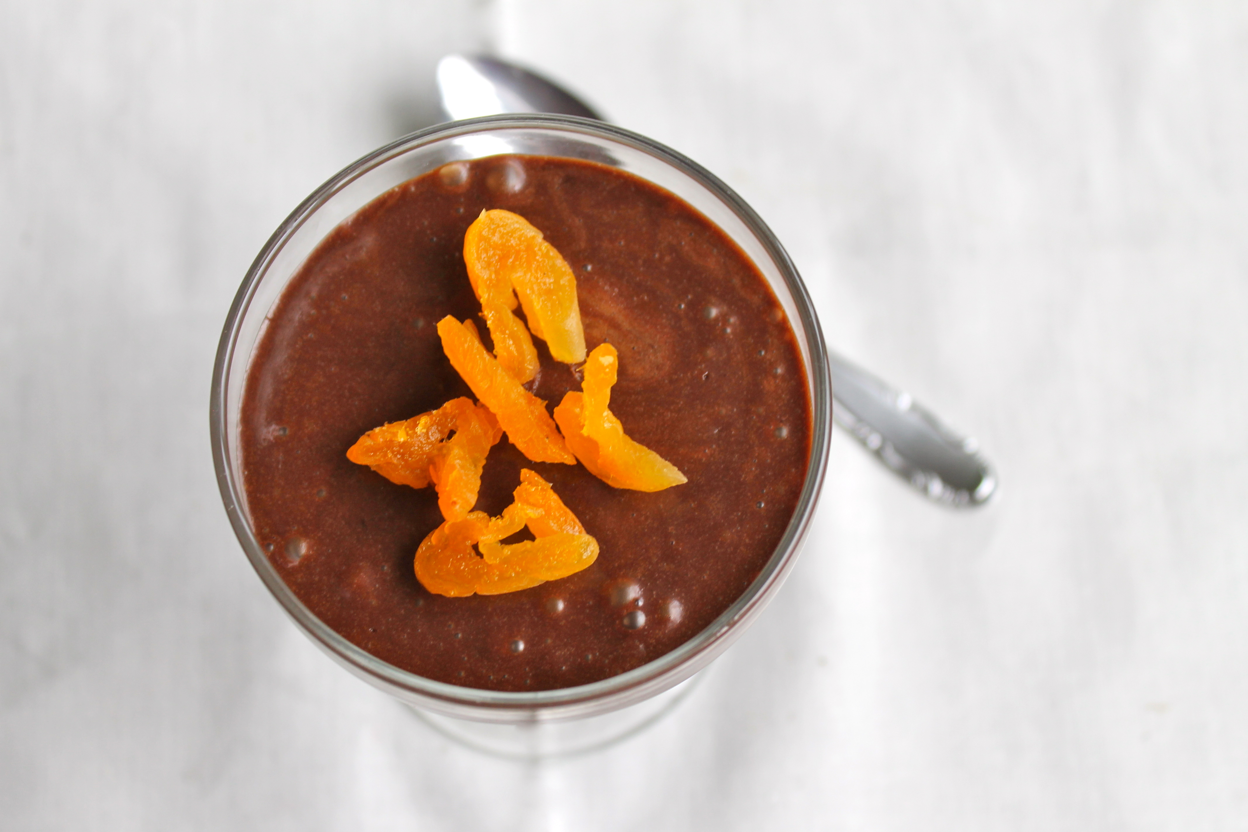 Það er hægt að borða búðinginn eintóman, kannski með rjómadoppu ofan á, en mér finnst bæði fallegra og betra að setja t.d. ávexti ofan á – hér er ég með nokkrar ræmur af þurrkaðri (en mjúkri) apríkósu en það mætti líka nota ýmis fersk ber, appelsínu- eða mandarínubita eða annað sem á vel við súkkulaði (og hvað á annars ekki vel við súkkulaði?). Eða eitthvert súkkulaðiskraut.