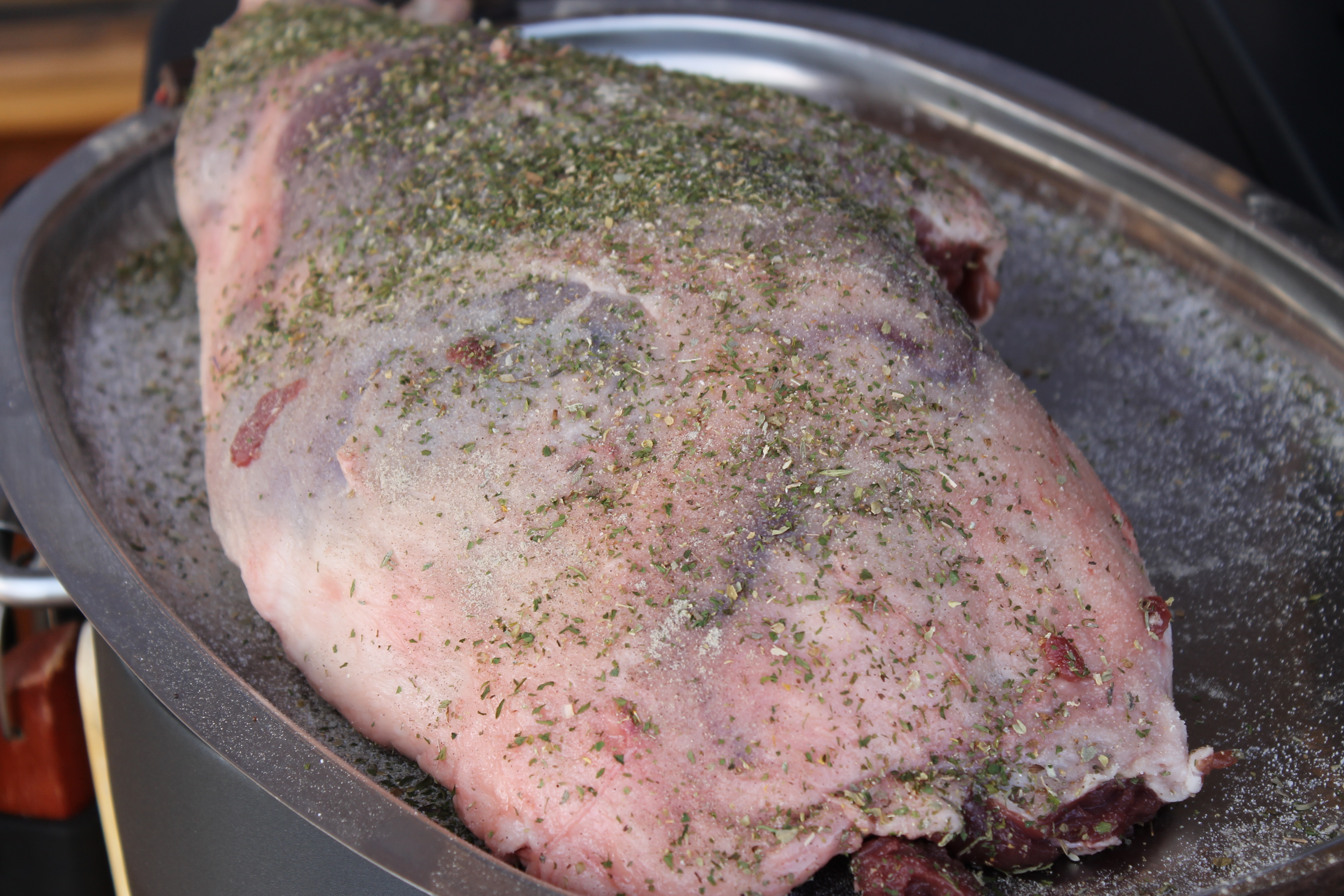 En allavega, á meðan systkini mín, mágar og mágkona stóðu sveitt með penslana upp í tröppum eða bogruðu við þröskulda og kepptust við að ljúka verkinu fór ég að undirbúa lærið, sem hafði verið tekið úr kæli upp úr hádegi. Þetta var vænsta læri, 3,3 kíló minnir mig, enda vorum við tíu í mat. – Sjálfsagt væri þetta ekki nóg kjöt fyrir suma en mín reynsla er nú sú að fólki hættir oft til að ofáætla hvað þarf af kjöti – ég kom að undirbúningi ættarmóts í fyrra þar sem einn frændi minn taldi að meðallæri dygði fyrir þrjá; ég sagði þeim að kaupa læri fyrir hverja 6-7 gesti en einhverjum fannst það of lítið og bætti þremur lærum við heildarmagnið. Þegar upp var staðið voru einmitt þrjú heil læri óskorin eftir.