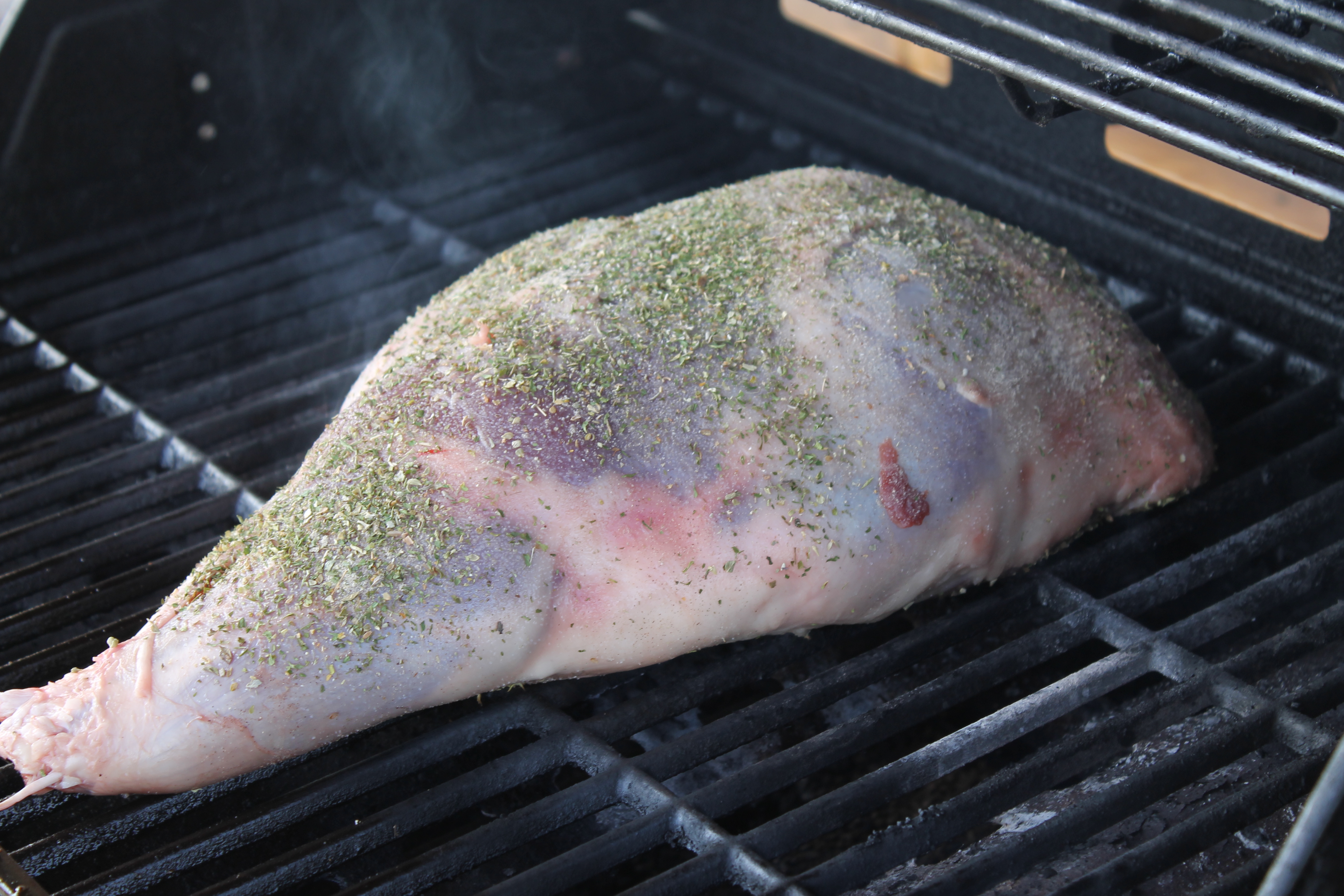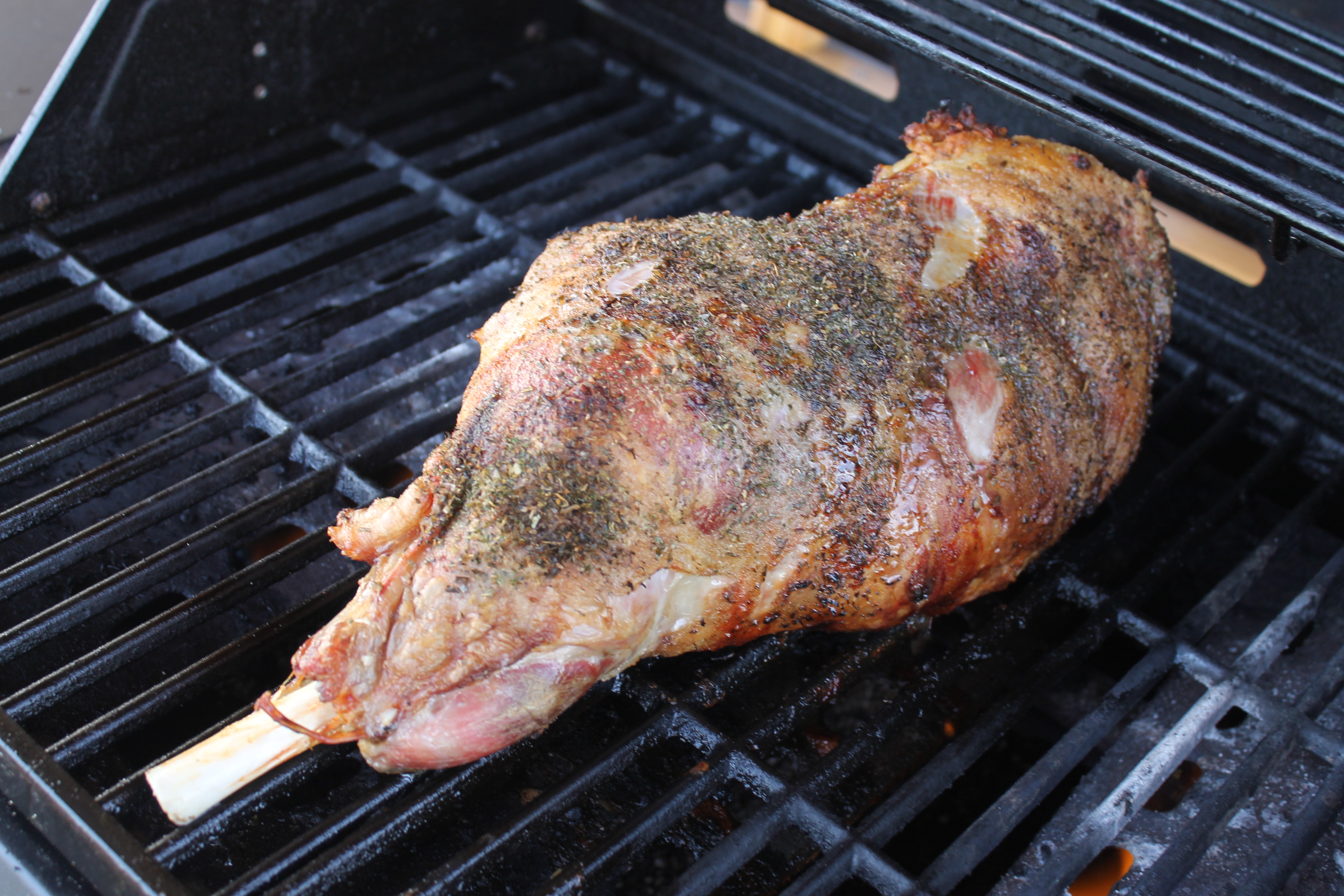 Ég leit á lærið eftir svona 20 mínútur, það var þegar farið að taka lit og leit vel út. En nokkru seinna, þegar ég leit á hitamælinn á lokuðu grillinu, sá ég að hann var kominn óeðlilega langt niður og loginn á brennurunum var orðinn mjög lítill. Gasið var að klárast en til allrar hamingju var varakútur til og þegar búið var að skipta hækkaði ég hitann þar til 200°C var náð og grillaði lærið áfram þar til rétt rúmur klukkutími var liðinn frá því að það fór á grillið … Var ekkert að fylgjast sérstaklega með því, vissi að það mundi passa sig sjálft. Og nei, það þarf ekki að snúa því eða neitt.