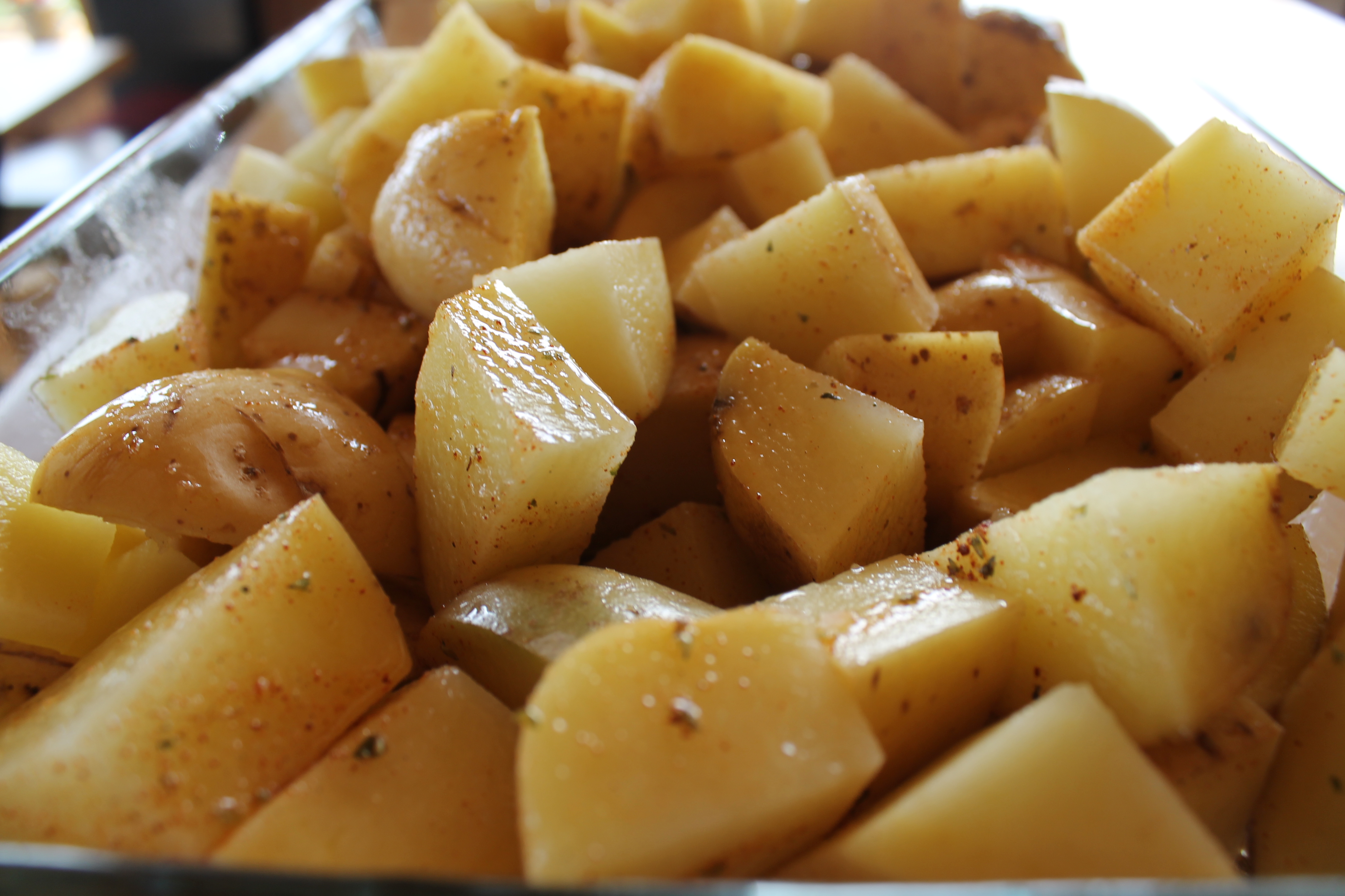 … en ég fór inn, hitaði ofninn í 200°C, skar 10 stórar bökunarkartöflur í bita og setti þær í stórt, eldfast mót, blandaði olíu, kartöflukryddi, timjani, pipar og salti saman í skál, hellti yfir, hrærði og setti kartöflurnar svo í ofninn. Steikti þær í svona 40 mínútur, hækkaði þá hitann og steikti í 10-15 mínútur í viðbót.
