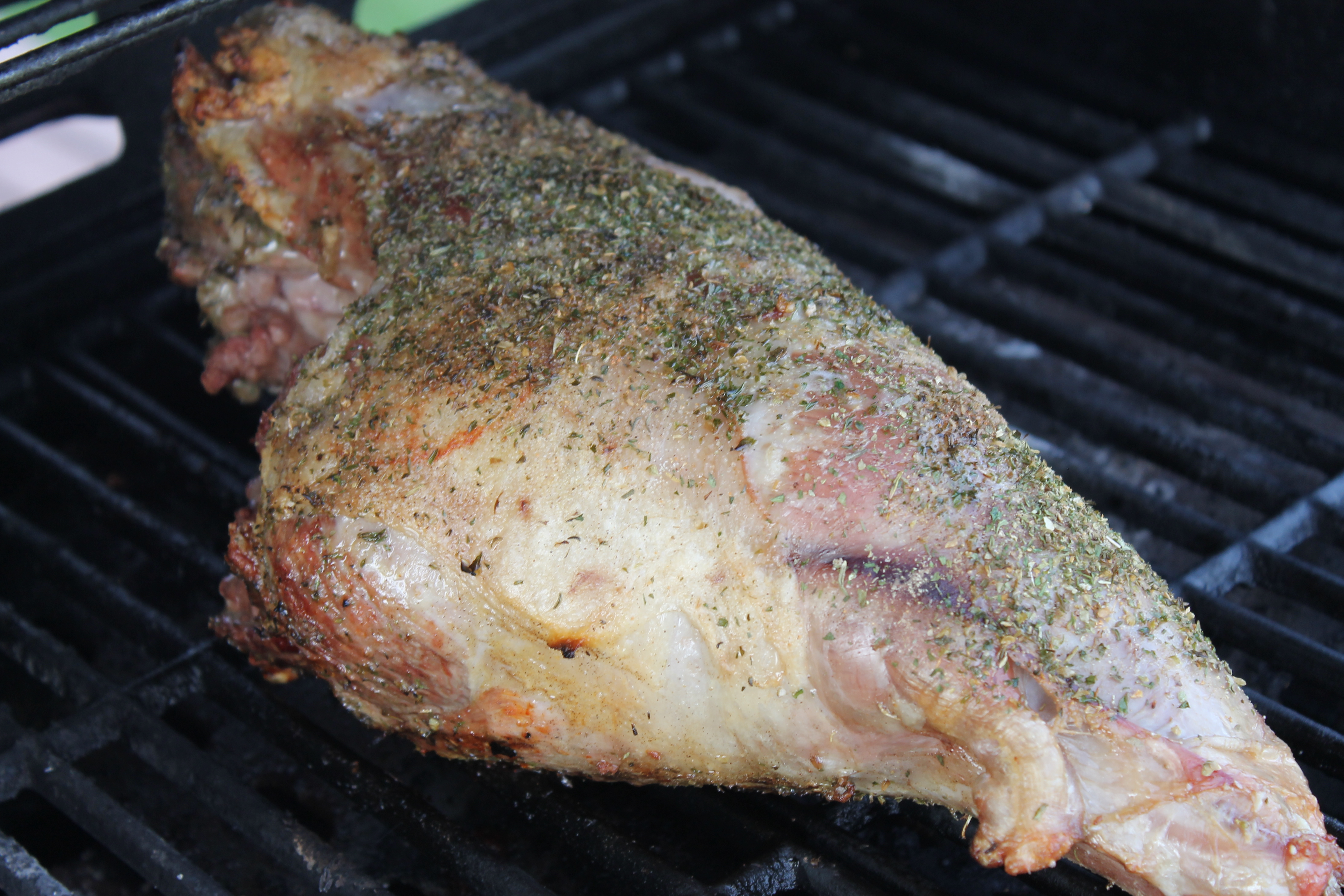 Ég athugaði hvað var að finna í kryddskápnum, blandaði saman Lamb Islandia frá Pottagöldrum, (svona 1 1/2 matskeið), 2 tsk af timjani, pipar og salti og kryddaði lærið vel með blöndunni. Lét það liggja á meðan ég hitaði grillið vel og hafði það lokað á meðan.