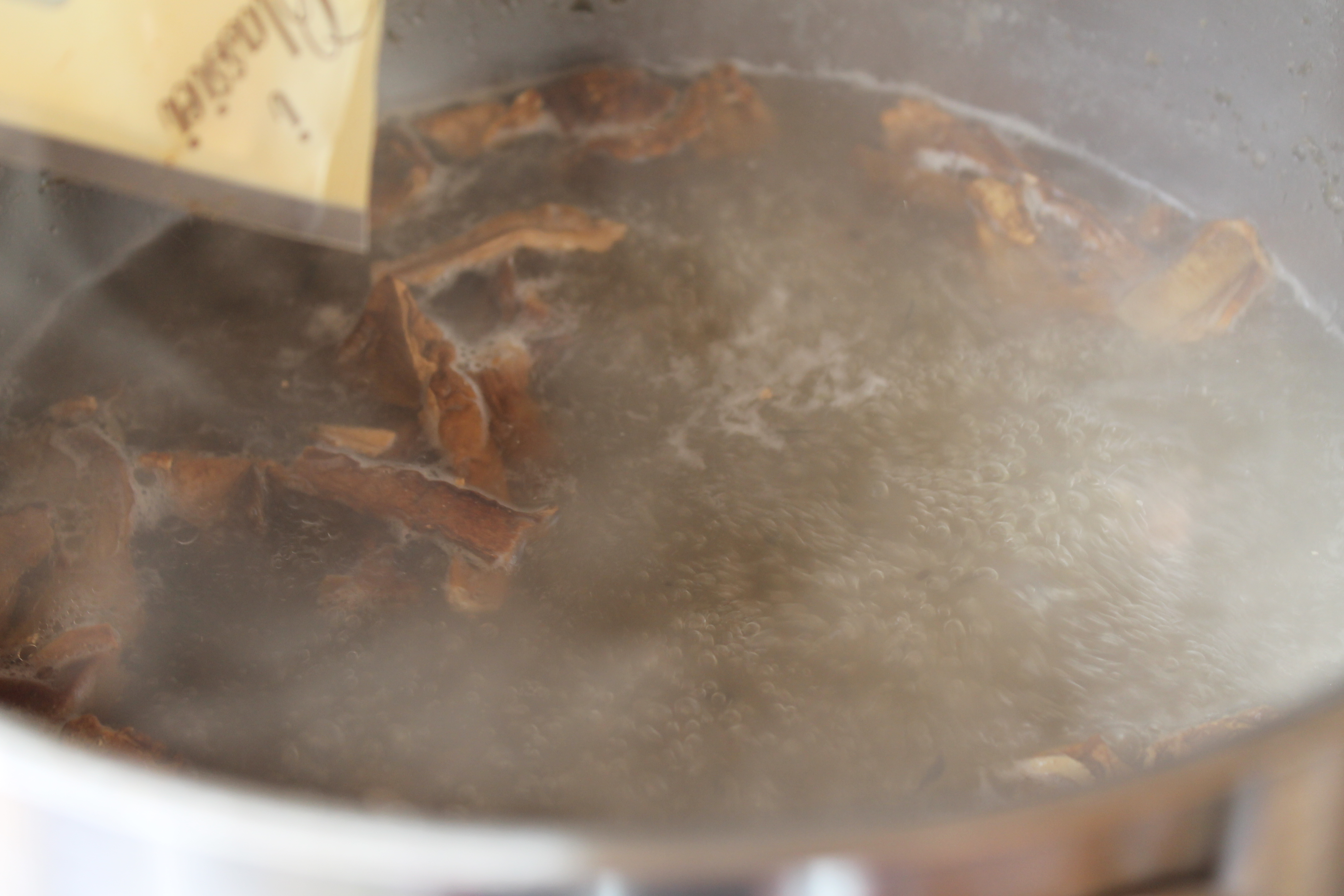 Ég hafði tekið beinið upp úr soðpottinum eftir 45 mínútur, smakkaði svo soðið, bætti við dálitlum kjötkrafti, setti svo lófafylli af þurrkuðum sveppum (ég átti ítalska kóngssveppi) út í og lét sjóða smástund. Bætti svo 250 ml af rjóma út í og lét malla í svona 10 mínútur. Bragðbætti sósuna með pipar og salti og þykkti hana með sósujafnara. Jú, og svo notaði ég nú sósulit.