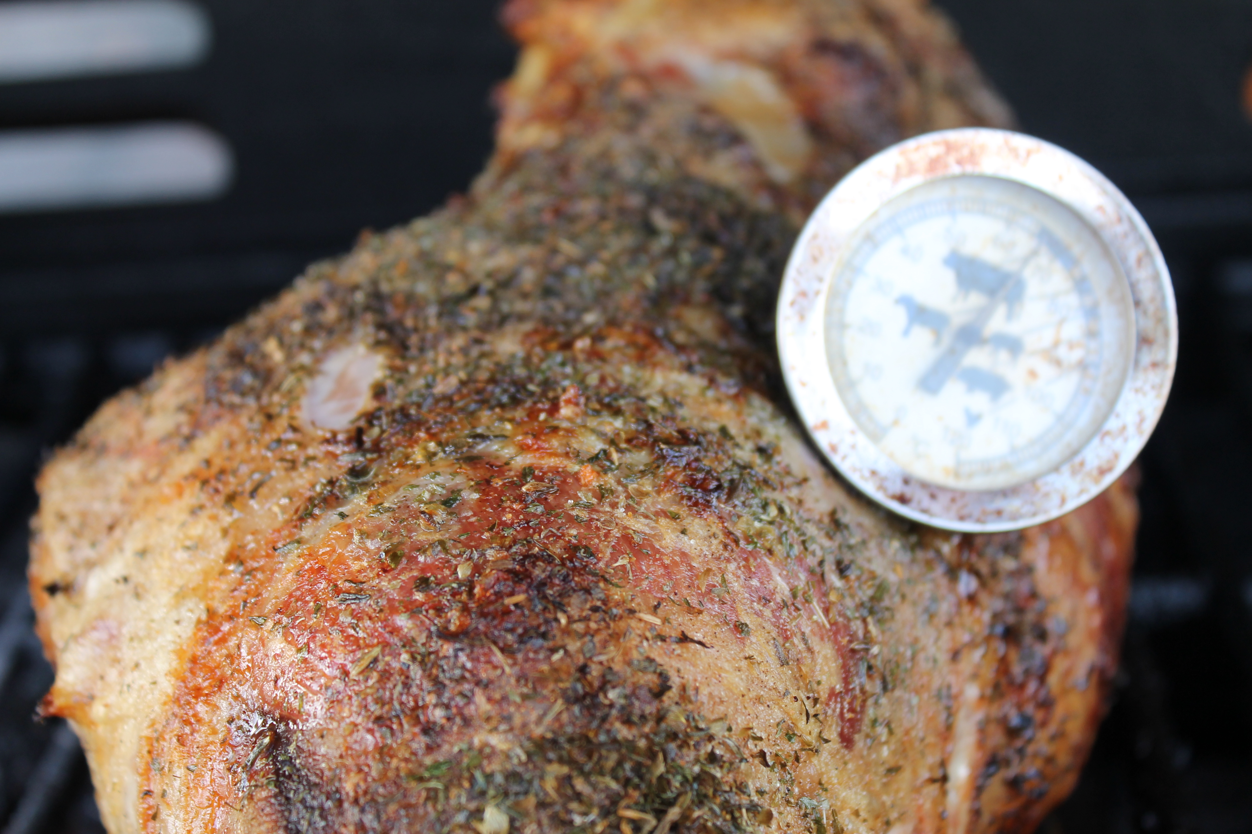 Ég slökkti svo á brennaranum í miðið (þeir eru þrír), setti lærið þar á og lokaði grillinu. Lækkaði hitann á hinum brennurunum dálítið. Hitamælirinn sýndi minnir mig hátt í 300°C þegar ég slökkti en lækkaði fljótt í 200°C. Ég ætlaði að halda honum í 180°-200°C allan tímann (auðvelt að hafa stjórn á hitanum því vindkæling var lítil) en það tókst ekki alveg eins og segir frá bráðum …